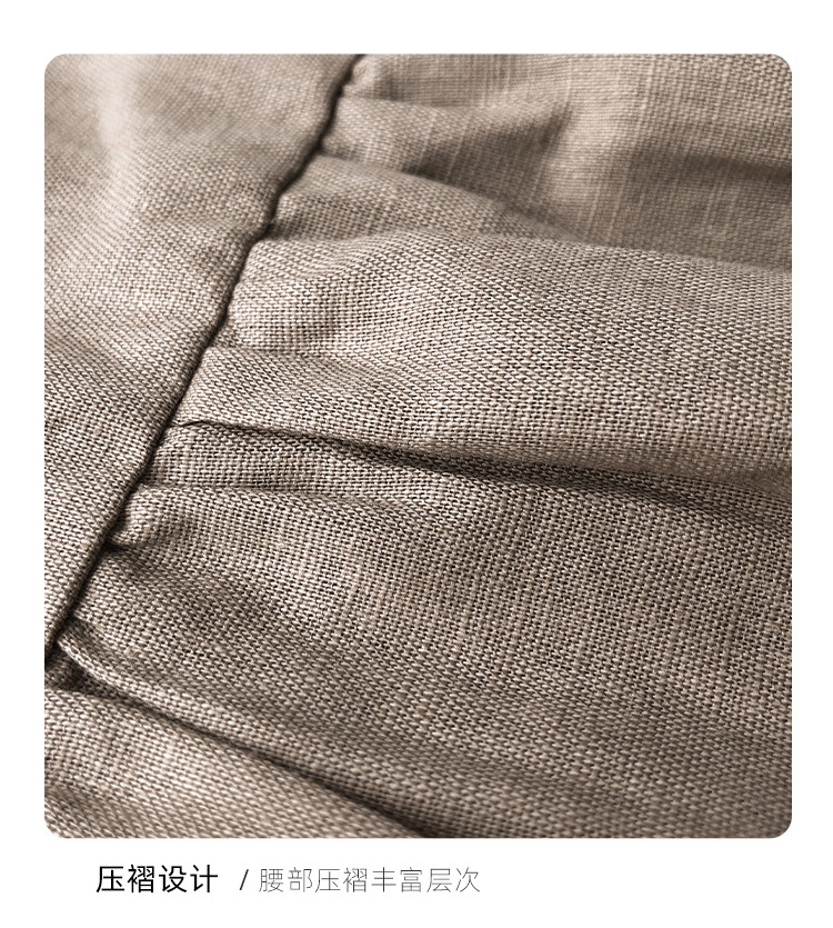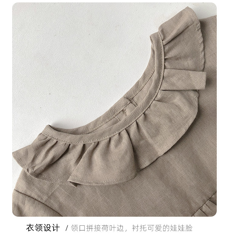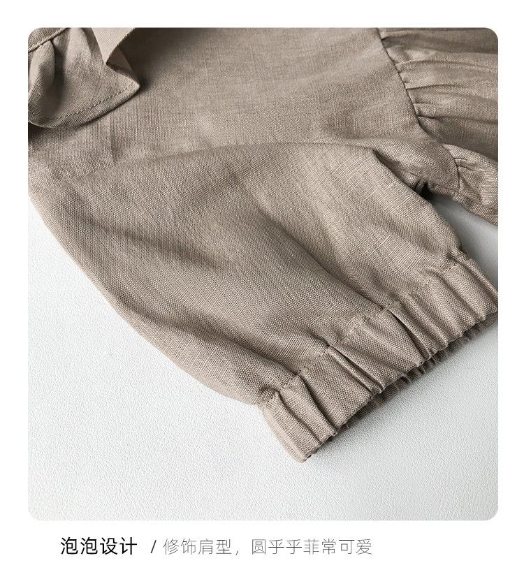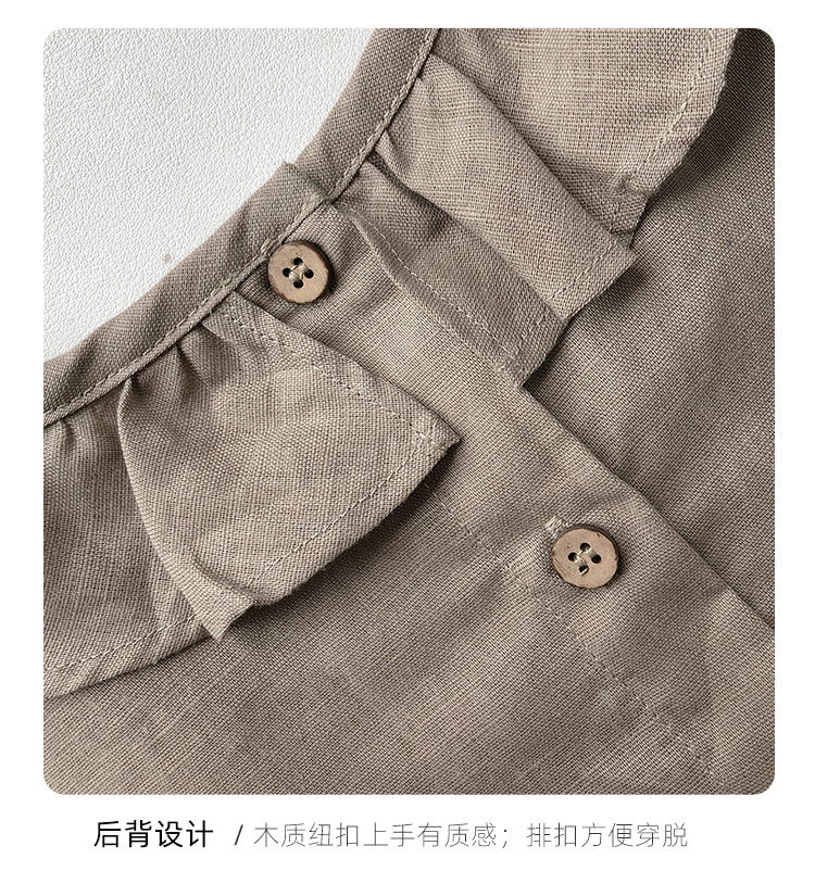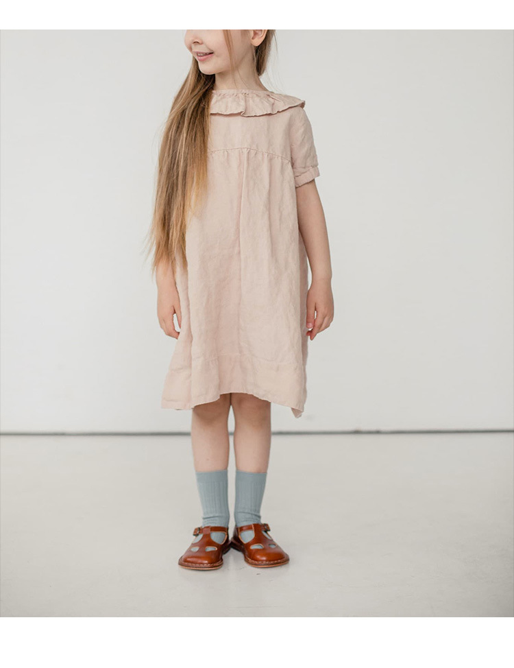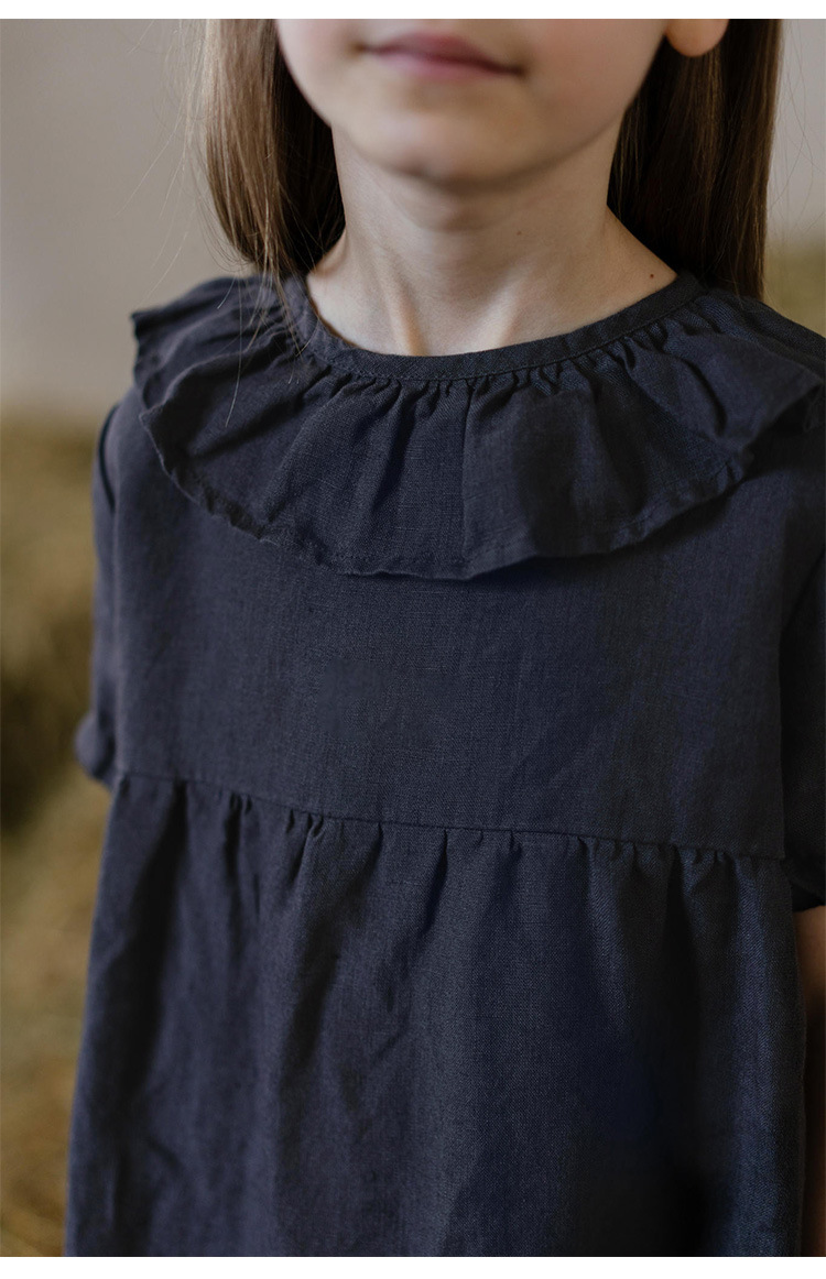 여름면 및 린넨 아동복 러플 크루 넥 허리 주름 스커트 백 나무 싱글 브레스트 버블 슬리브 원피스