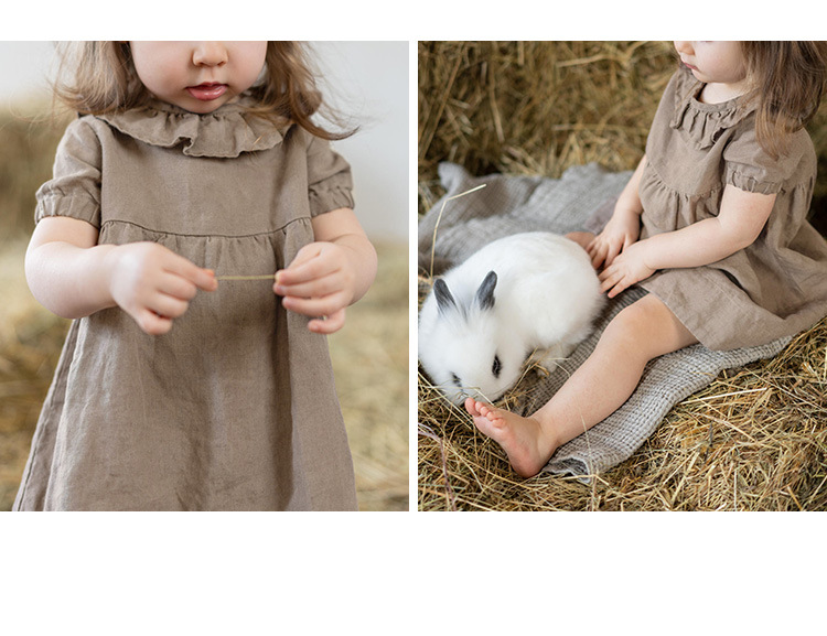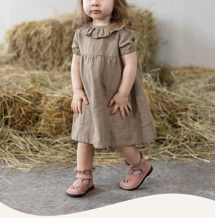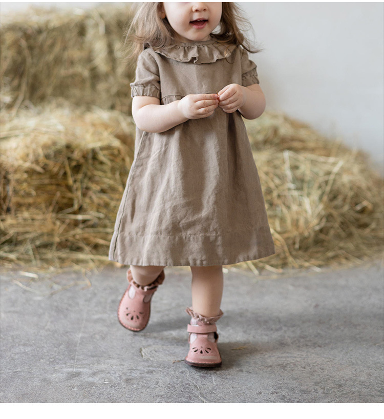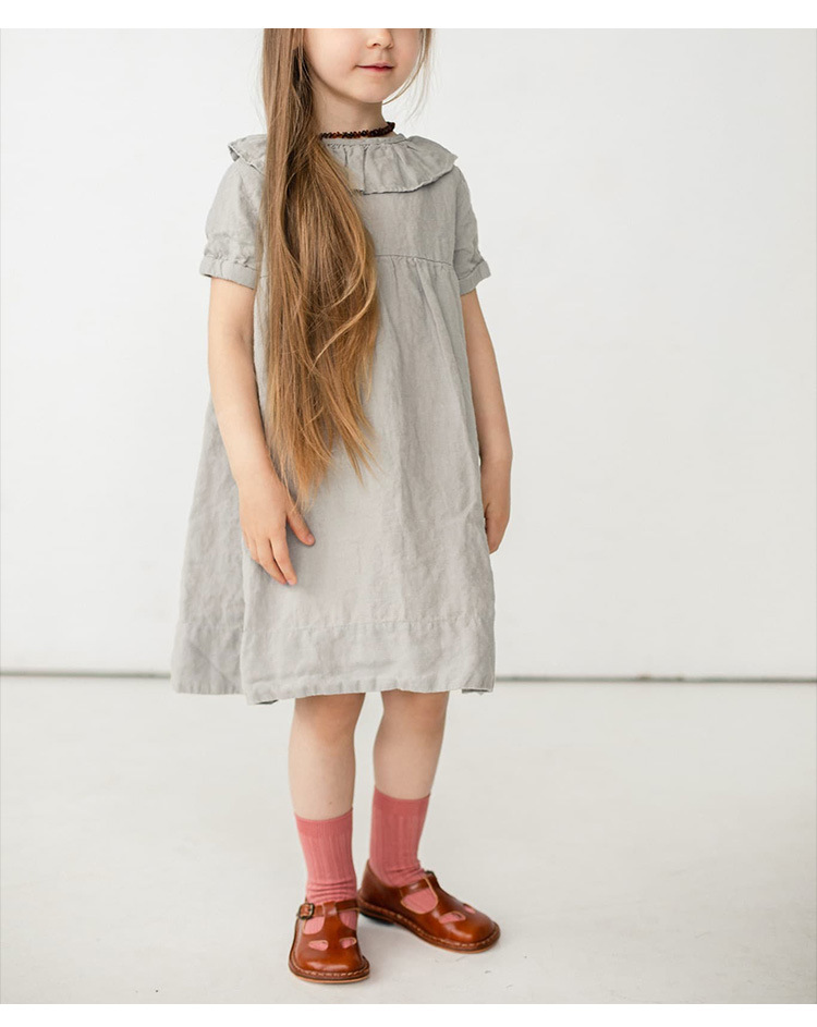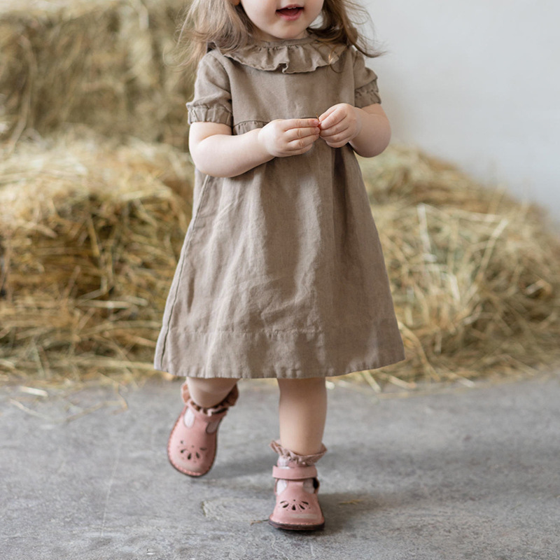 여름면 및 린넨 아동복 러플 크루 넥 허리 주름 스커트 백 나무 싱글 브레스트 버블 슬리브 원피스스토어 가기