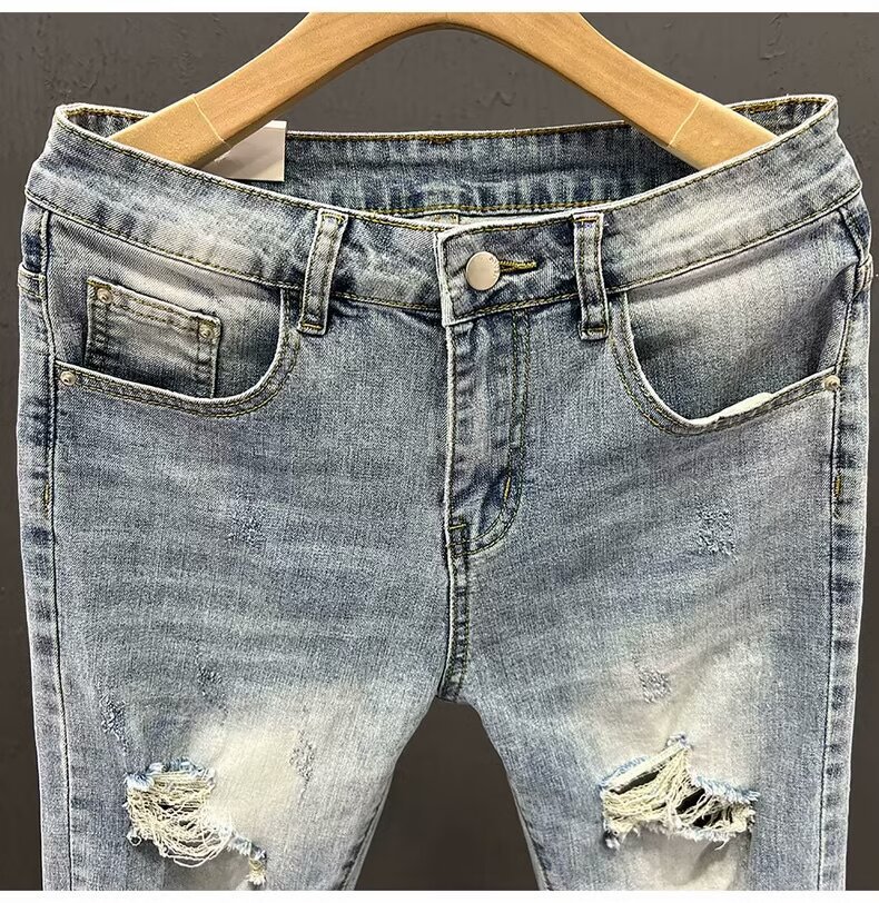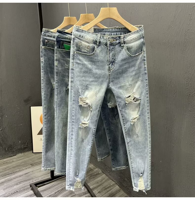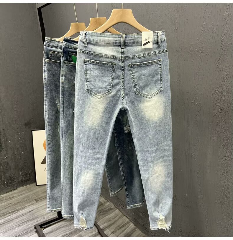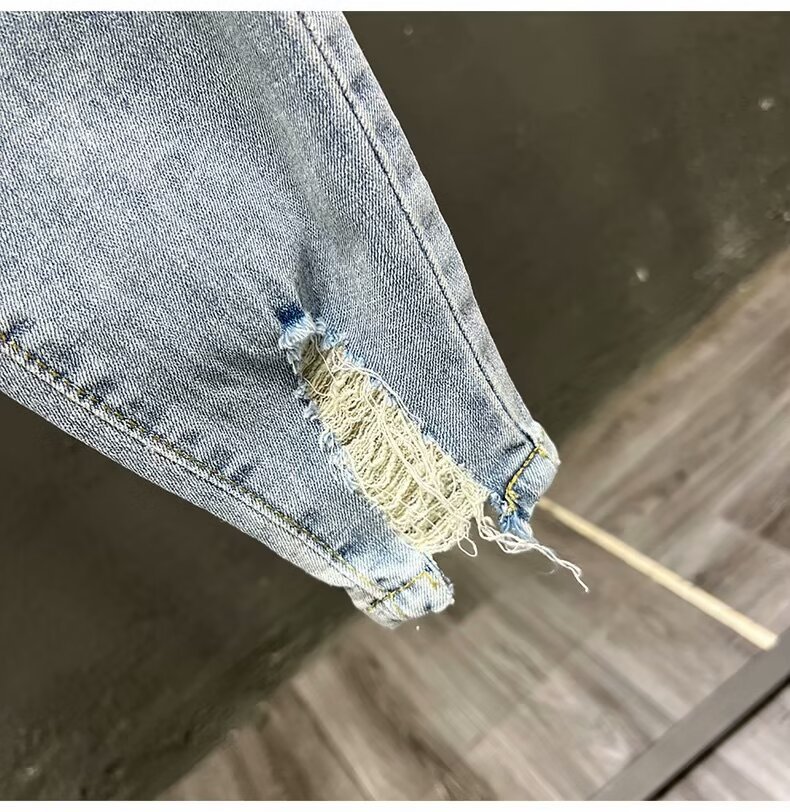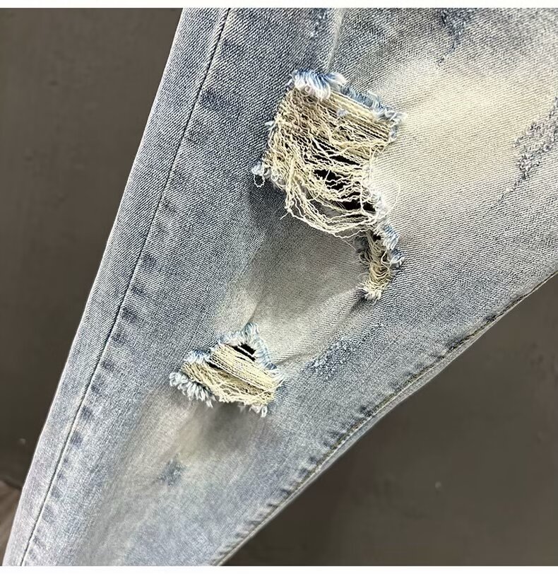 자른 찢어진 청바지 남자 2024 새로운 스트레이트 느슨한 미국 스타일 하이 스트리트 남자 바지 유행 브랜드 작은 발 드레스스토어 가기