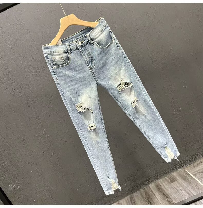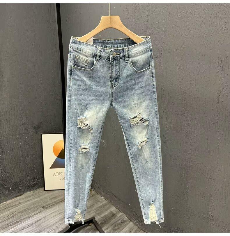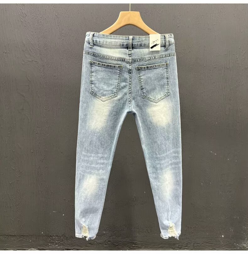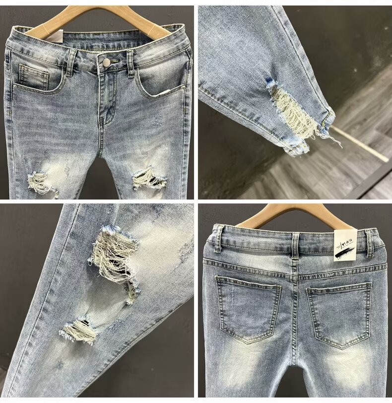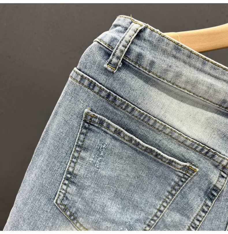 자른 찢어진 청바지 남자 2024 새로운 스트레이트 느슨한 미국 스타일 하이 스트리트 남자 바지 유행 브랜드 작은 발 드레스스토어 가기
