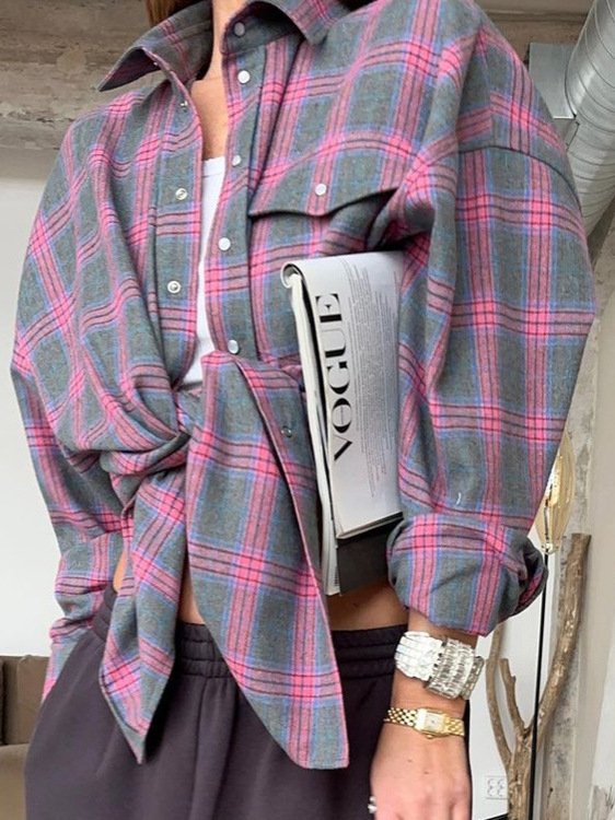 아마존 오존 국경 간 블라우스 레트로 스타일 느슨한 2025 봄 가을 겨울 격자 무늬 긴 소매 포켓 셔츠