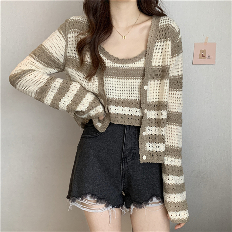 2025년 신상 프렌치 레트로 숏탑 끈이 있는 투피스 스트라이프 니트 가디건 여성용 가을 겨울 외출복 세트
