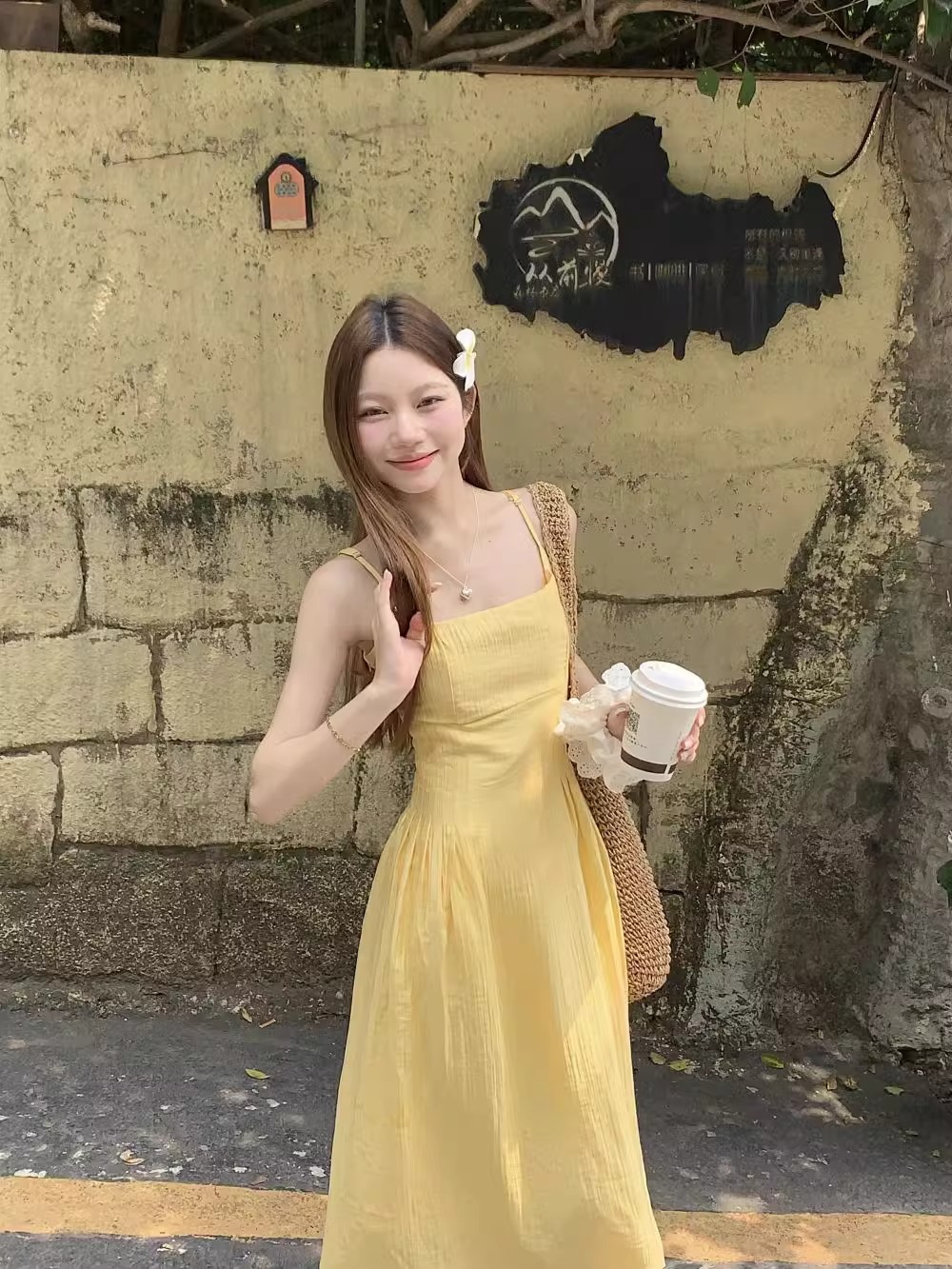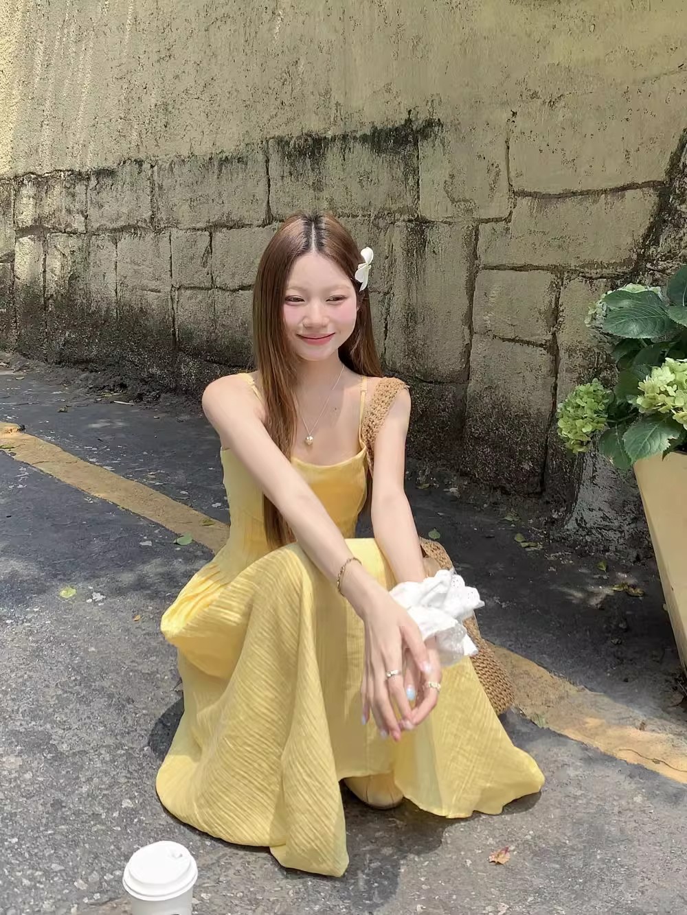 프랑스 스타일 작은 노란색 슬링 원피스 여성 의류 여름 새로운 허리 우아한 긴 원피스 해변 휴일 스커트스토어 가기