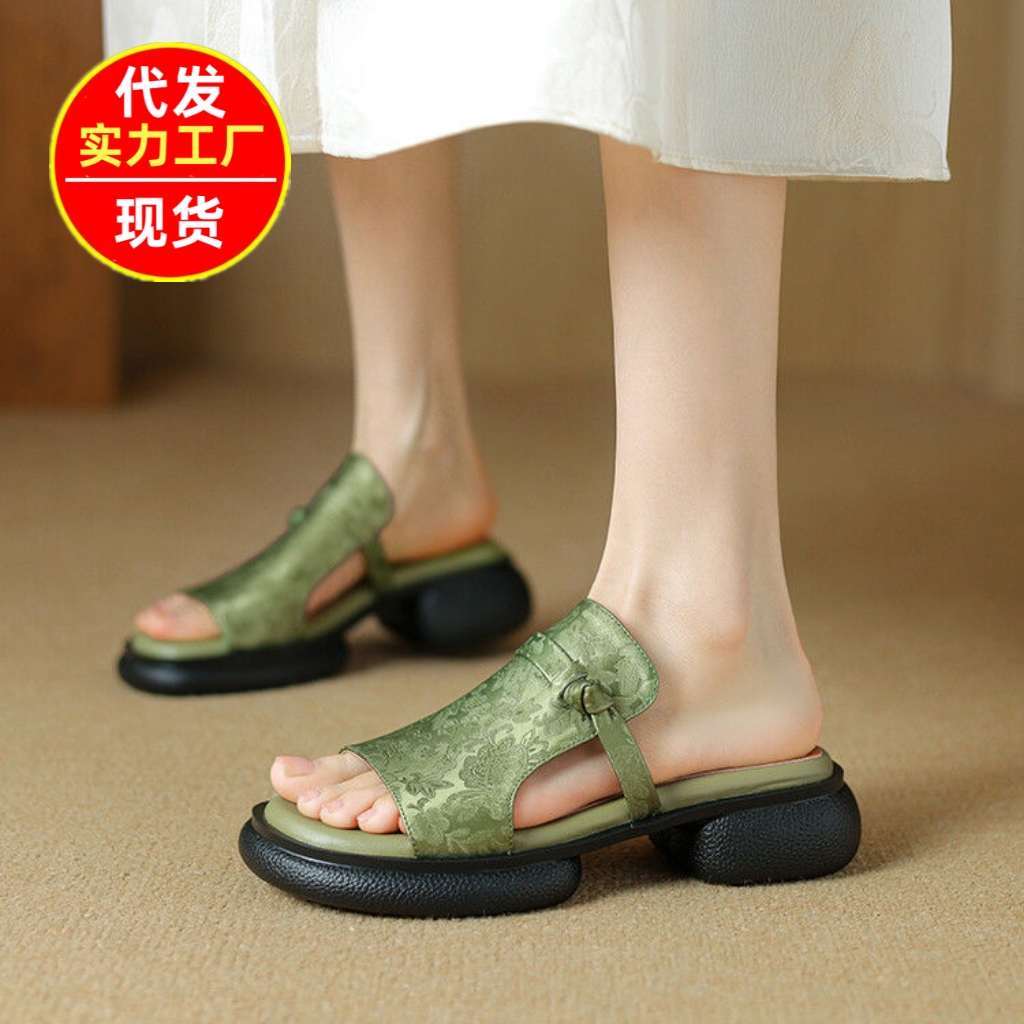 새로운 중국 스타일 국가 스타일 수 놓은 두꺼운 바닥 슬리퍼 여성 외부 착용 2024 유행 새로운 거친 뒤꿈치 샌들 여성의 편안한 패션스토어 가기