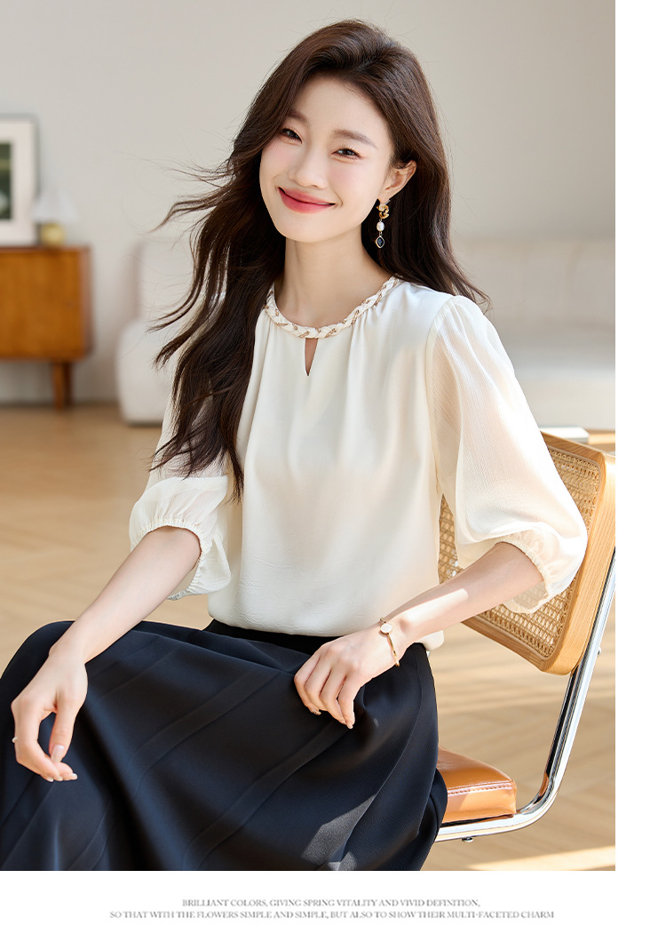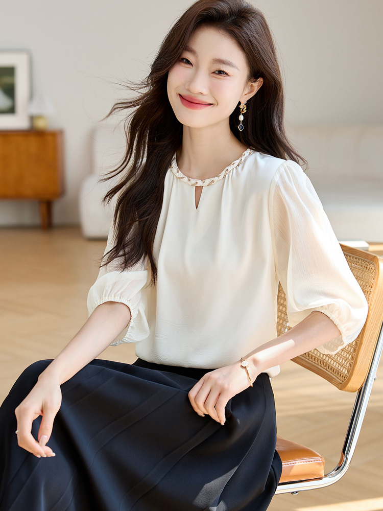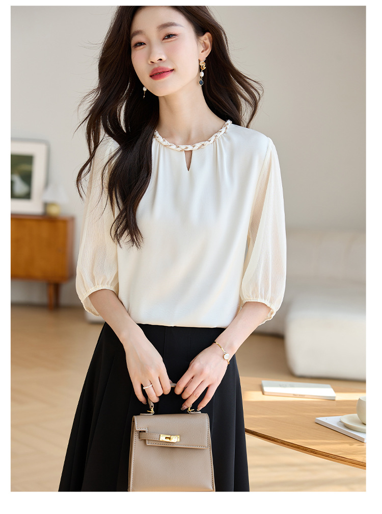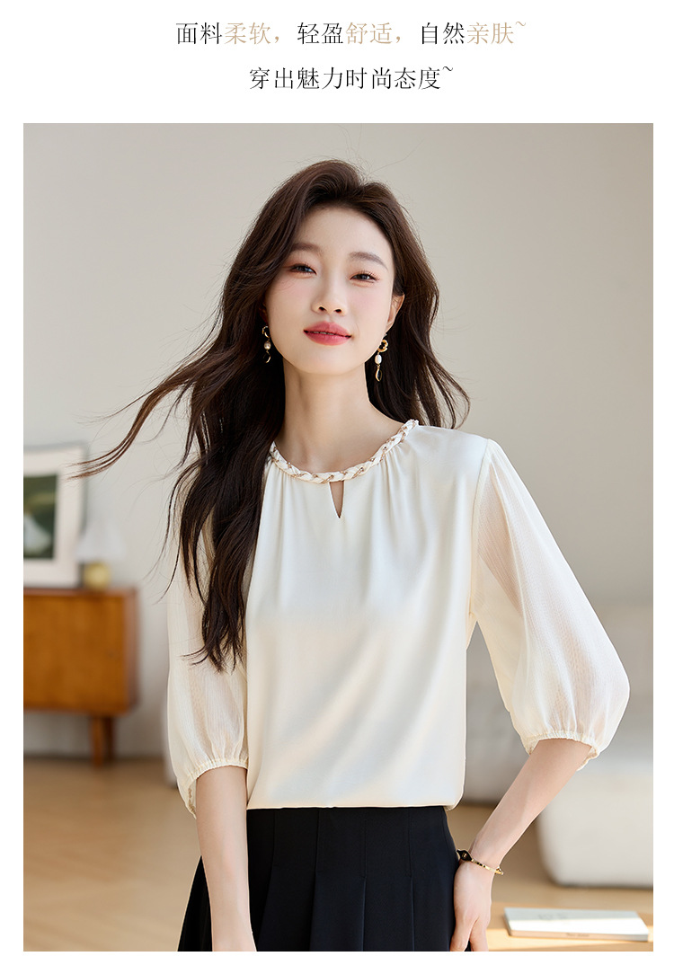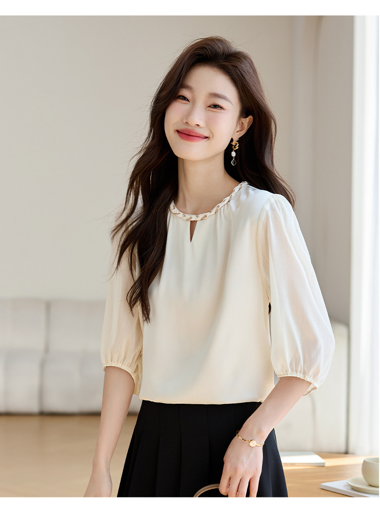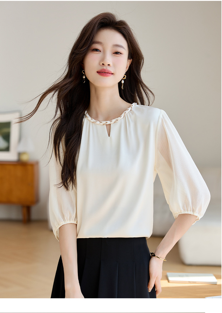 2024 년 여름 새로운 라운드 넥 우아한 느슨한 배꼽 덮음 쉬폰 셔츠 여성용 하프 슬리브 패션 탑스토어 가기