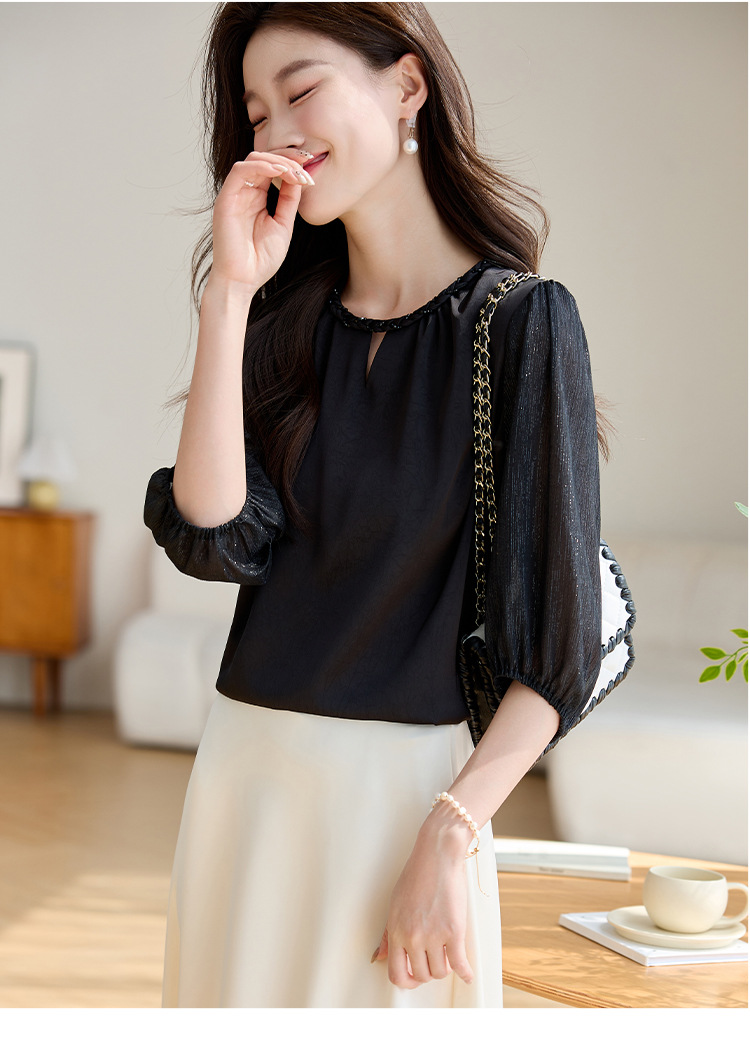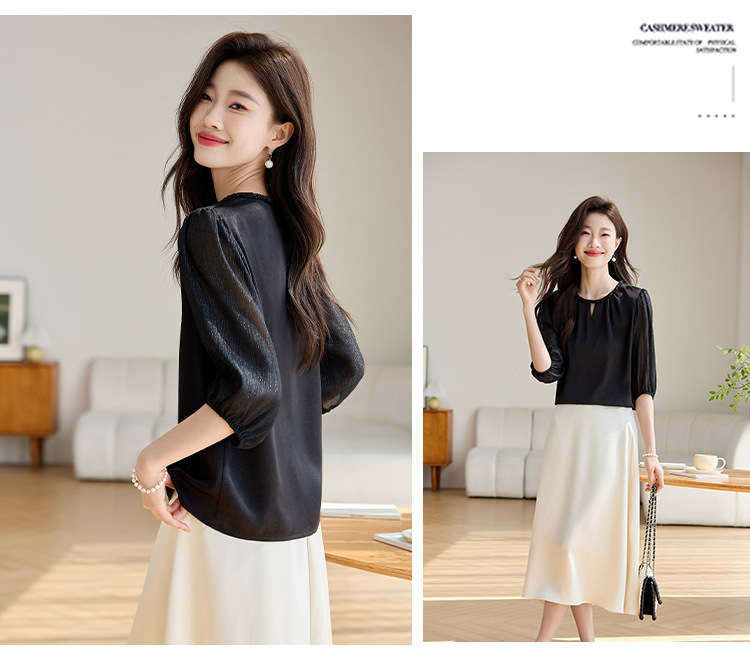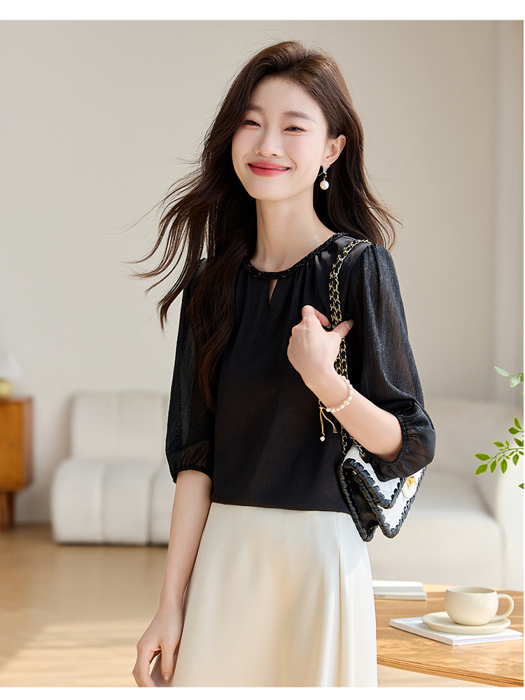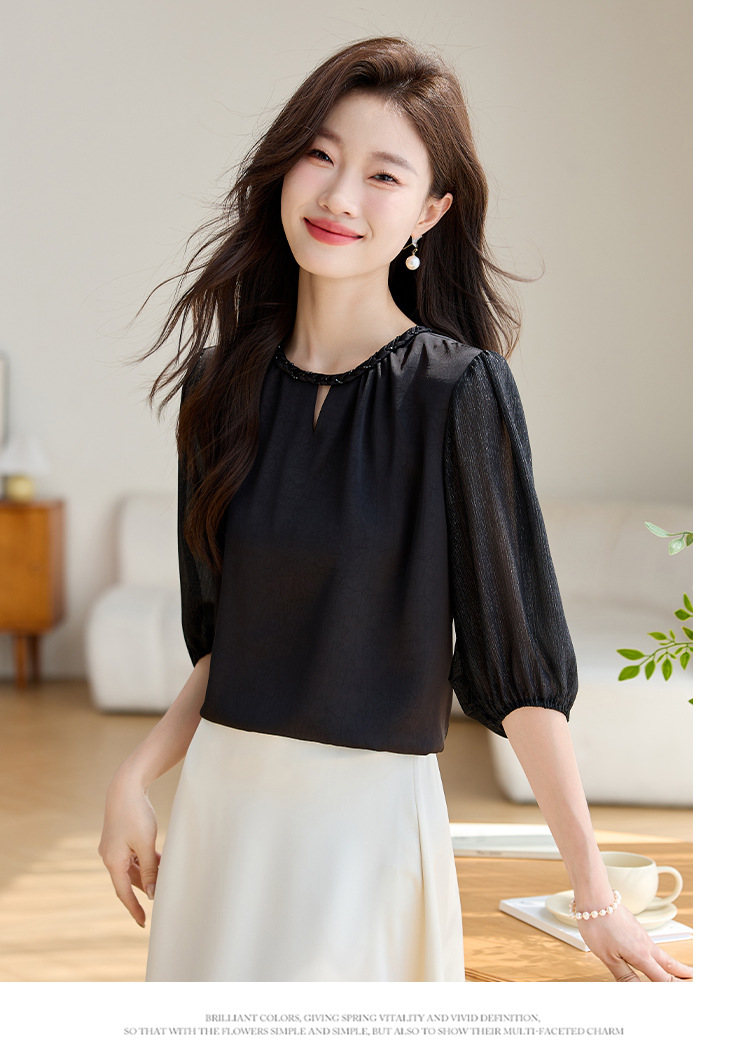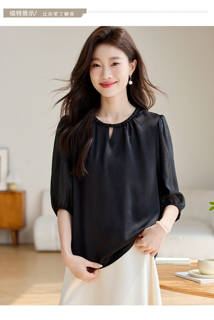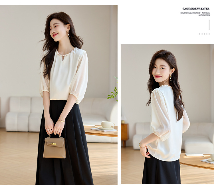 2024 년 여름 새로운 라운드 넥 우아한 느슨한 배꼽 덮음 쉬폰 셔츠 여성용 하프 슬리브 패션 탑스토어 가기