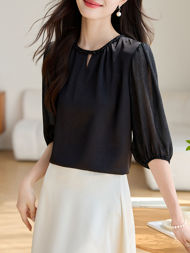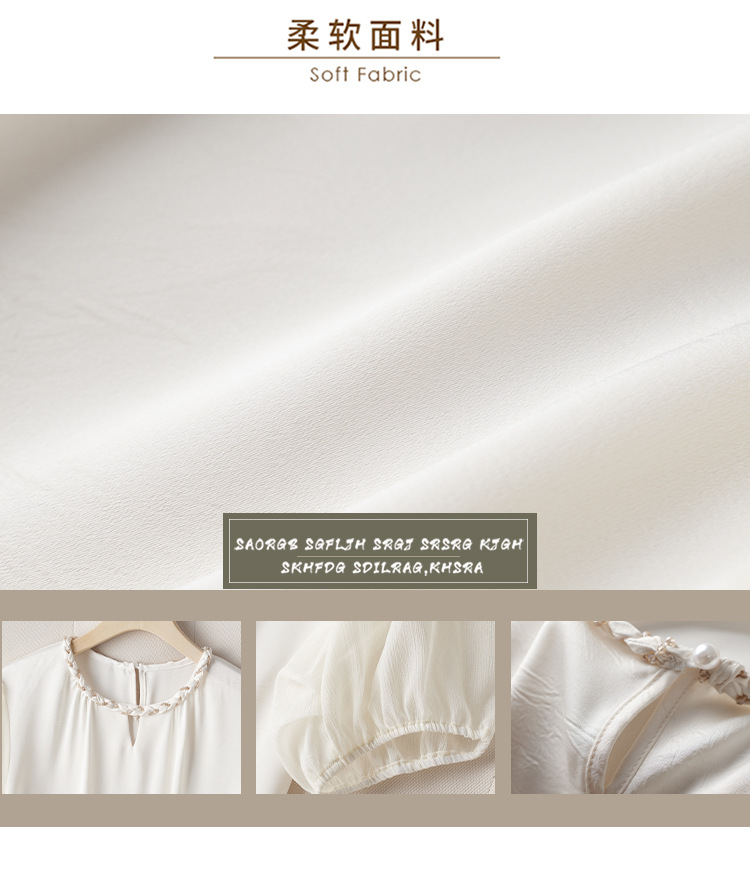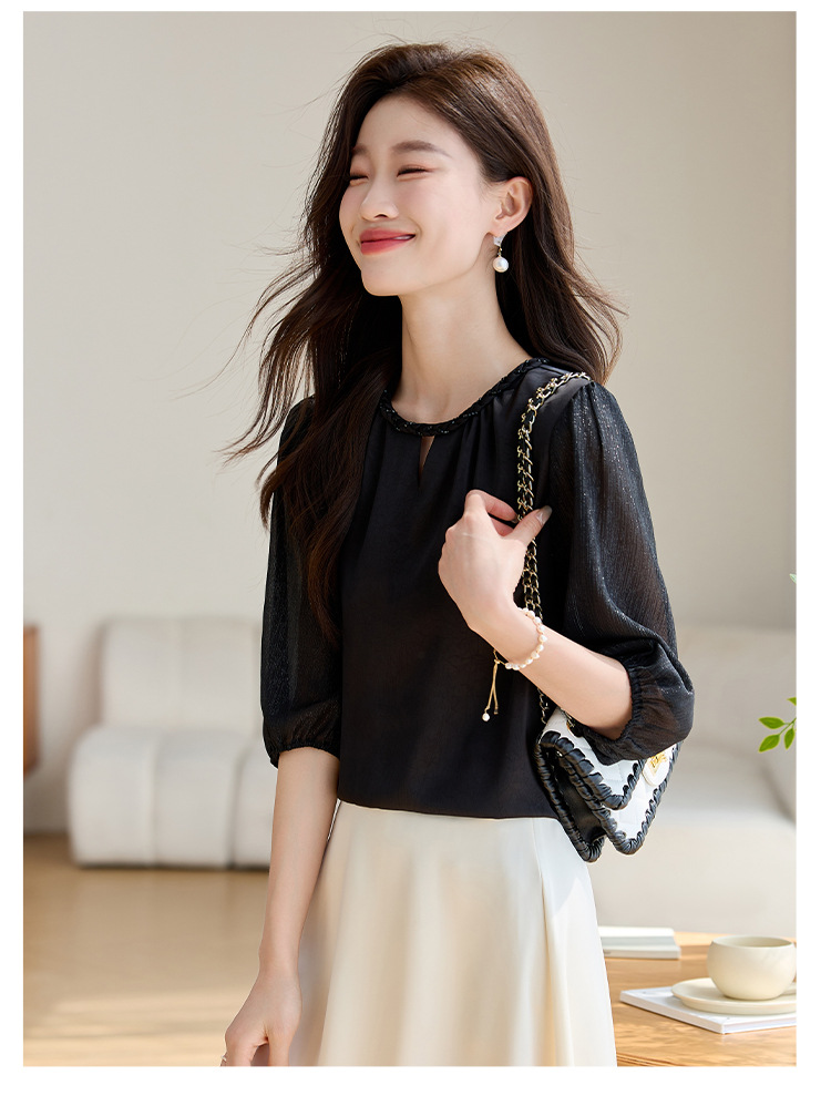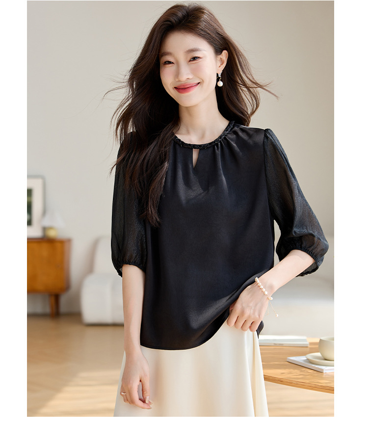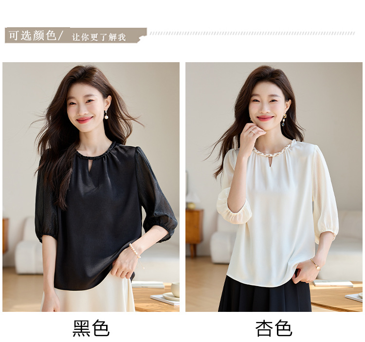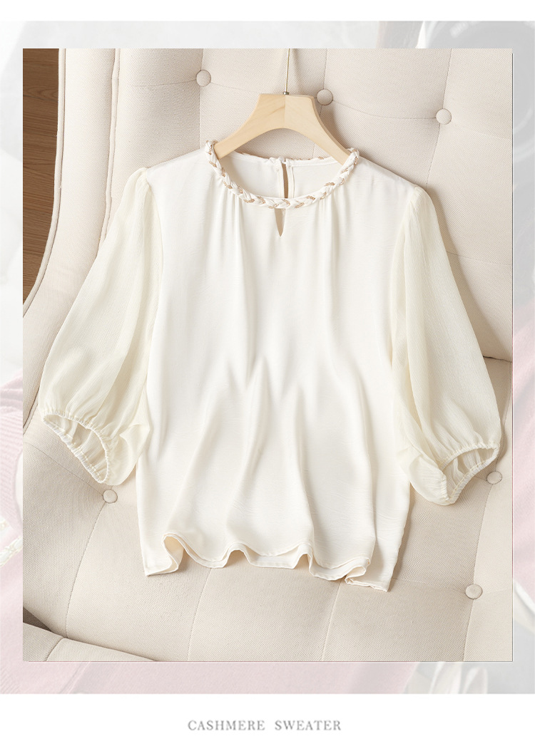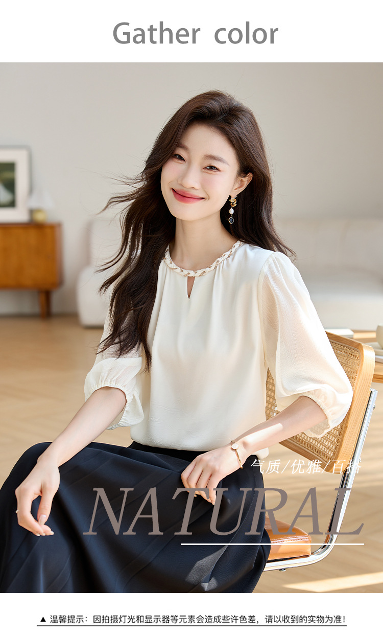 2024 년 여름 새로운 라운드 넥 우아한 느슨한 배꼽 덮음 쉬폰 셔츠 여성용 하프 슬리브 패션 탑