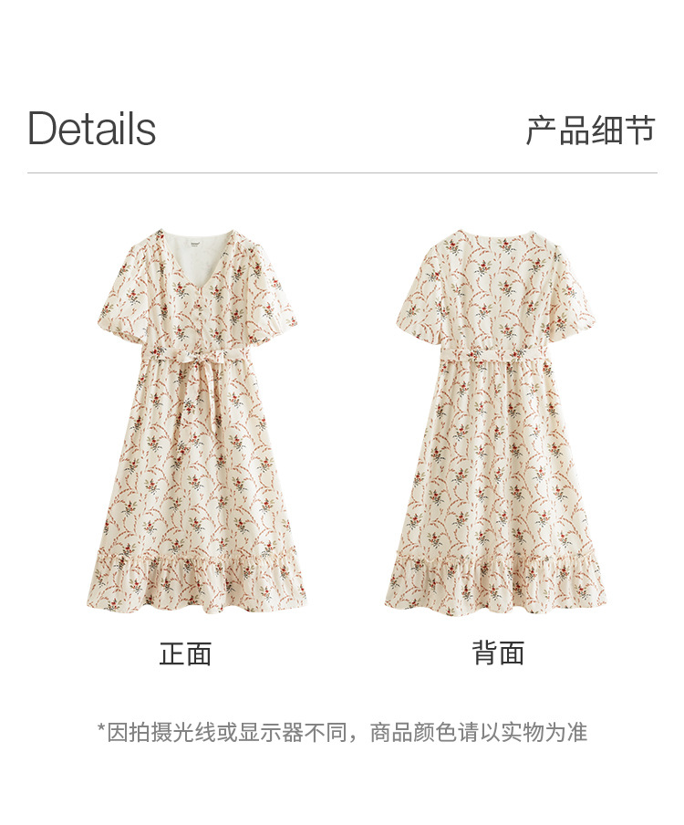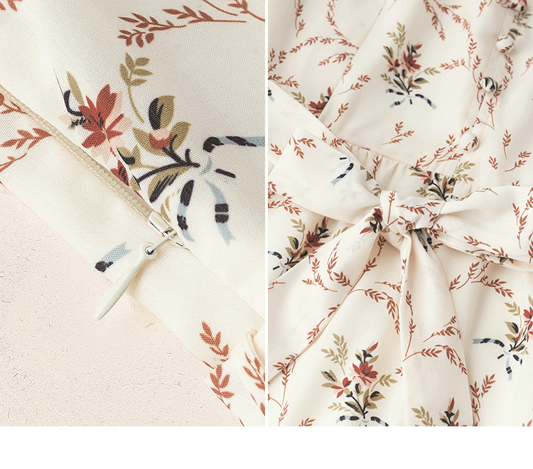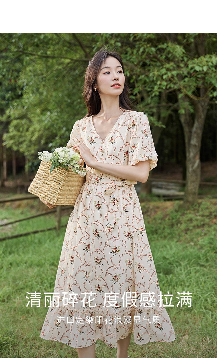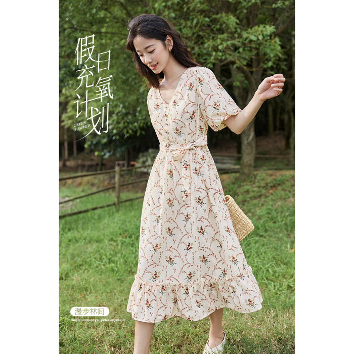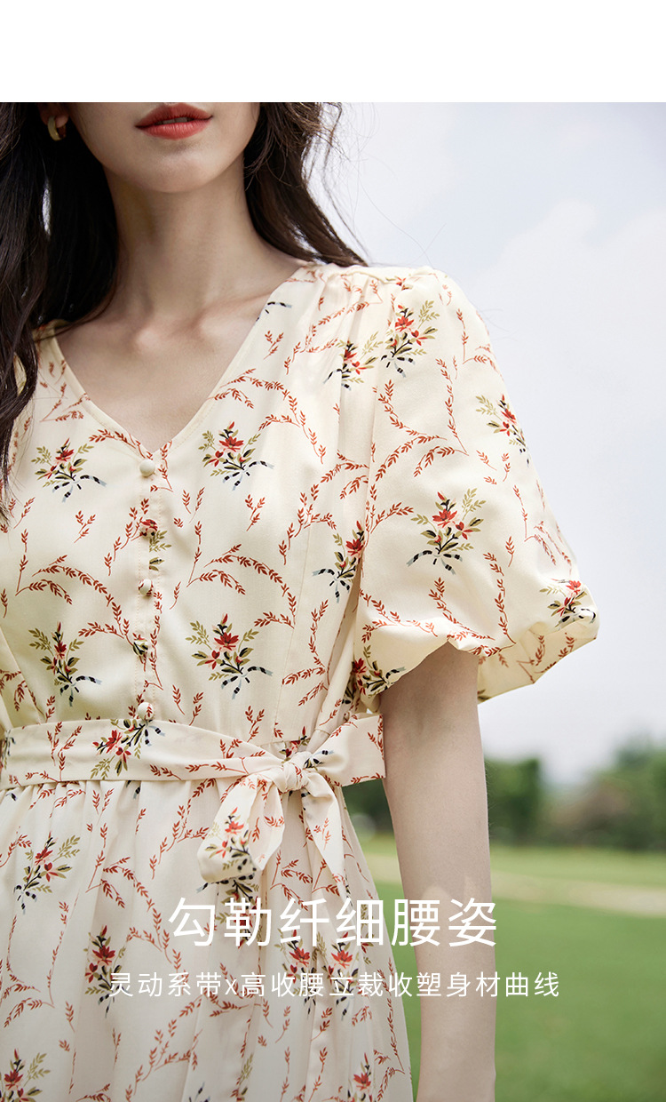프랑스 스타일 우아한 원피스 여름 새로운 여성 퍼프 슬리브 V 넥 타이트 허리 레트로 꽃 우아한 미디 원피스