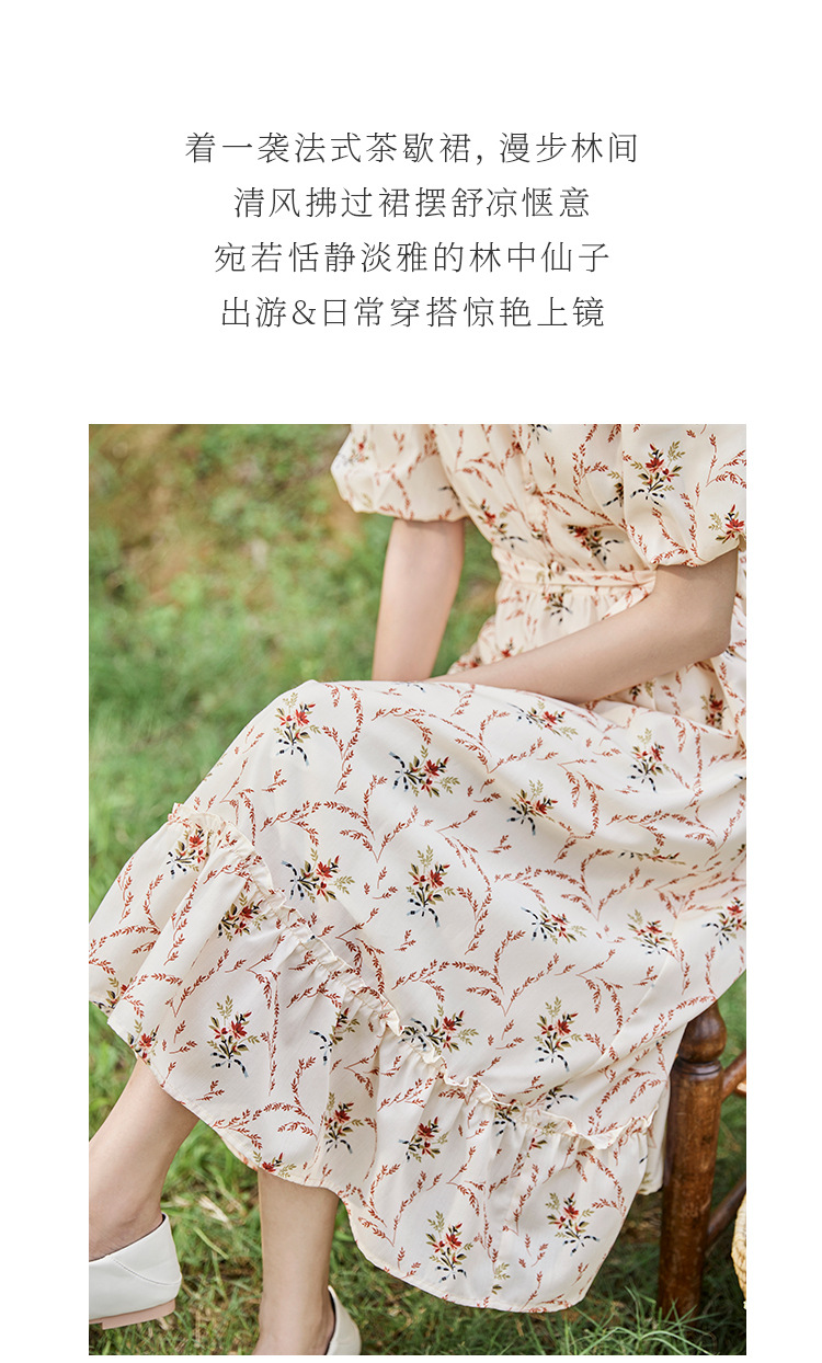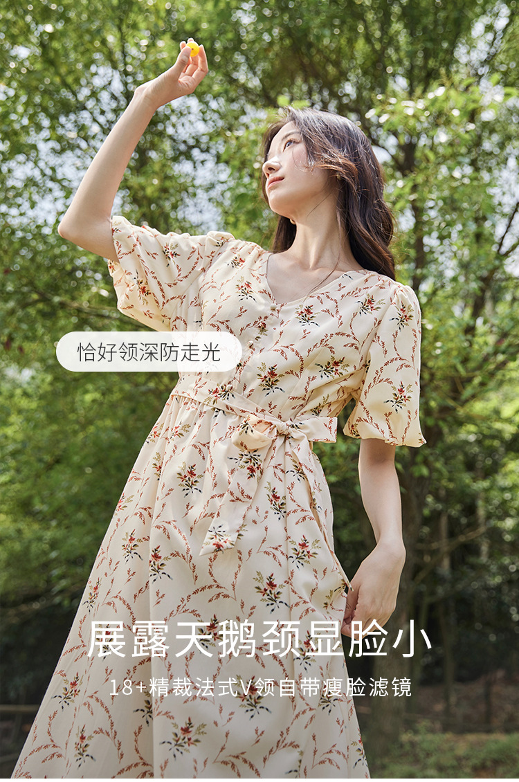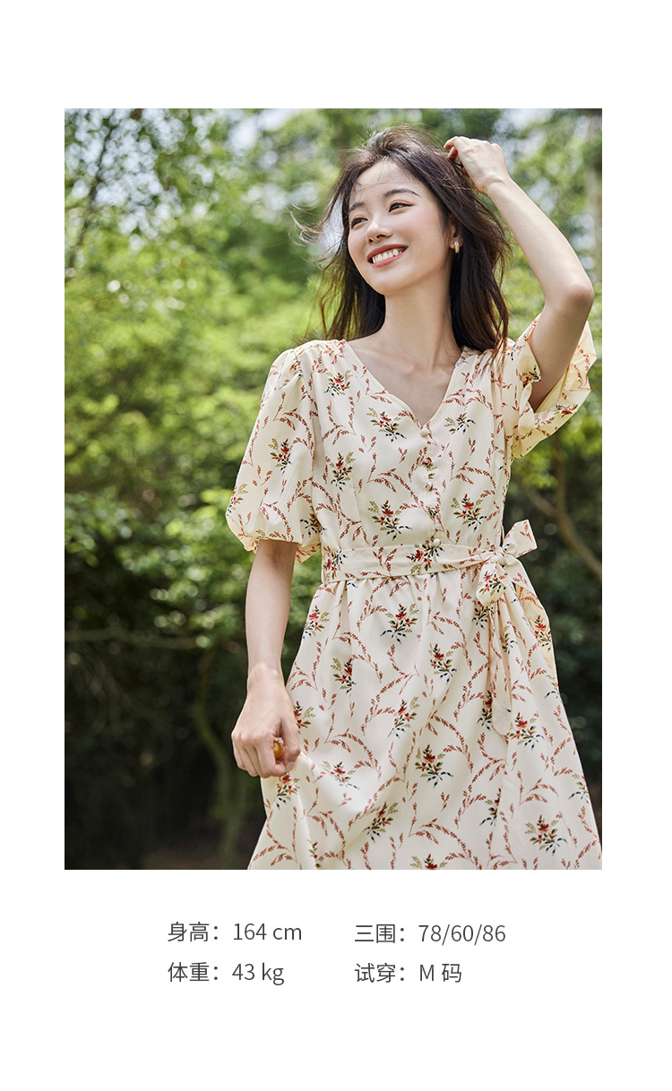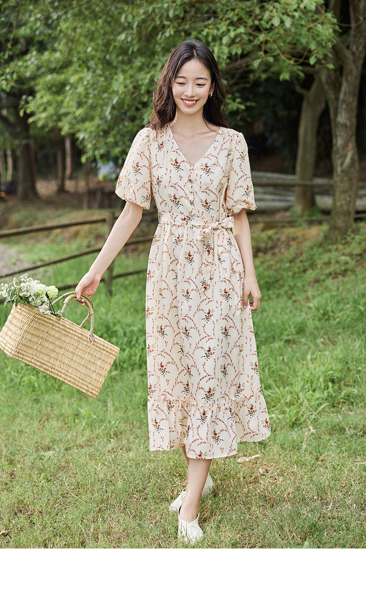프랑스 스타일 우아한 원피스 여름 새로운 여성 퍼프 슬리브 V 넥 타이트 허리 레트로 꽃 우아한 미디 원피스스토어 가기