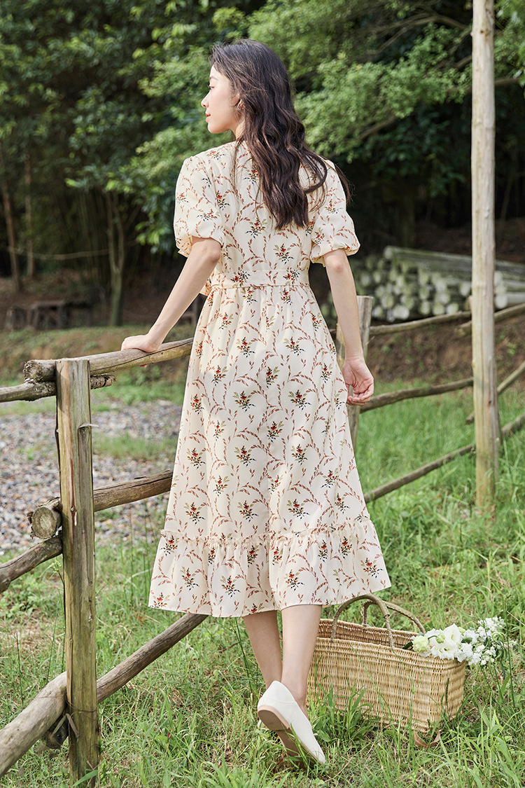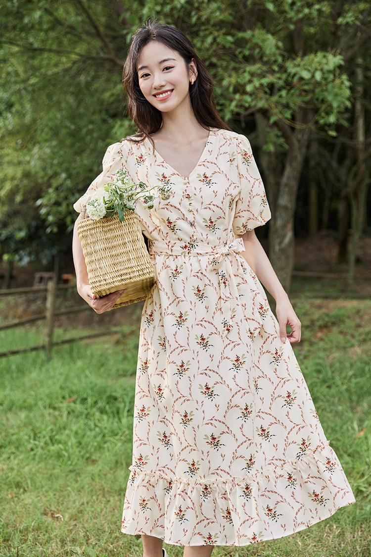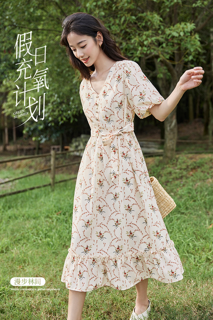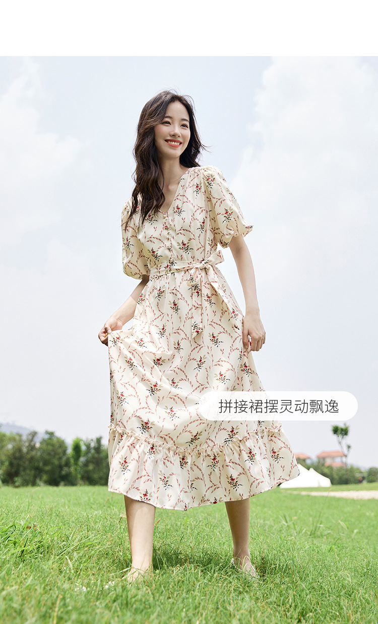 프랑스 스타일 우아한 원피스 여름 새로운 여성 퍼프 슬리브 V 넥 타이트 허리 레트로 꽃 우아한 미디 원피스스토어 가기