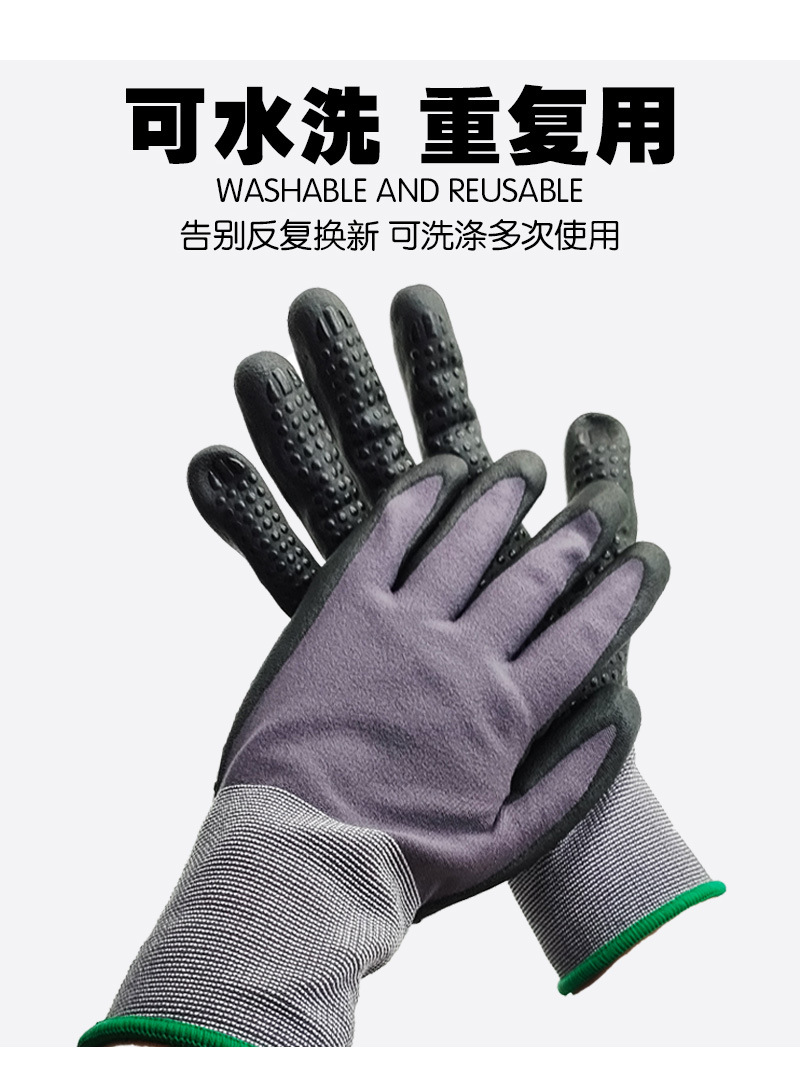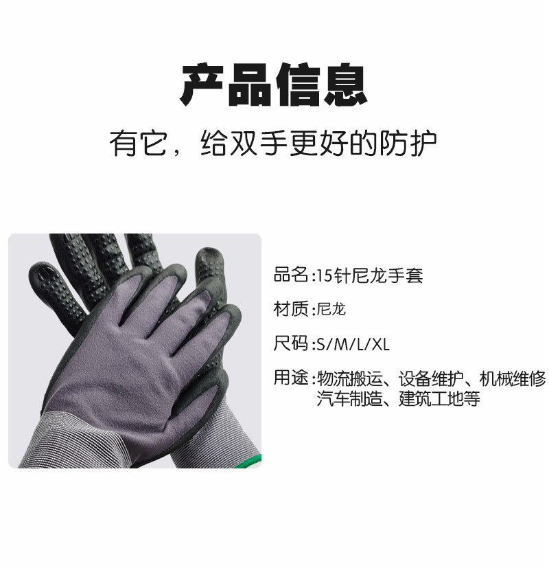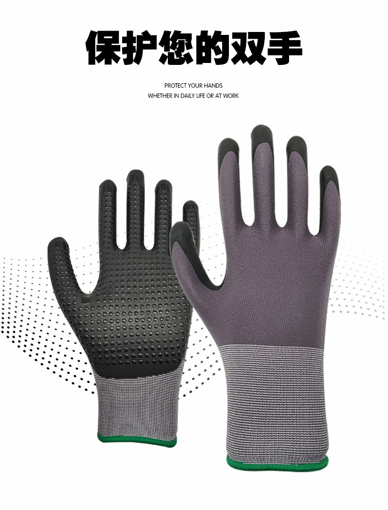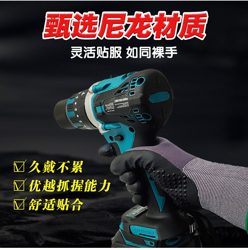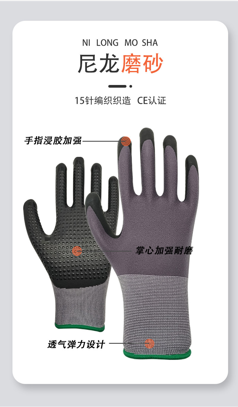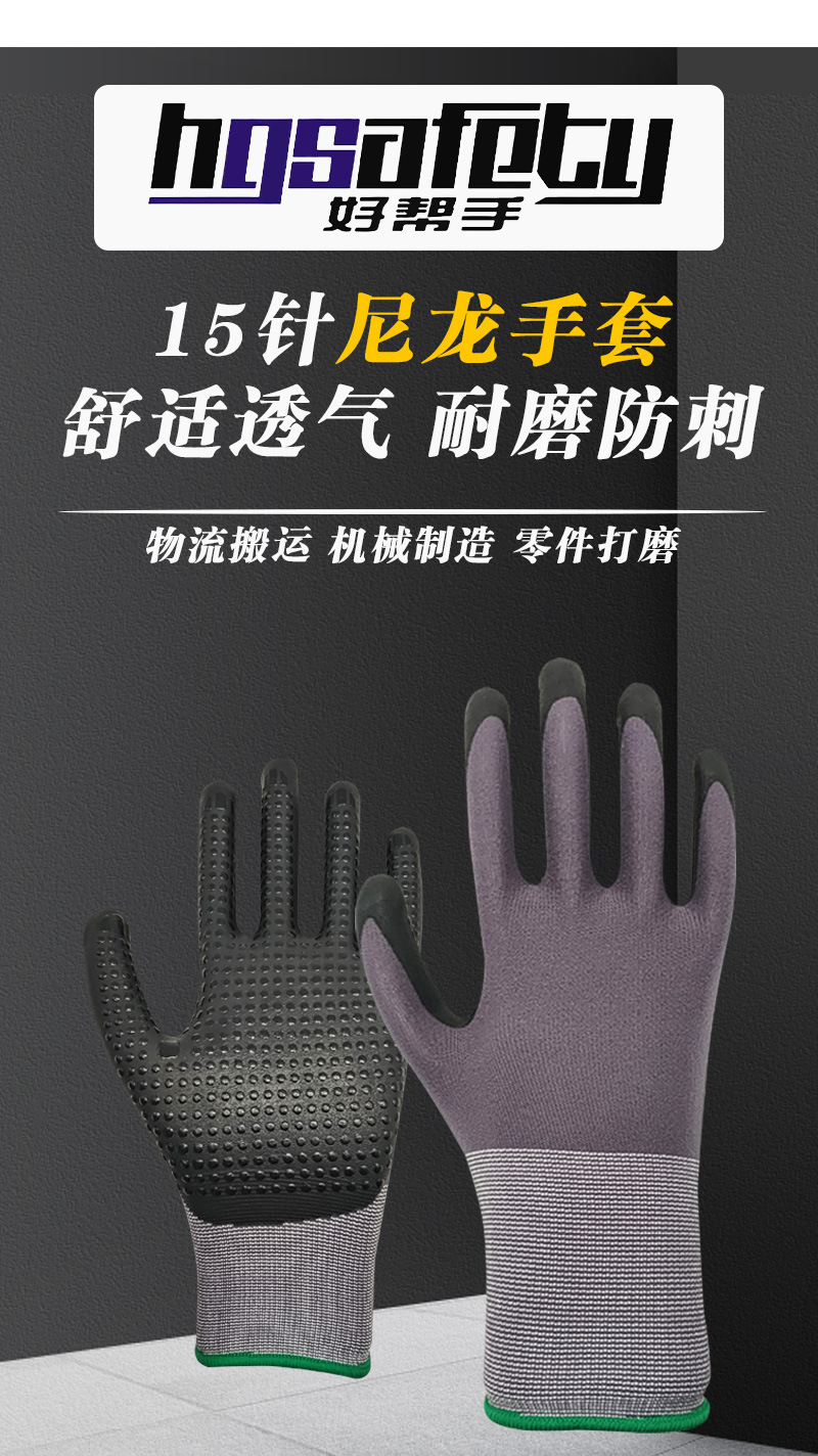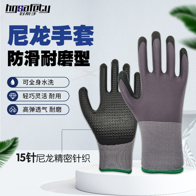 국경 15 핀 나일론 장갑 니트릴 미끄럼 방지 나일론 접착제 내마모성 두꺼운 작업 장갑 공장 도매스토어 가기