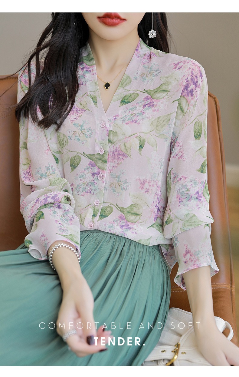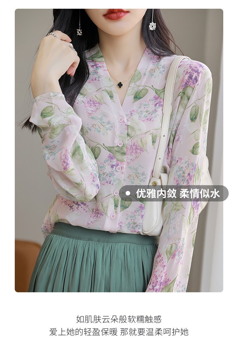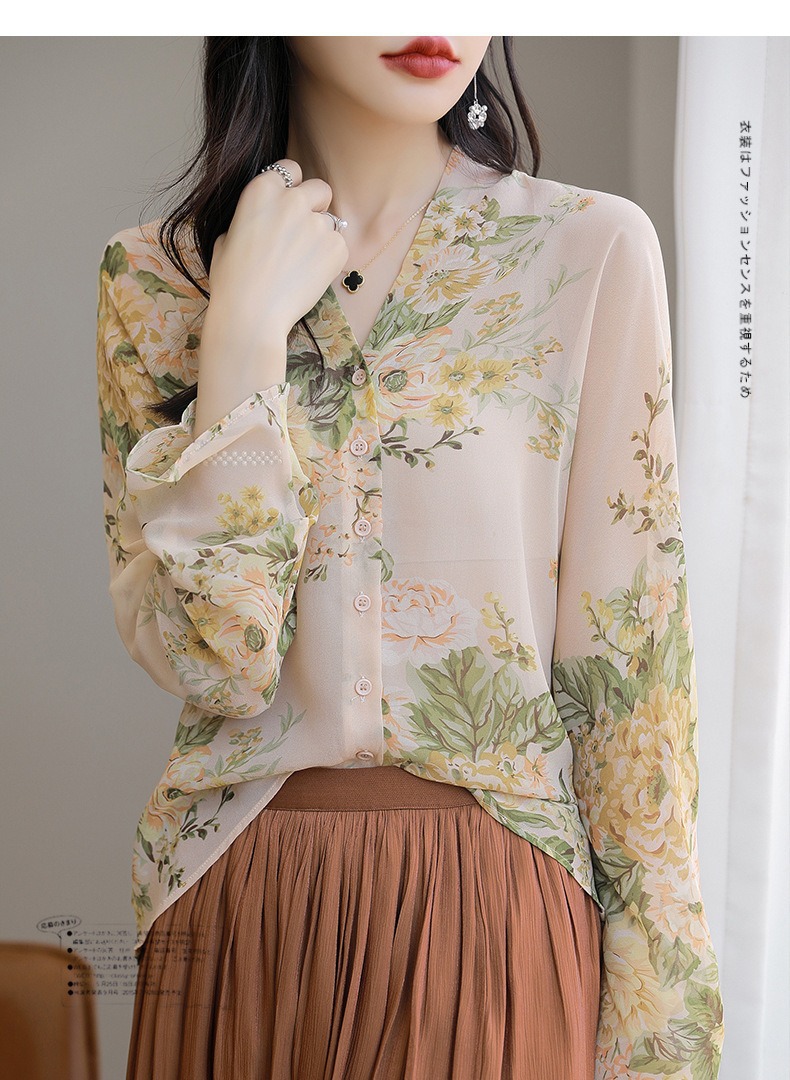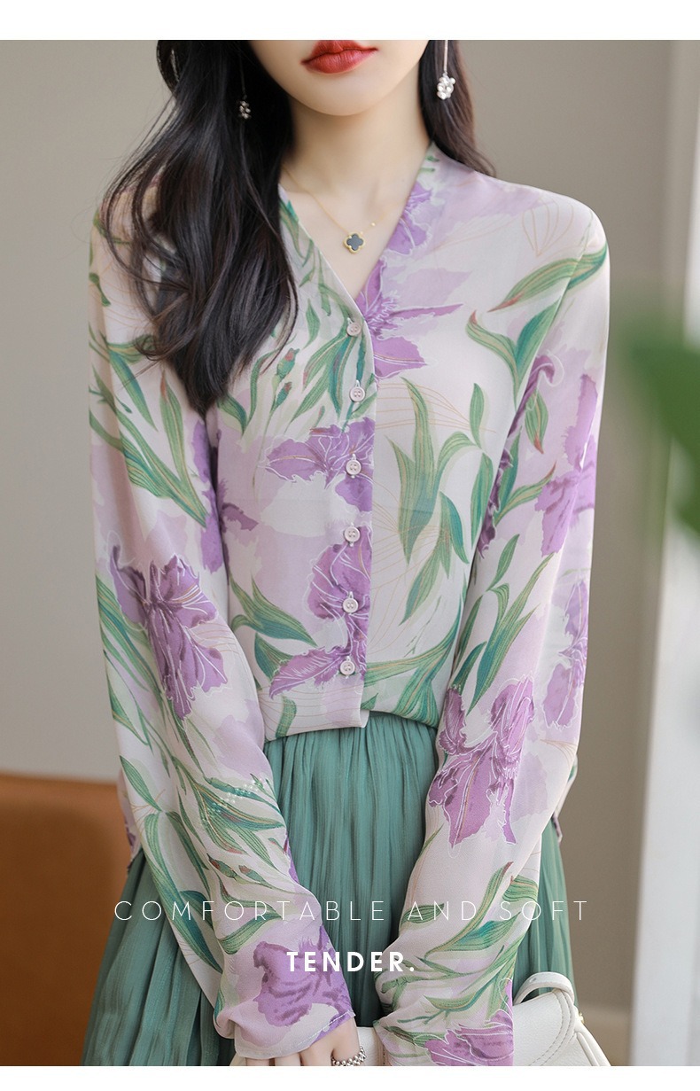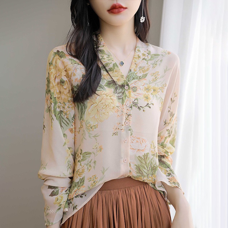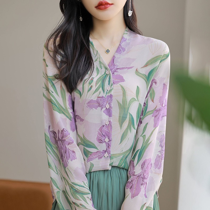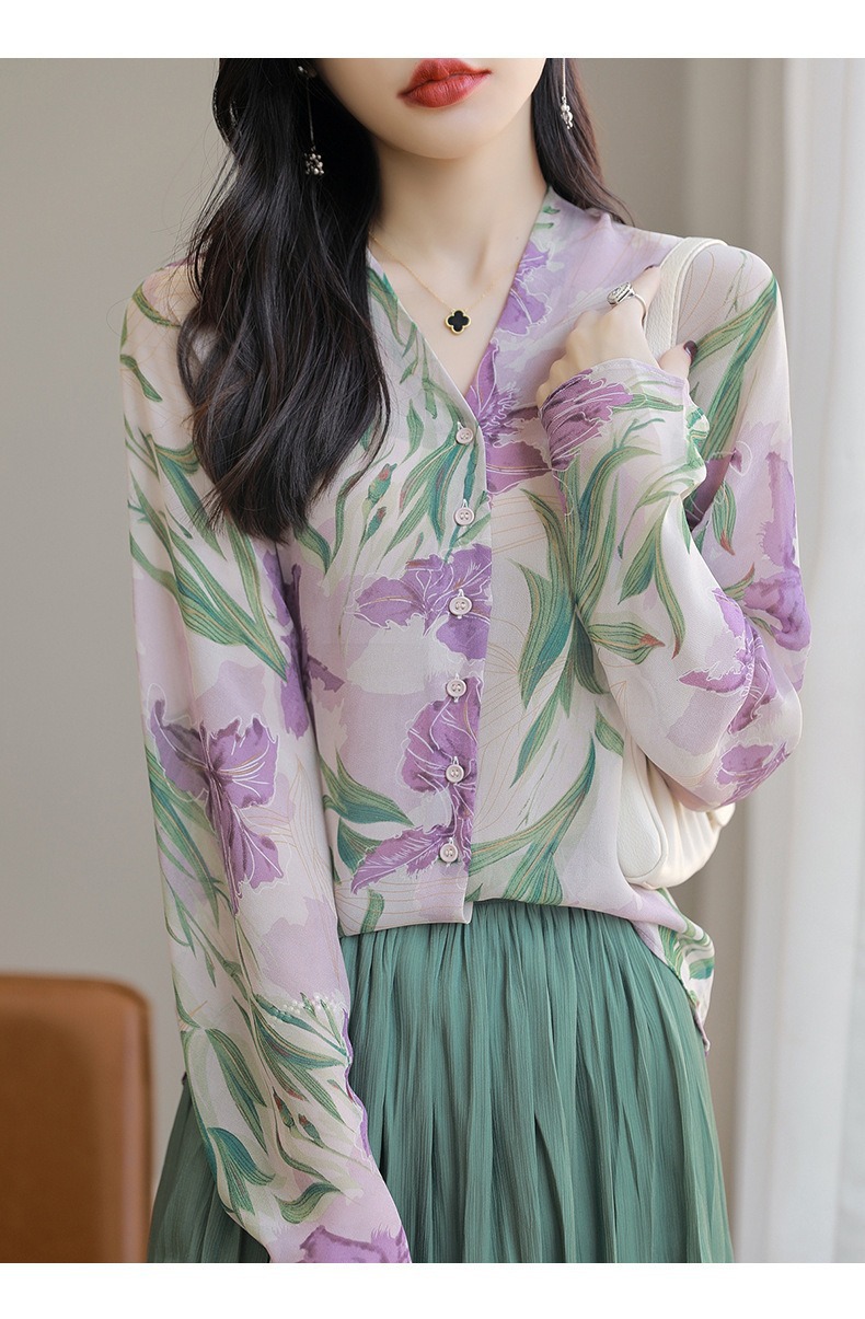 프랑스 V 넥 꽃 셔츠 여성의 새로운 실크 긴팔 느슨한 패션 세련된 빛 럭셔리 멀 베리 실크 선 스크린 카디건