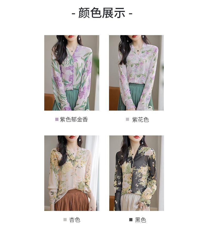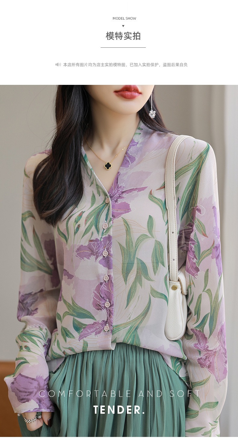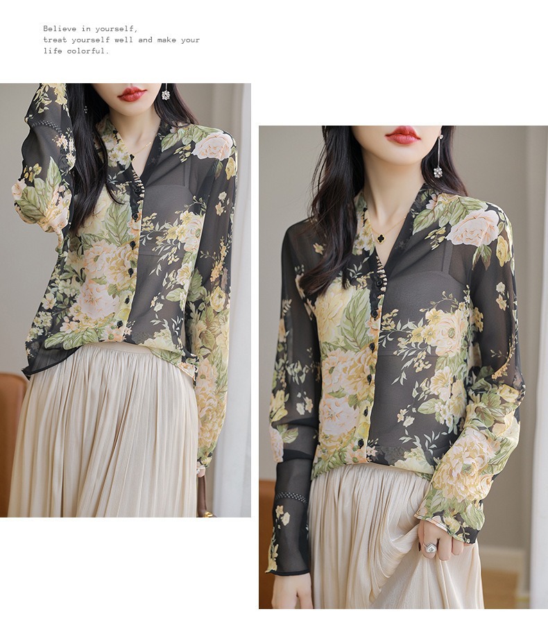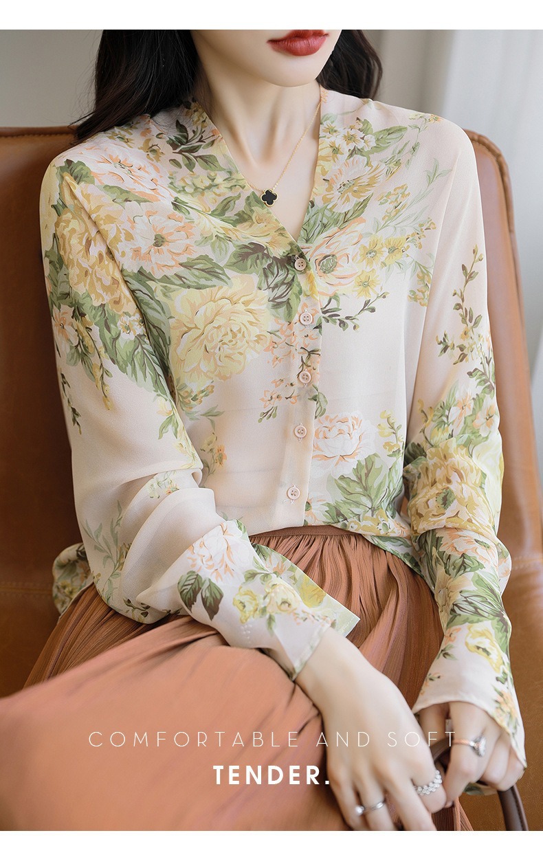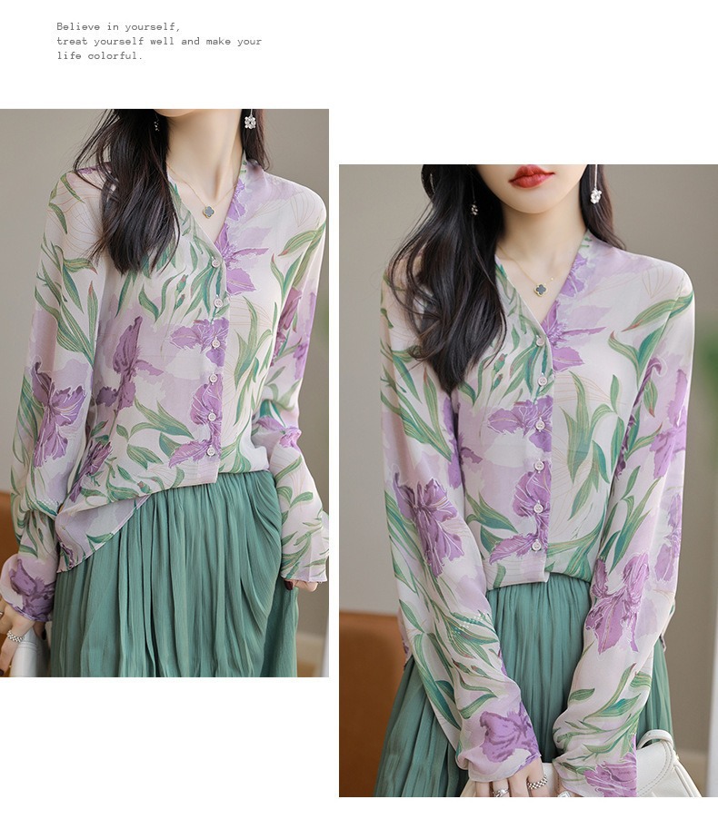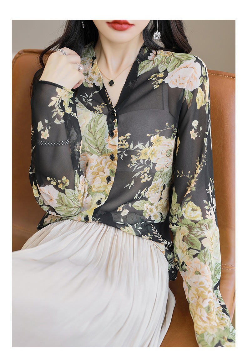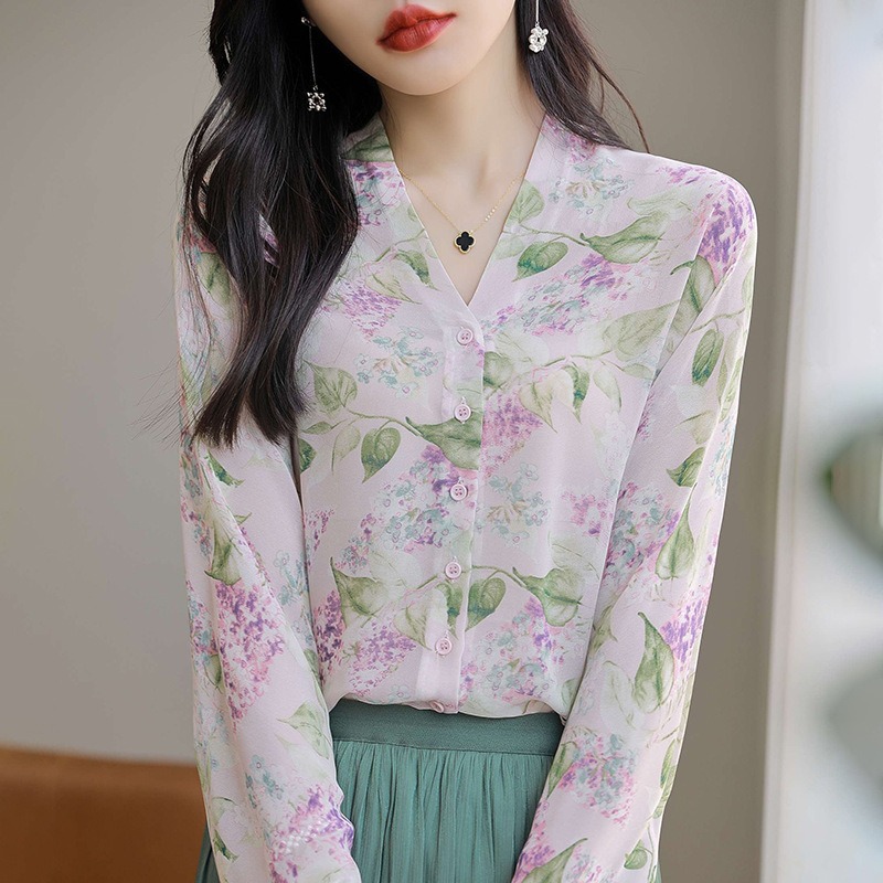 프랑스 V 넥 꽃 셔츠 여성의 새로운 실크 긴팔 느슨한 패션 세련된 빛 럭셔리 멀 베리 실크 선 스크린 카디건