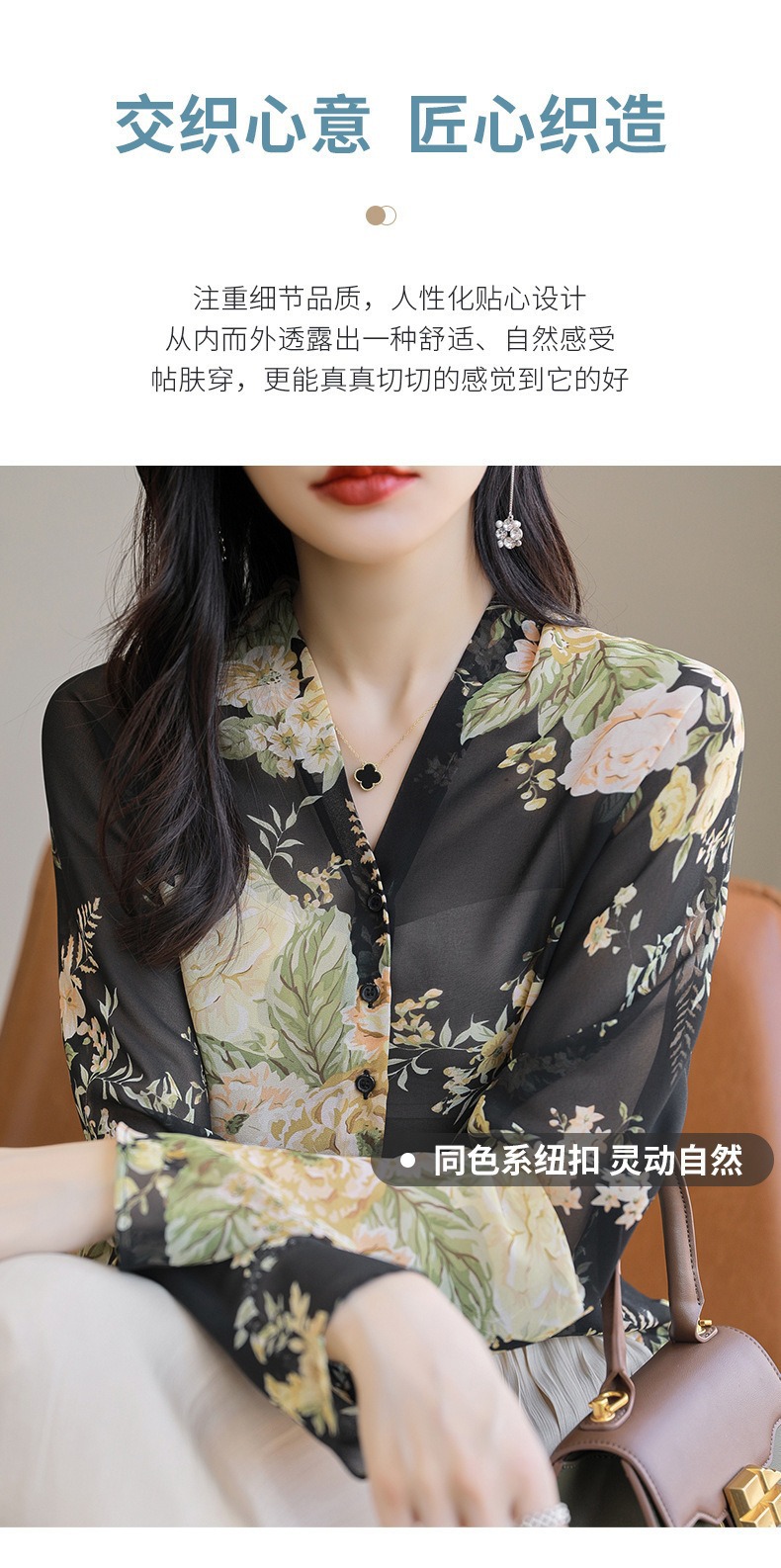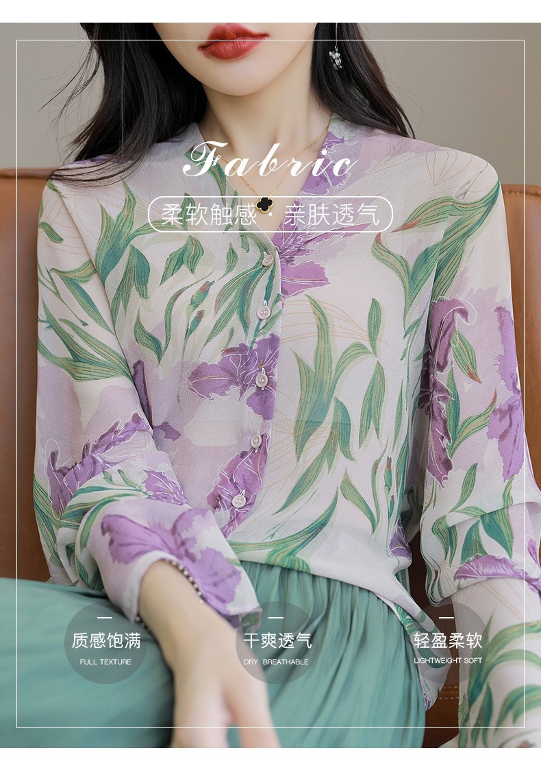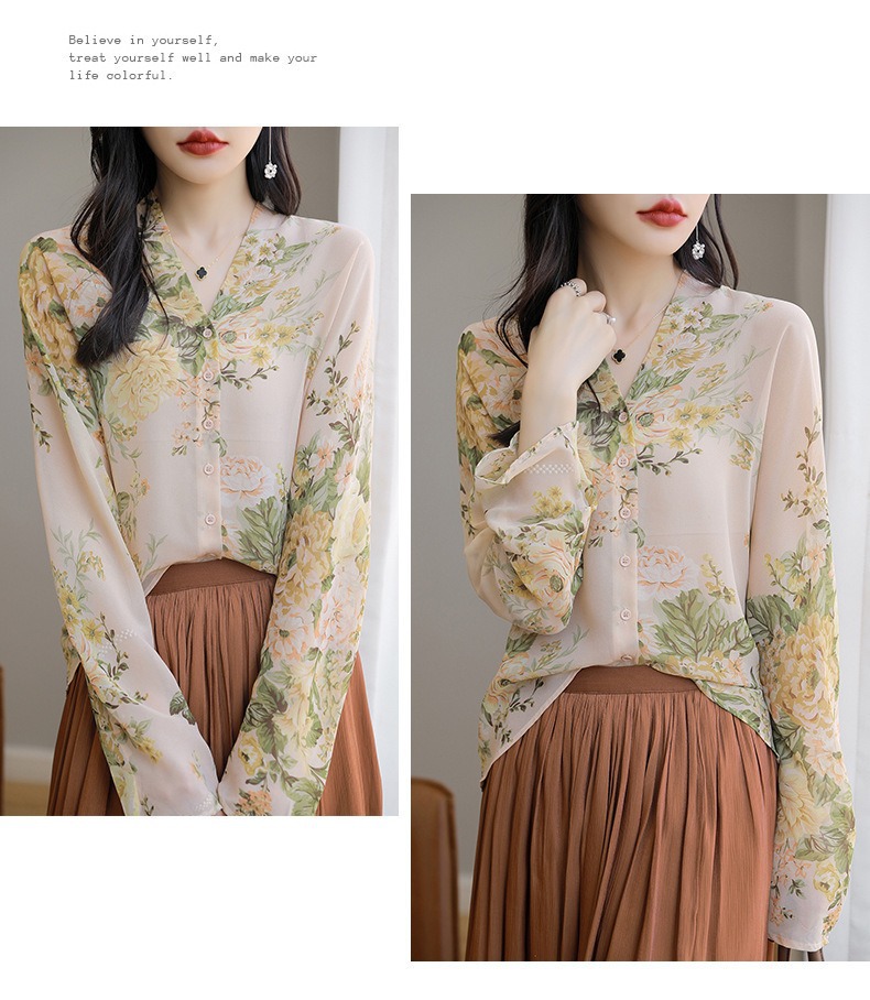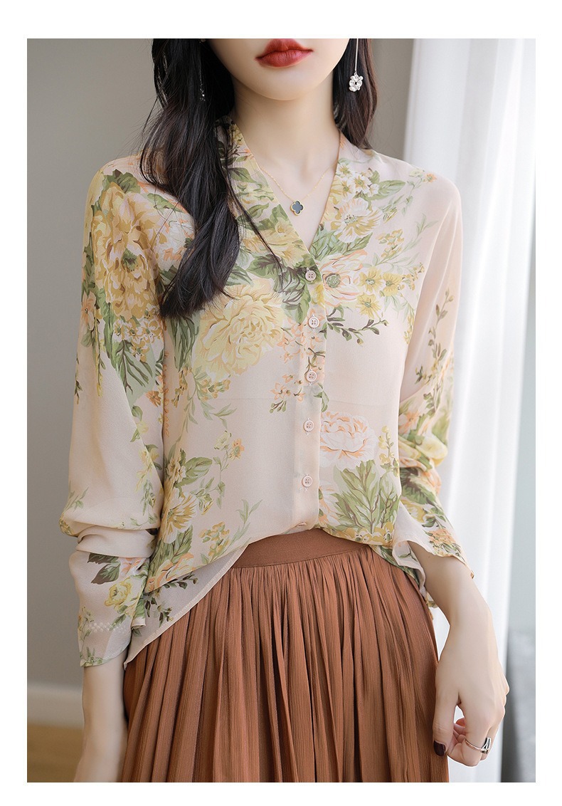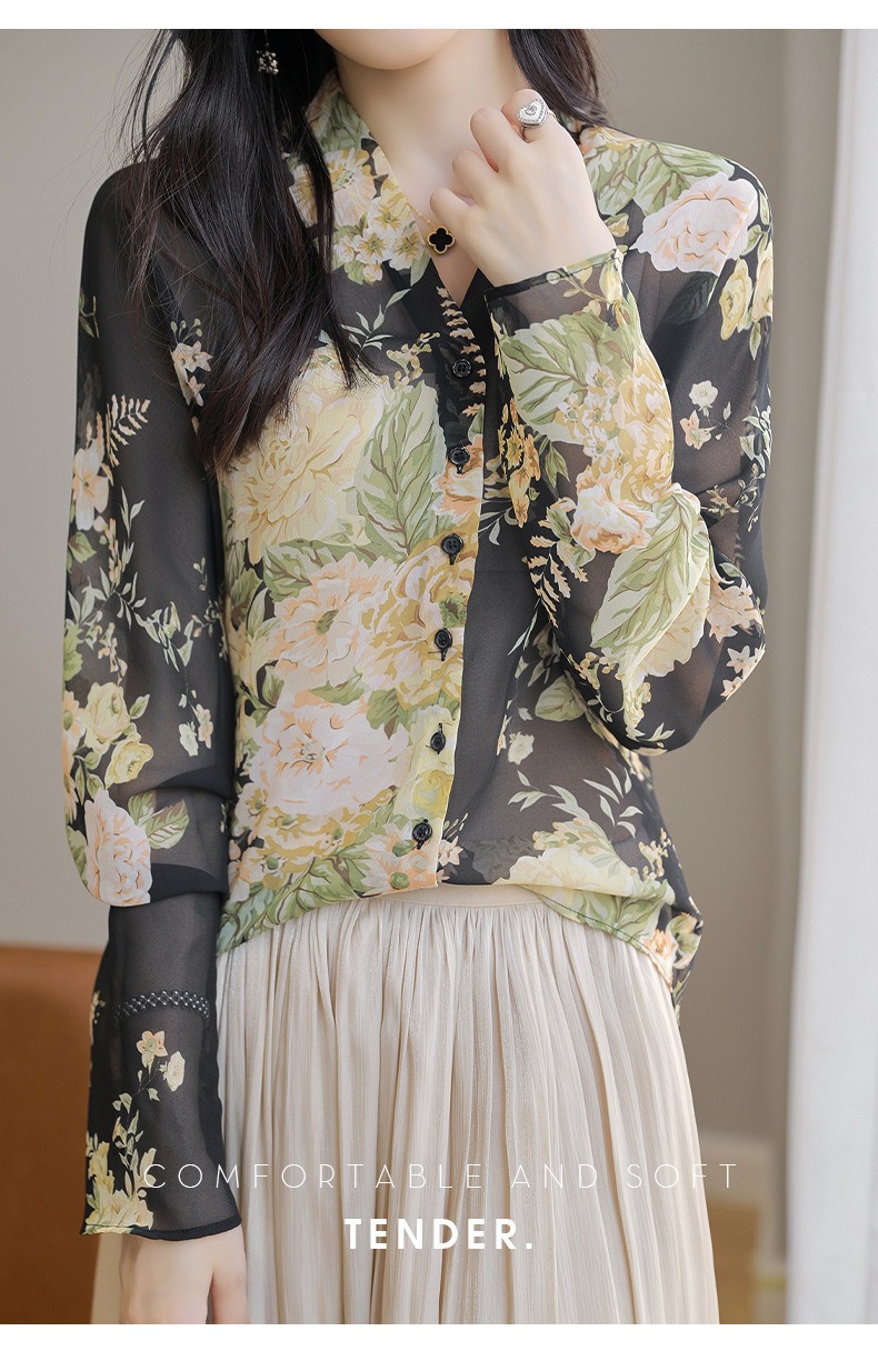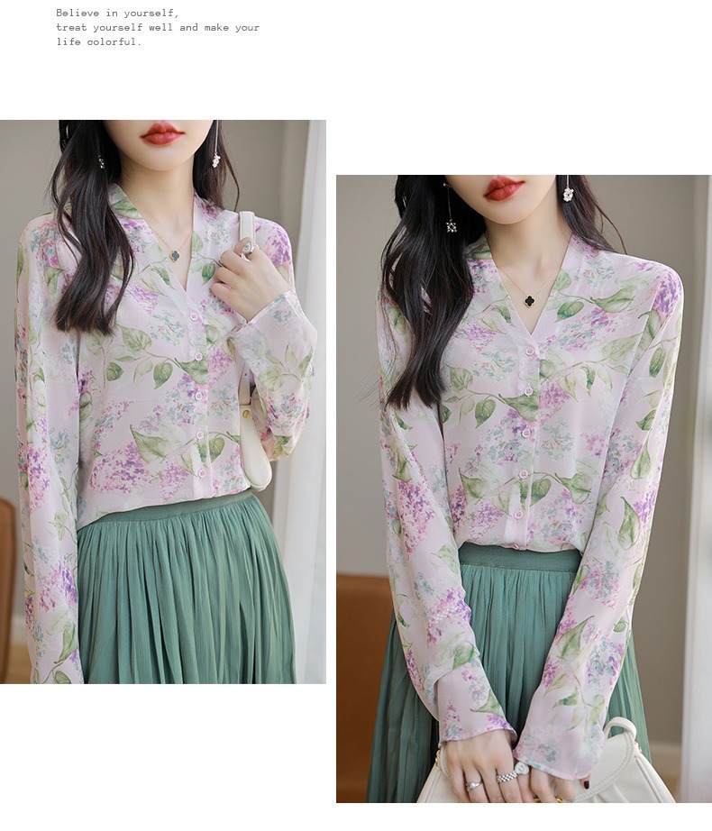 프랑스 V 넥 꽃 셔츠 여성의 새로운 실크 긴팔 느슨한 패션 세련된 빛 럭셔리 멀 베리 실크 선 스크린 카디건