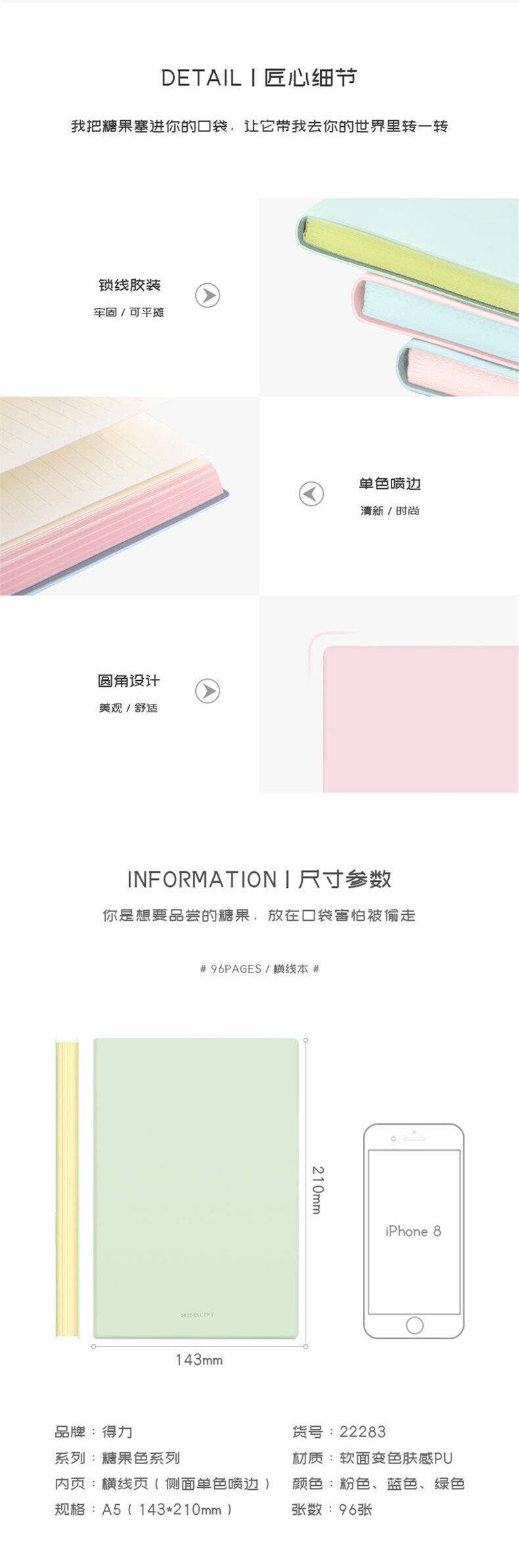 델리 22283 소프트 페이스 페이스트 코어 가죽 국수 캔디 컬러 학생 교실 노트북 레코드 북 사무실 노트북스토어 가기