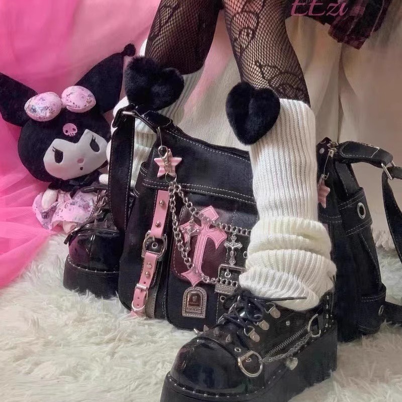 원래 틈새 하위 문화 밀레니엄 스파이스 소녀 핸드백 Y2K 멋진 소녀 키티 고양이 검은 핑크 대조 크로스 바디 백