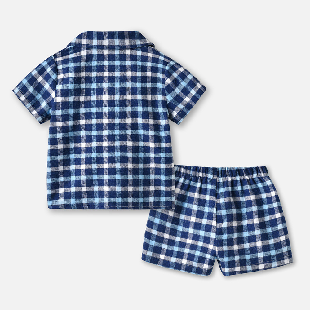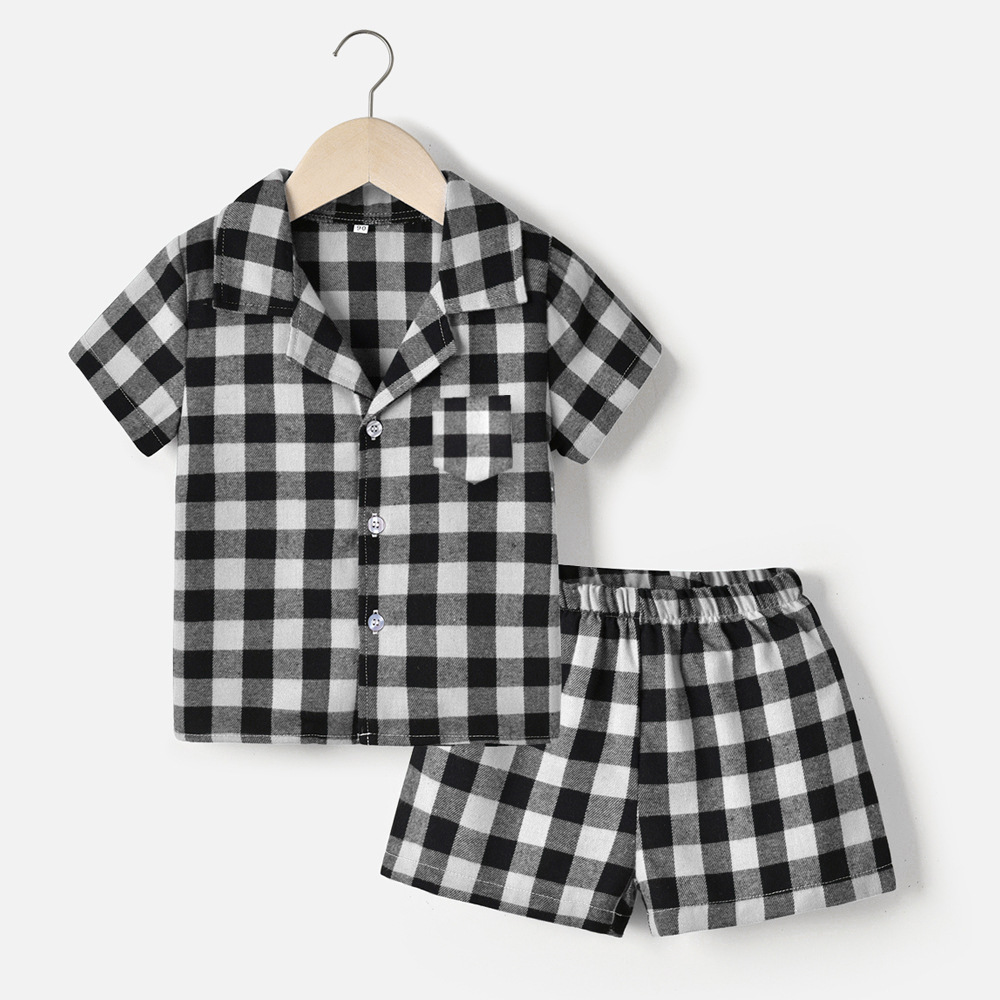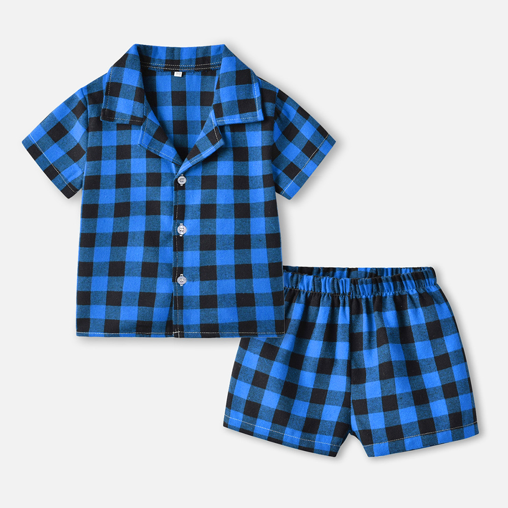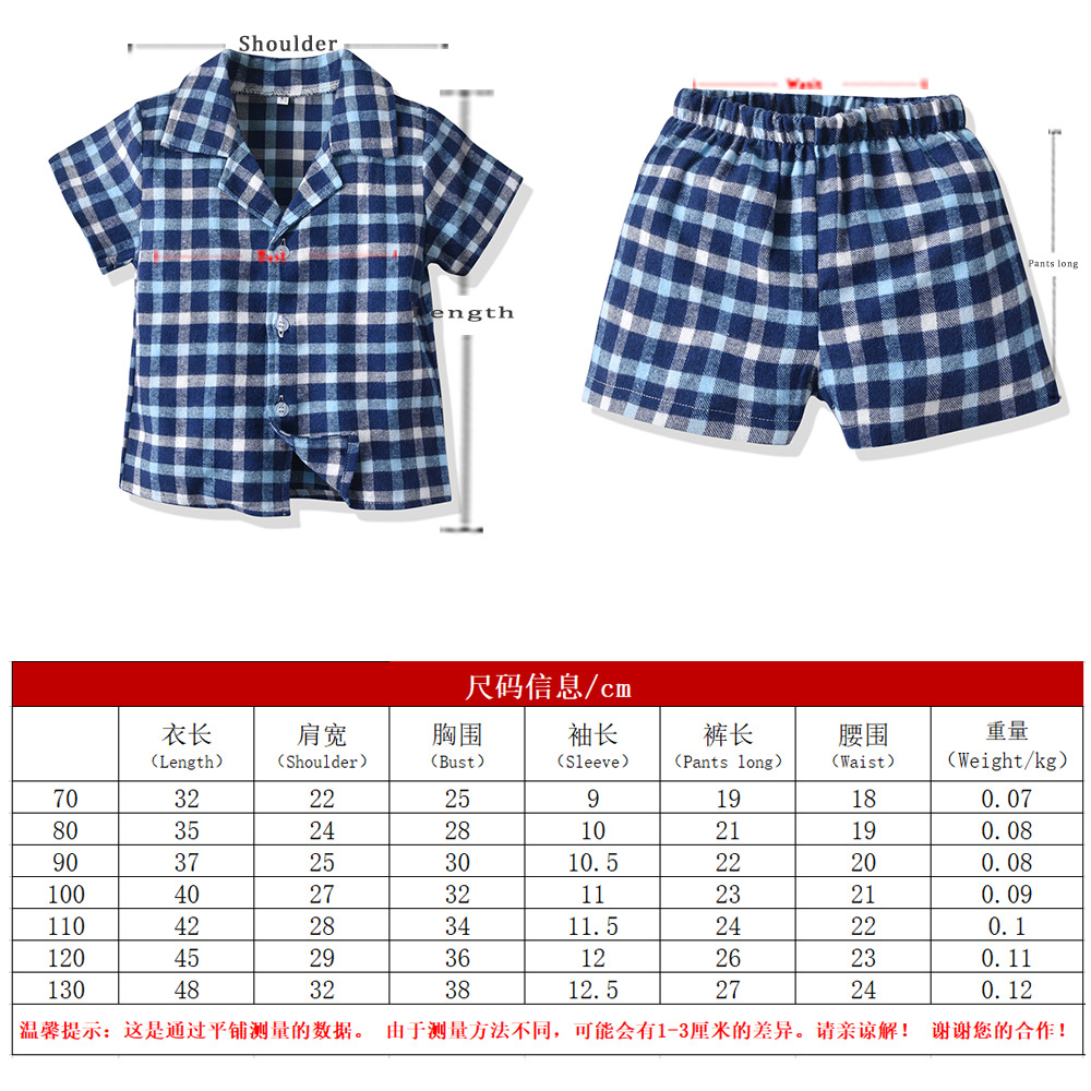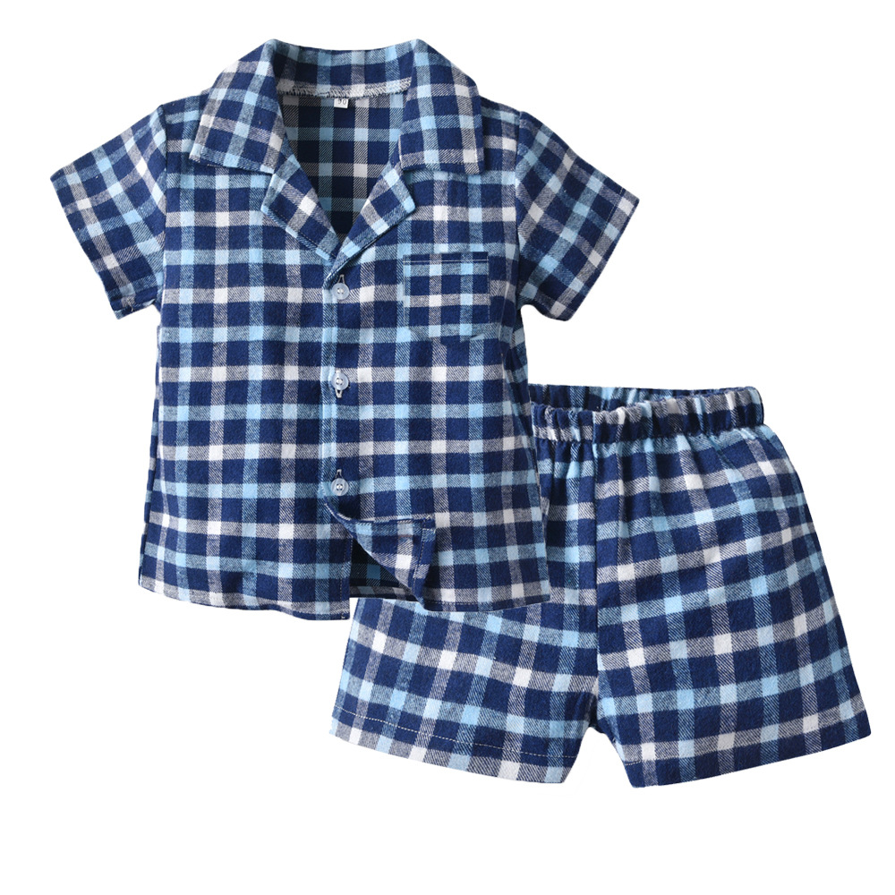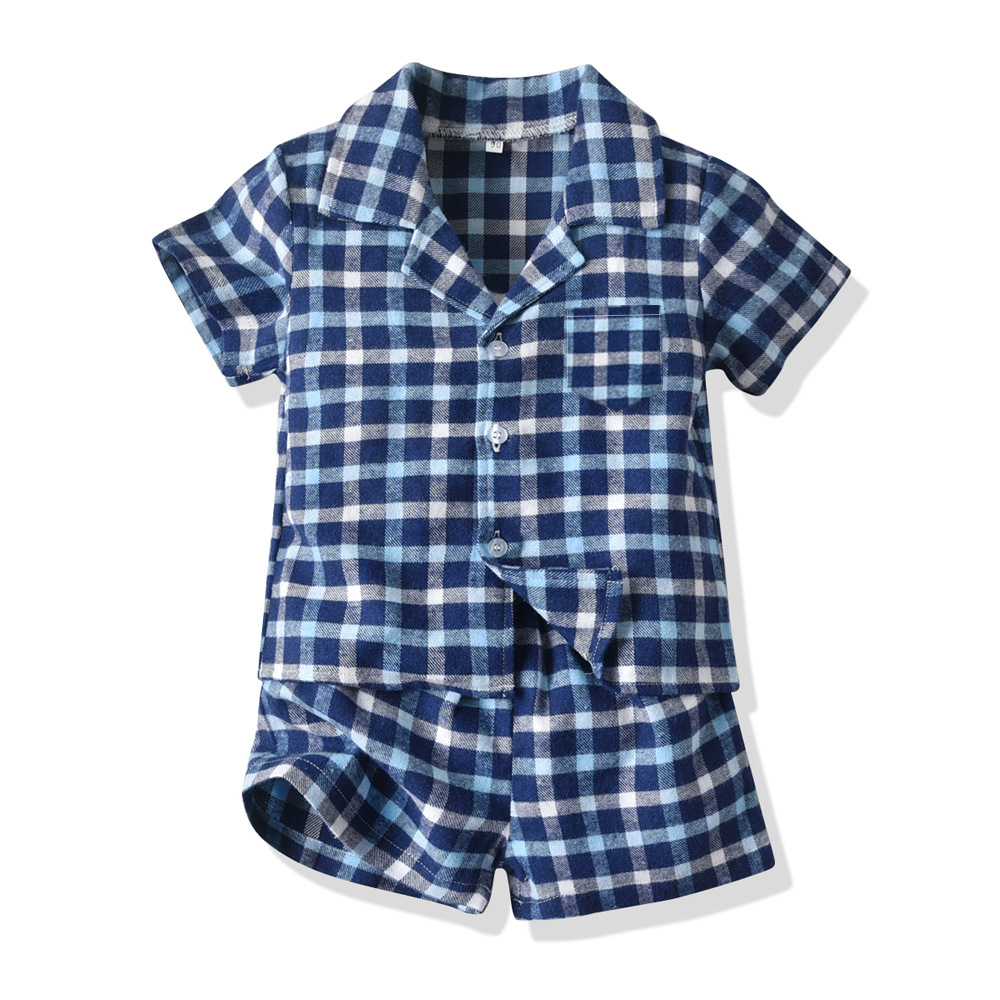 어린이 잠옷 소년의 봄과 가을 얇은 면 반팔 카디건 격자 무늬 잠옷 세트 소년의 아기 집 옷
