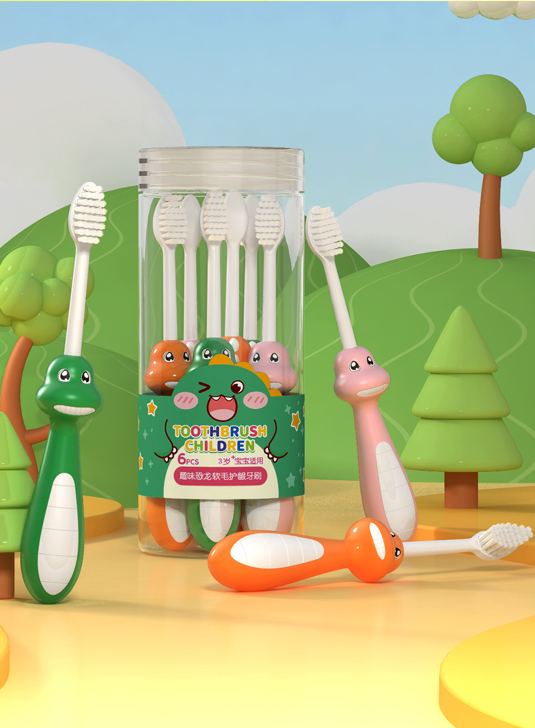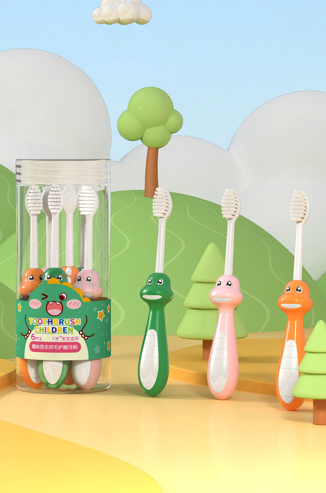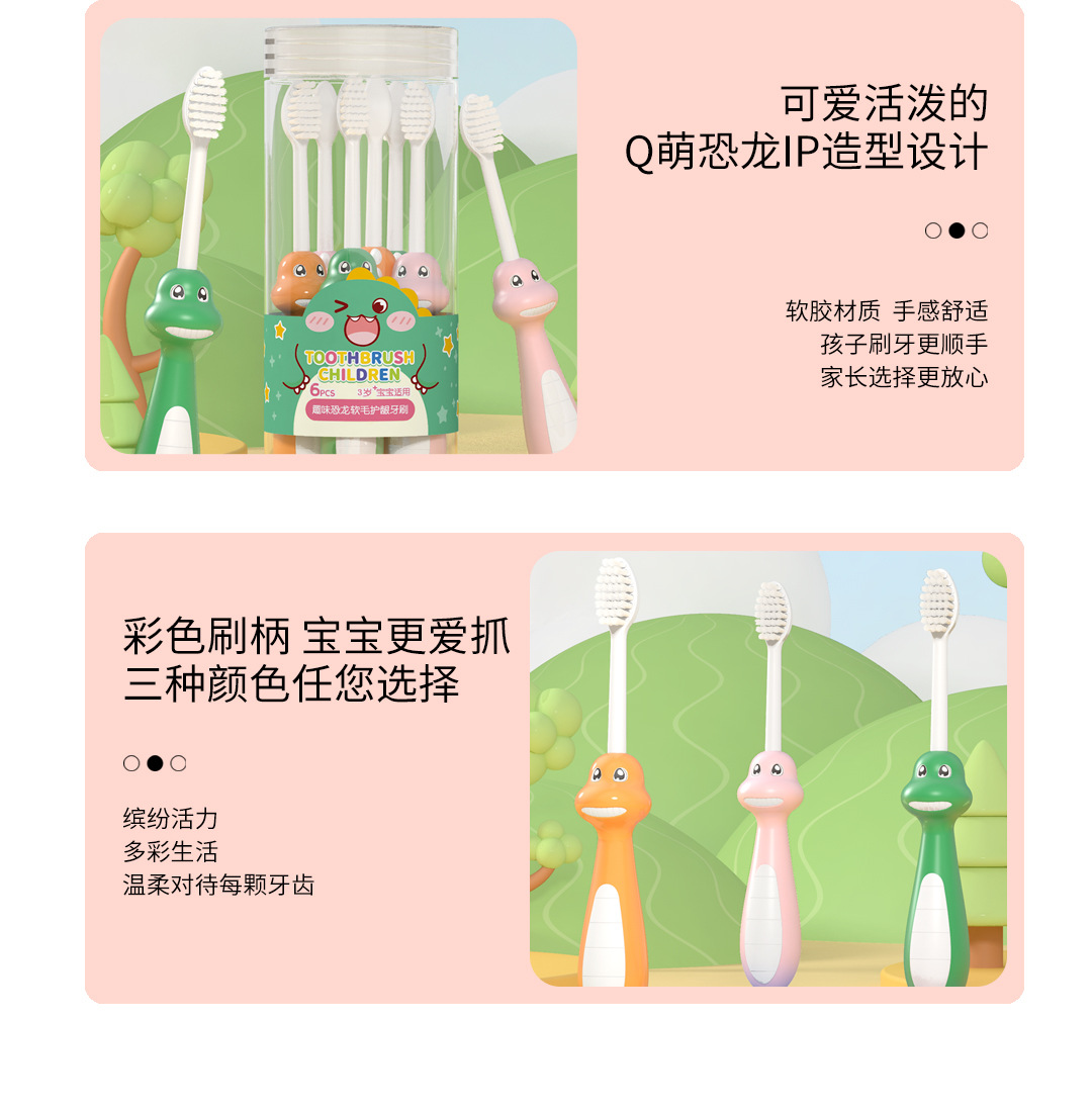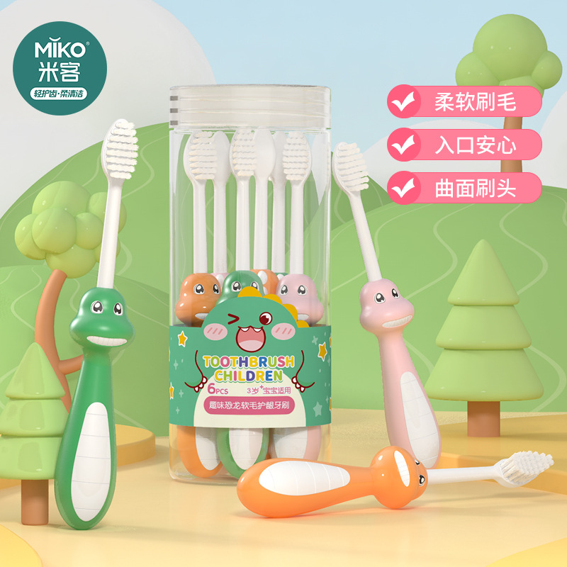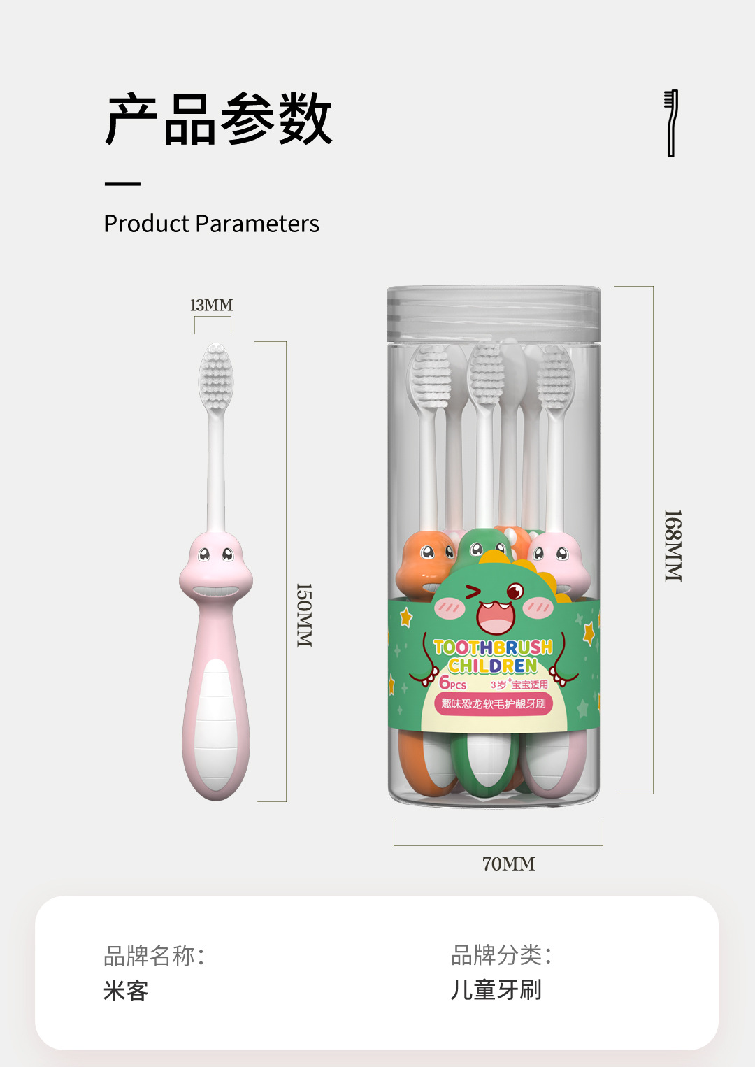 마이크 어린이 부드러운 칫솔 귀여운 작은 공룡 케어 껌 곡선 브러시 헤드 6 배럴 제조 업체 도매