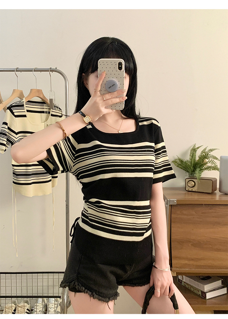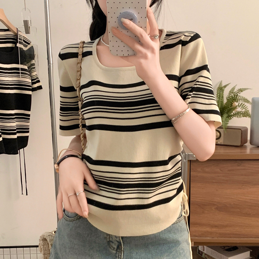 40.00 kg-69.00 kg! 2024 여름 새로운 라운드 넥 드로스트링 니트 전나무 얇은 아이스 실크 티셔츠 전나무