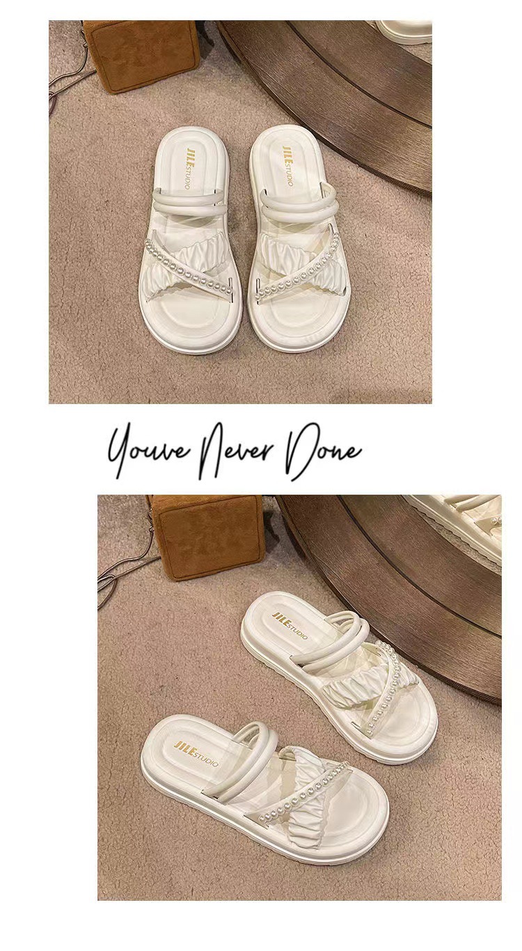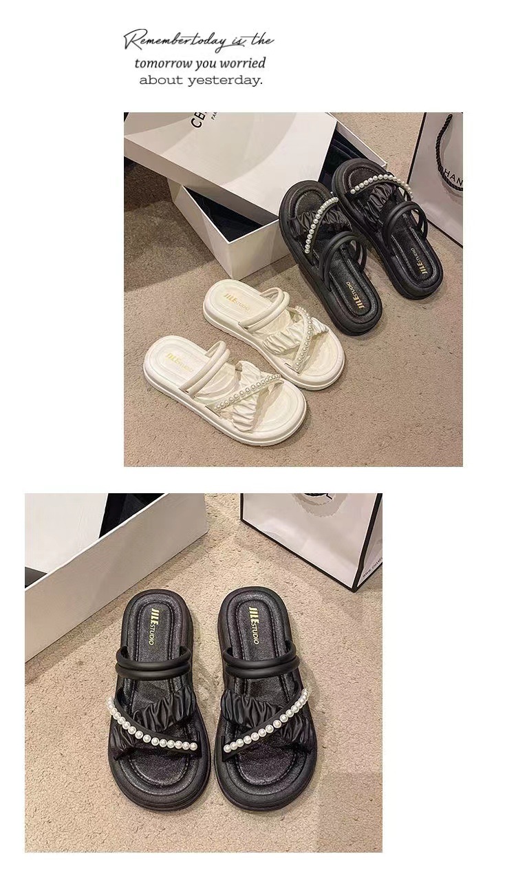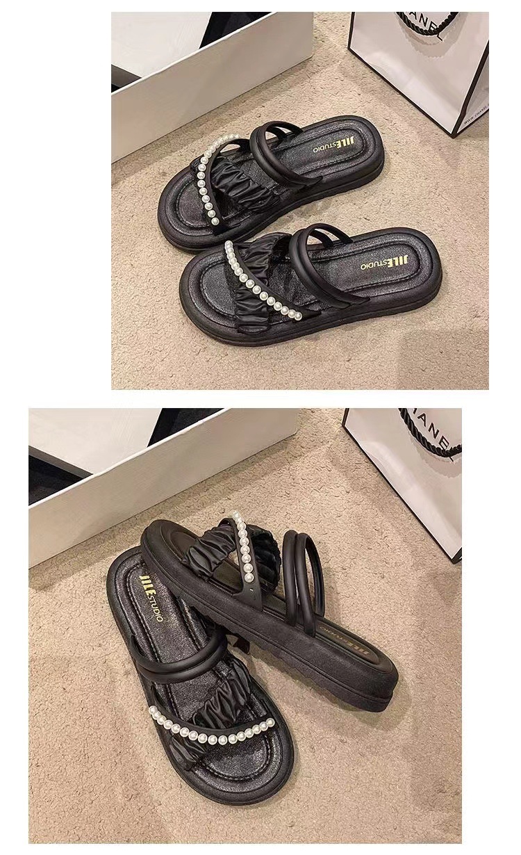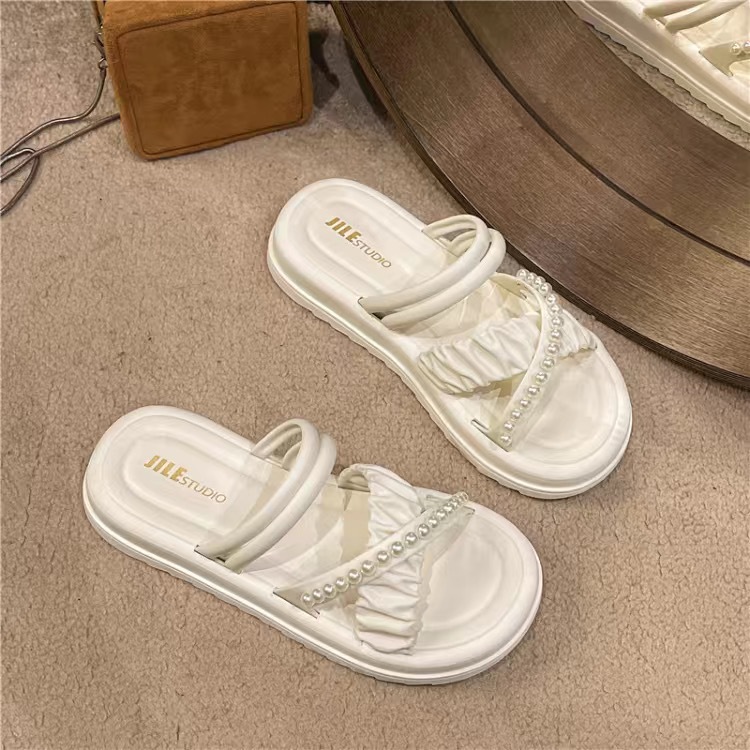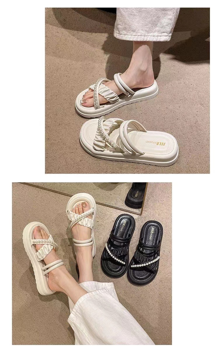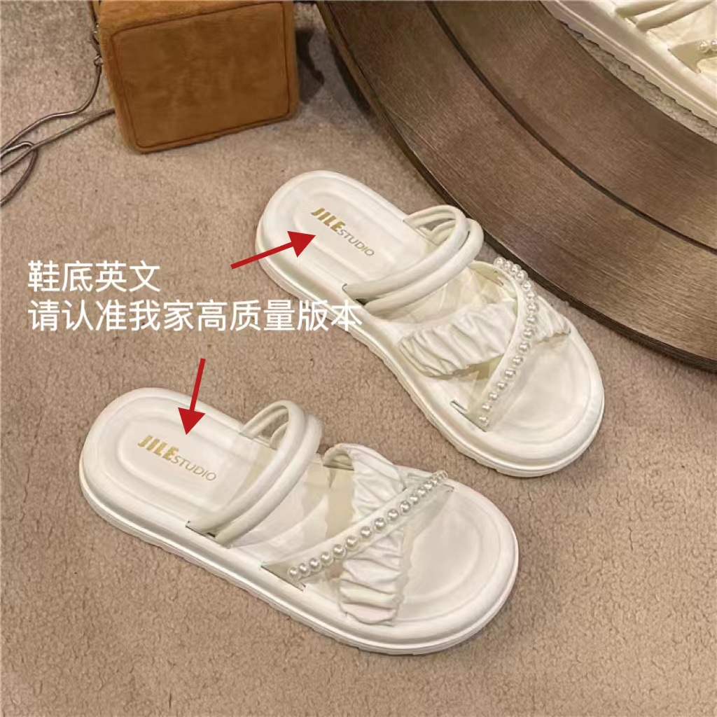 여성을위한 프랑스 하이 엔드 샌들 여름 여성을위한 2025 새로운 겉옷 미끄럼 방지 두꺼운 밑창 라인 석 진주 다목적 슬리퍼스토어 가기