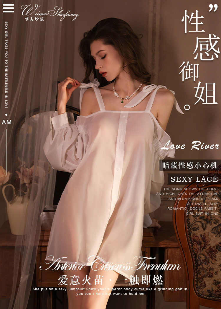 Meiyujia 섹시한 어깨 나이트 가운 여성 레이스 업 관점 슬링 나이트 가운 순수한 욕망 남자 친구 스타일 칼라 셔츠 원피스