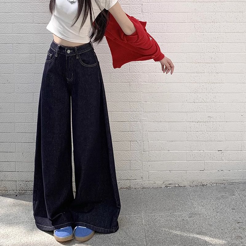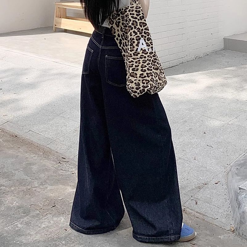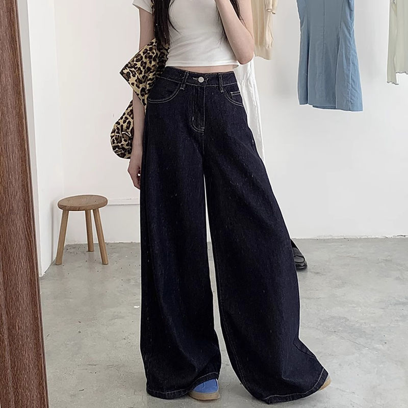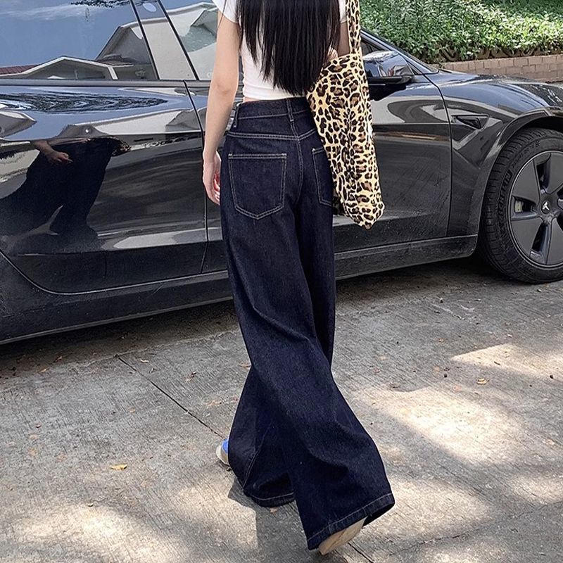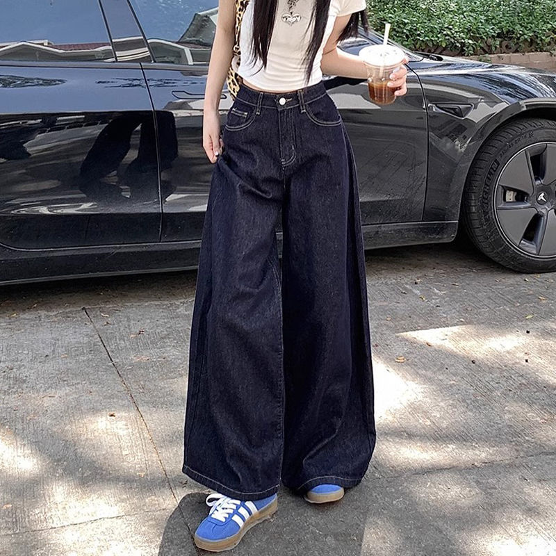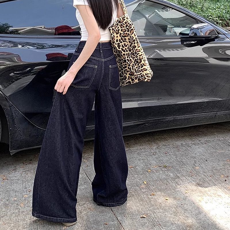 간단한 다크 블루 높은 허리 슬림 룩 팝 청바지 여성의 2024 여름 새로운 느슨한 넓은 다리 바닥 바지스토어 가기
