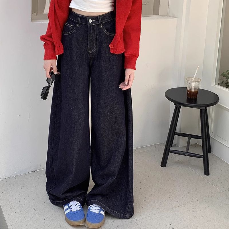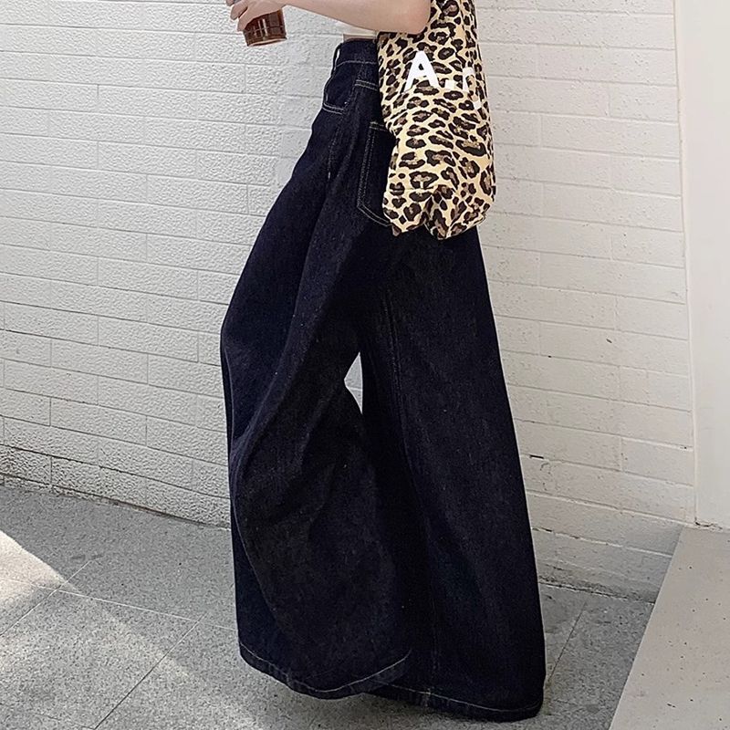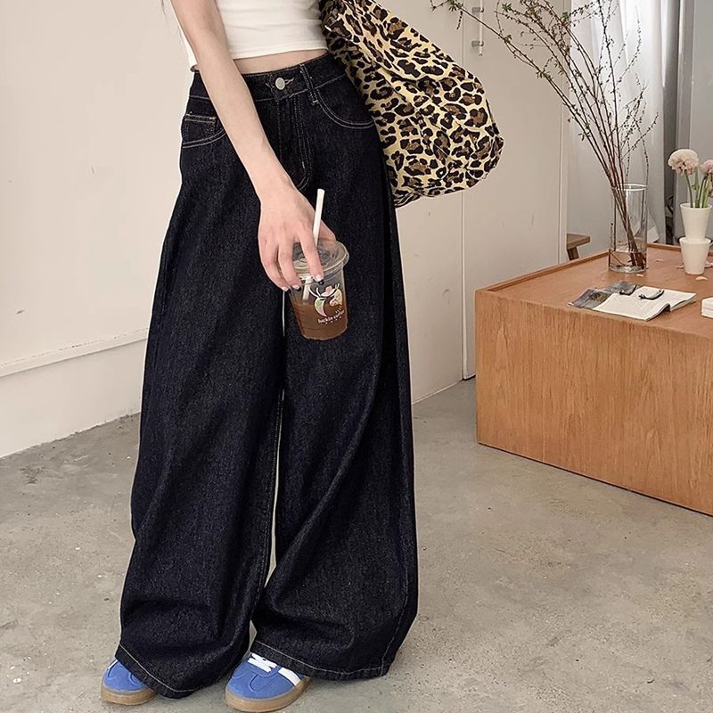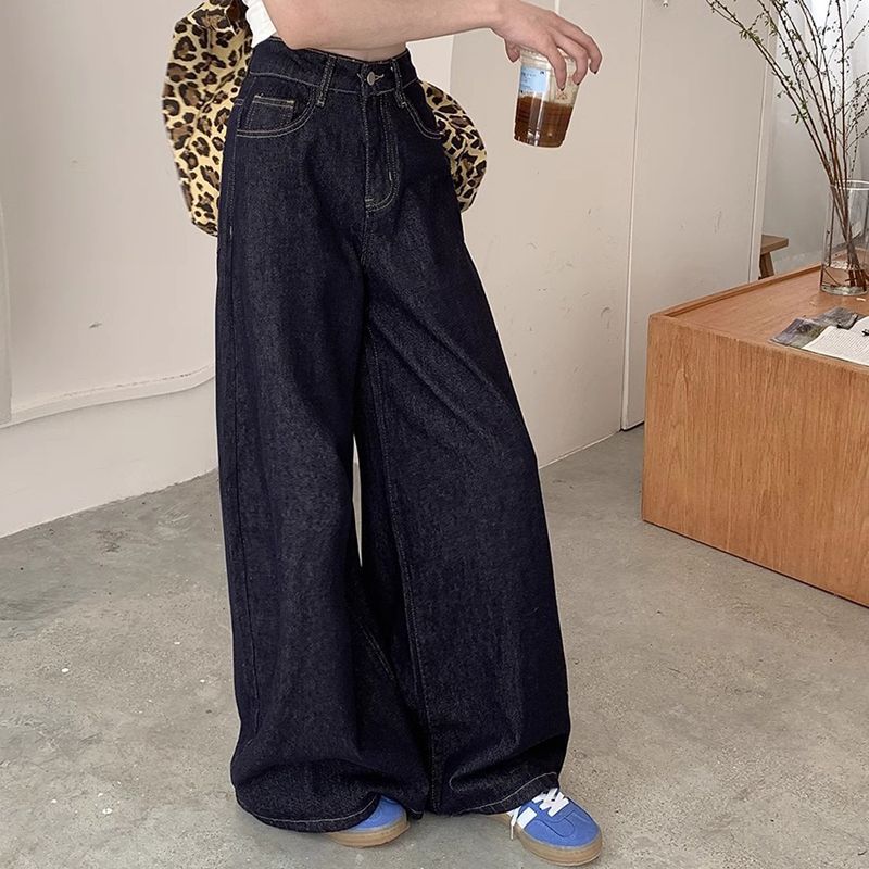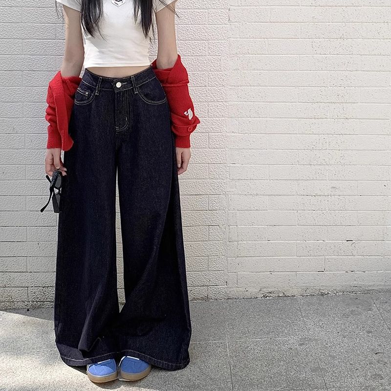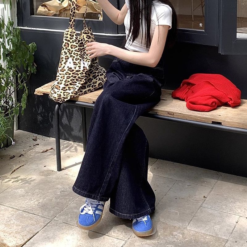 간단한 다크 블루 높은 허리 슬림 룩 팝 청바지 여성의 2024 여름 새로운 느슨한 넓은 다리 바닥 바지스토어 가기