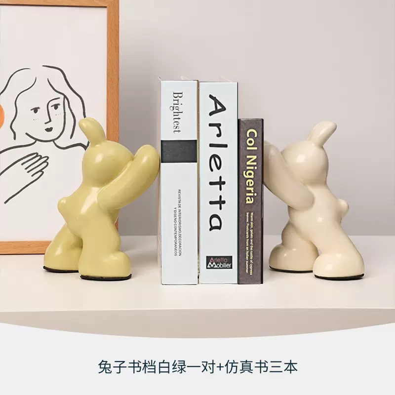 • 흰색과 녹색 토끼 북엔드 + 시뮬레이션 책 3권(임의 스타일)