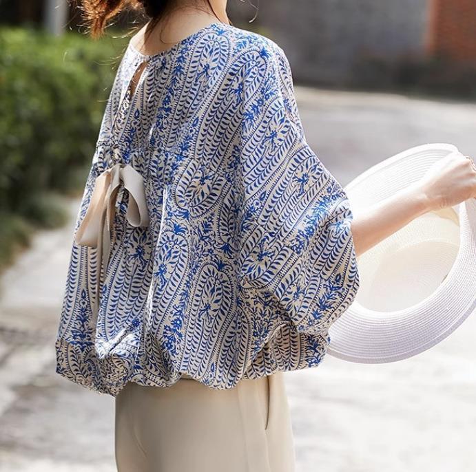 여름 새로운 배꼽 덮기 최고 여성 상쾌한 느슨한 박쥐 소매 다시 레이스 업 활 꽃 셔츠 탑스토어 가기