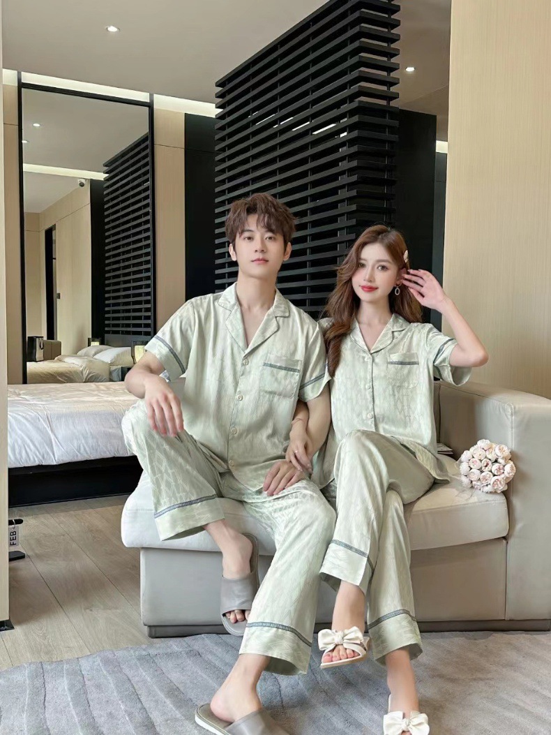 2024 여름 새 커플 잠옷 여성용 아이스 실크 인쇄 하이 엔드 남성 캐주얼 반팔 바지 홈 의류스토어 가기