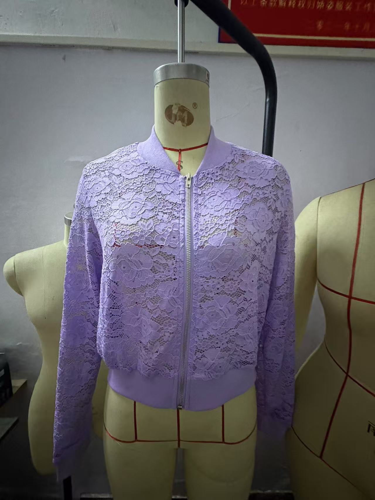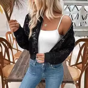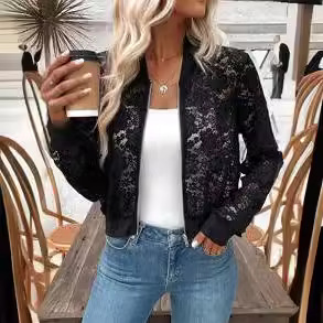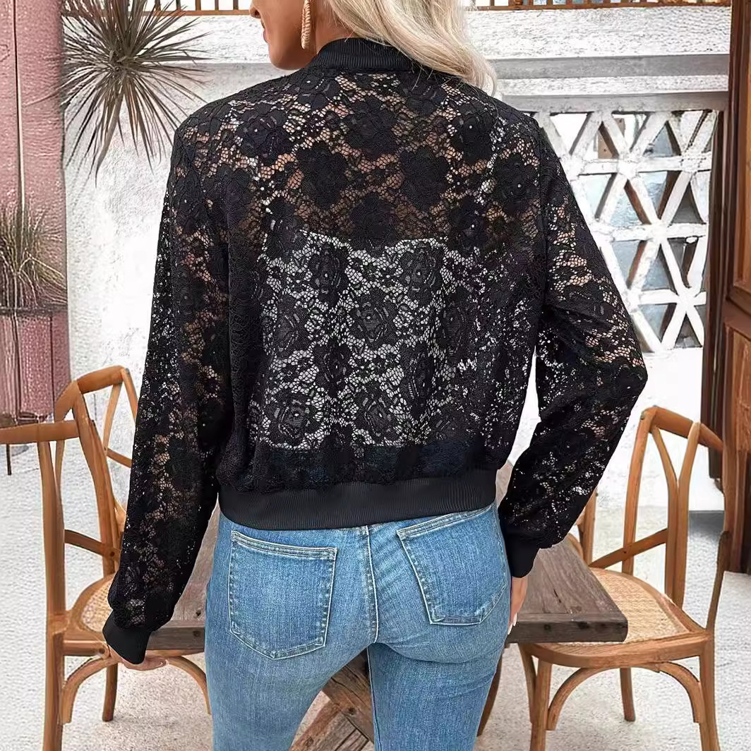 유럽 및 미국 해외직구 2025 가을 겨울 신상 우아한 여성 자카드 레이스 시스루 지퍼 숏 재킷 상의