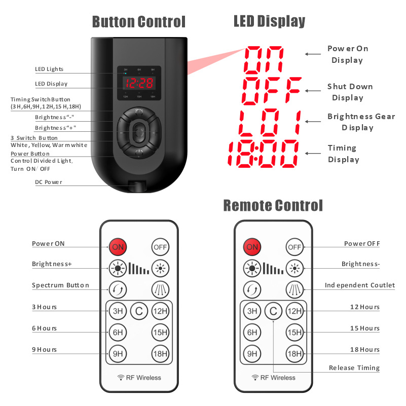 2.智能LED数字显示,3、6、9、12、15、18小时手动或遥控定时