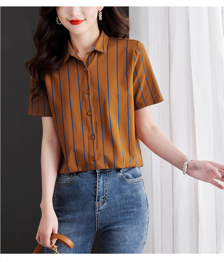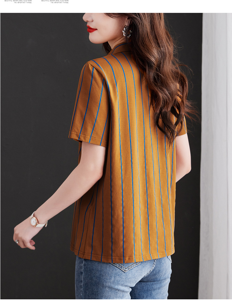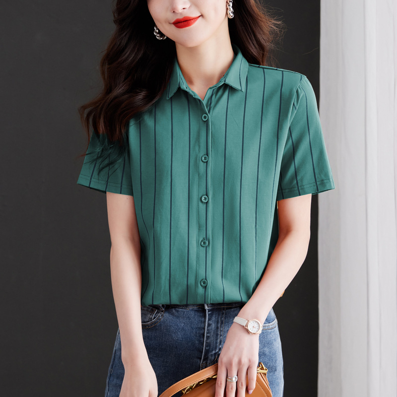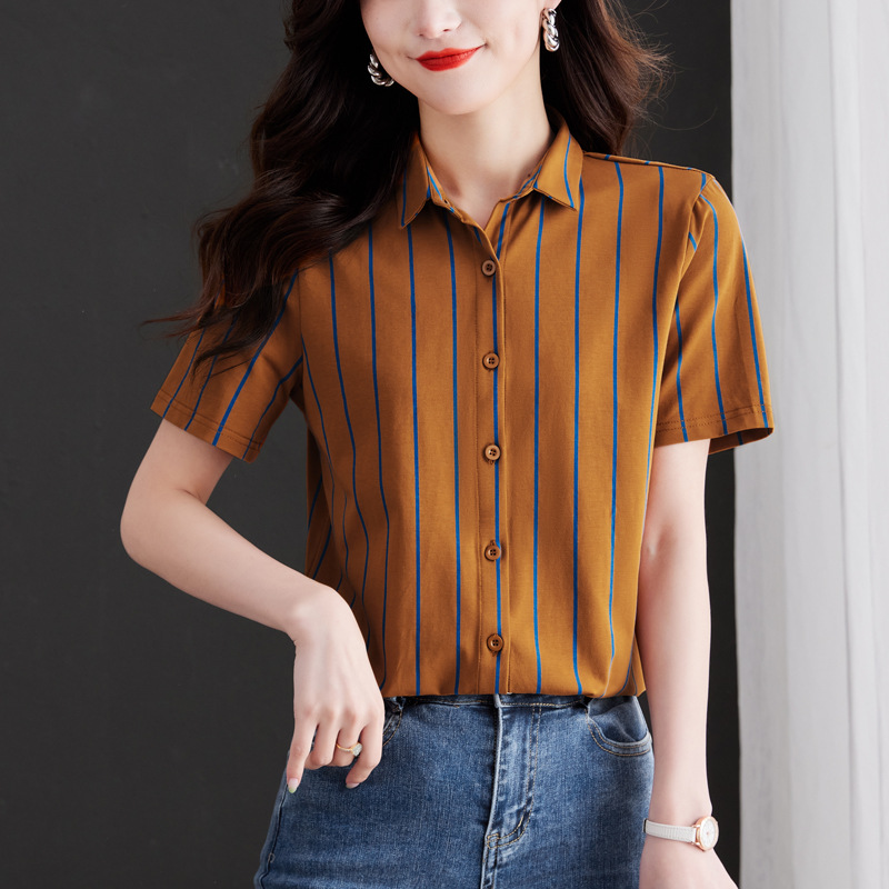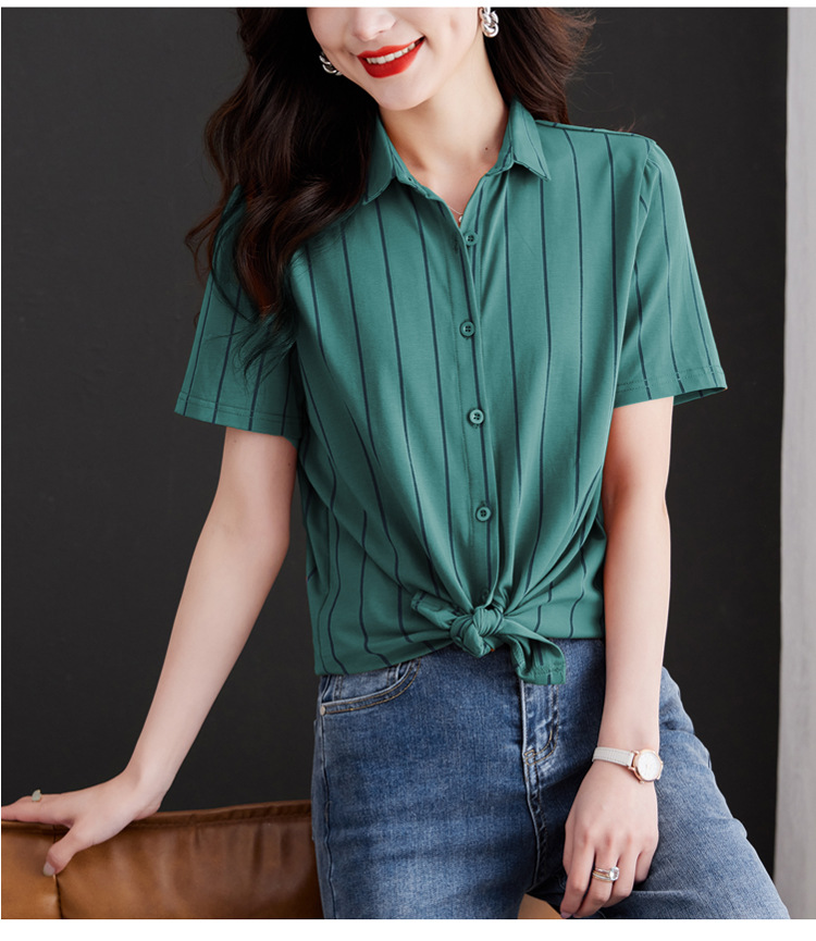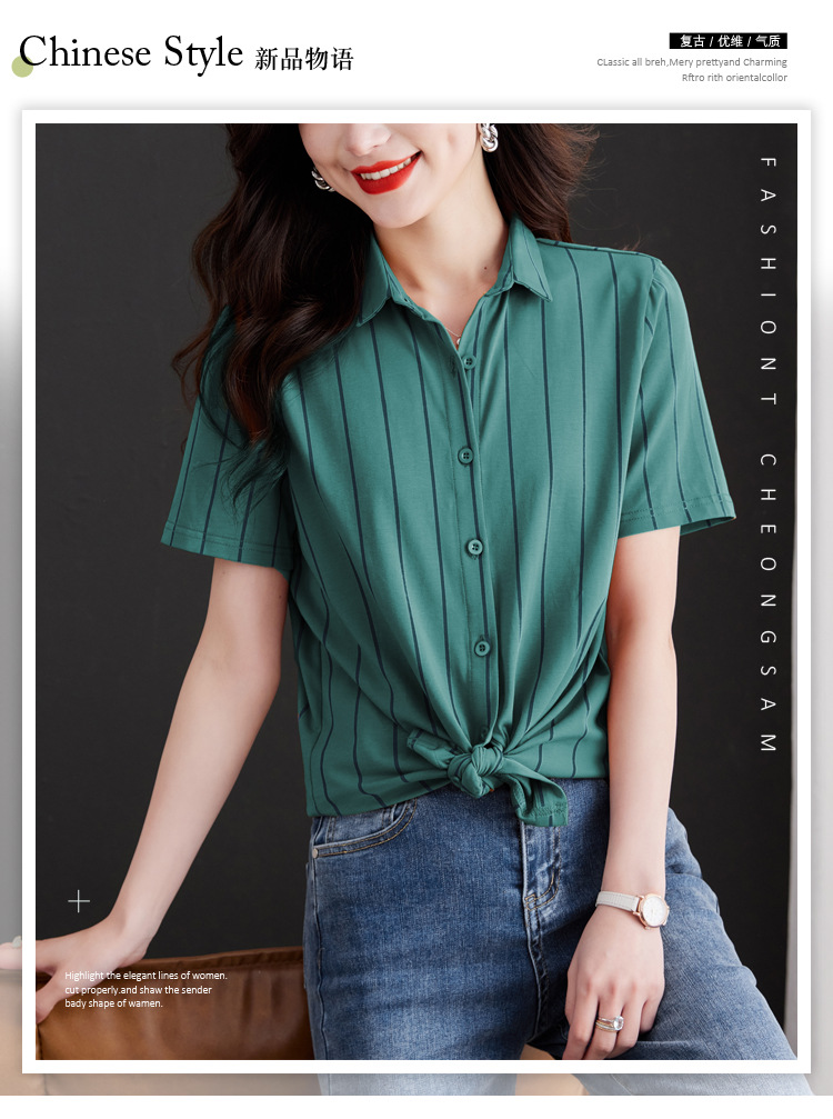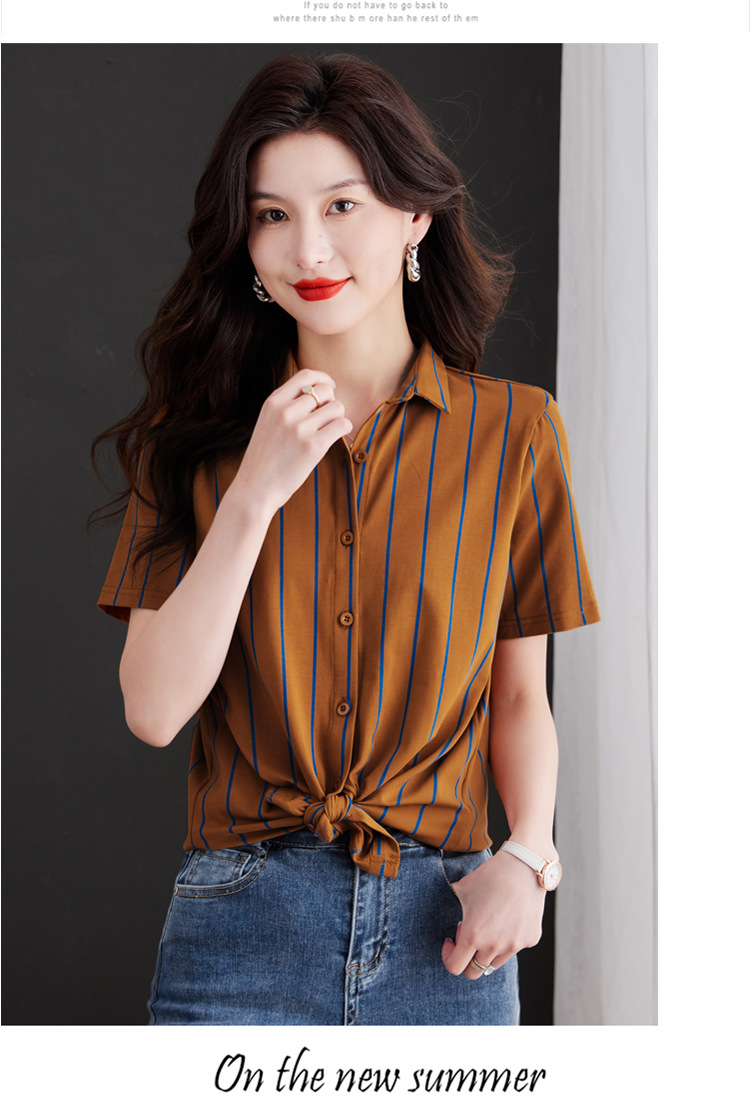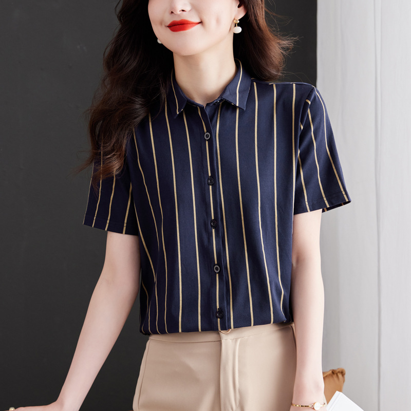프랑스 스타일 폴로 칼라 셔츠 여자 짧은 소매 여름 모든 경기 니트 줄무늬 셔츠 2024 새로운 느슨한 내부 탑