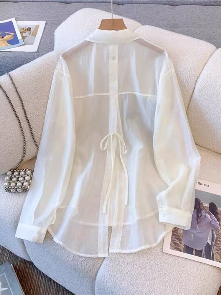 디자인 센스 백 슬릿 타이 아이스 실크 긴팔 자외선 차단 셔츠 여성 여름 루즈 틈새 아우터 에어컨 탑 얇은