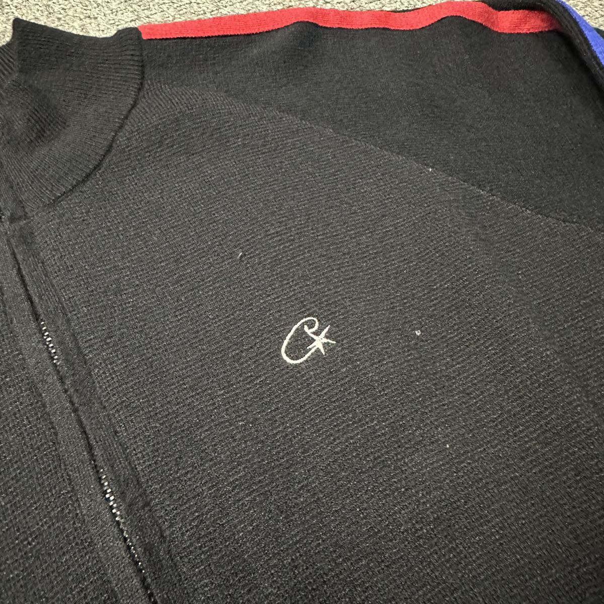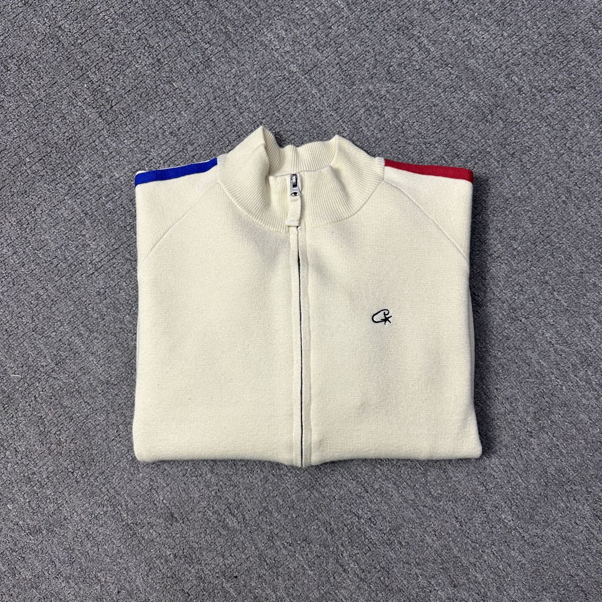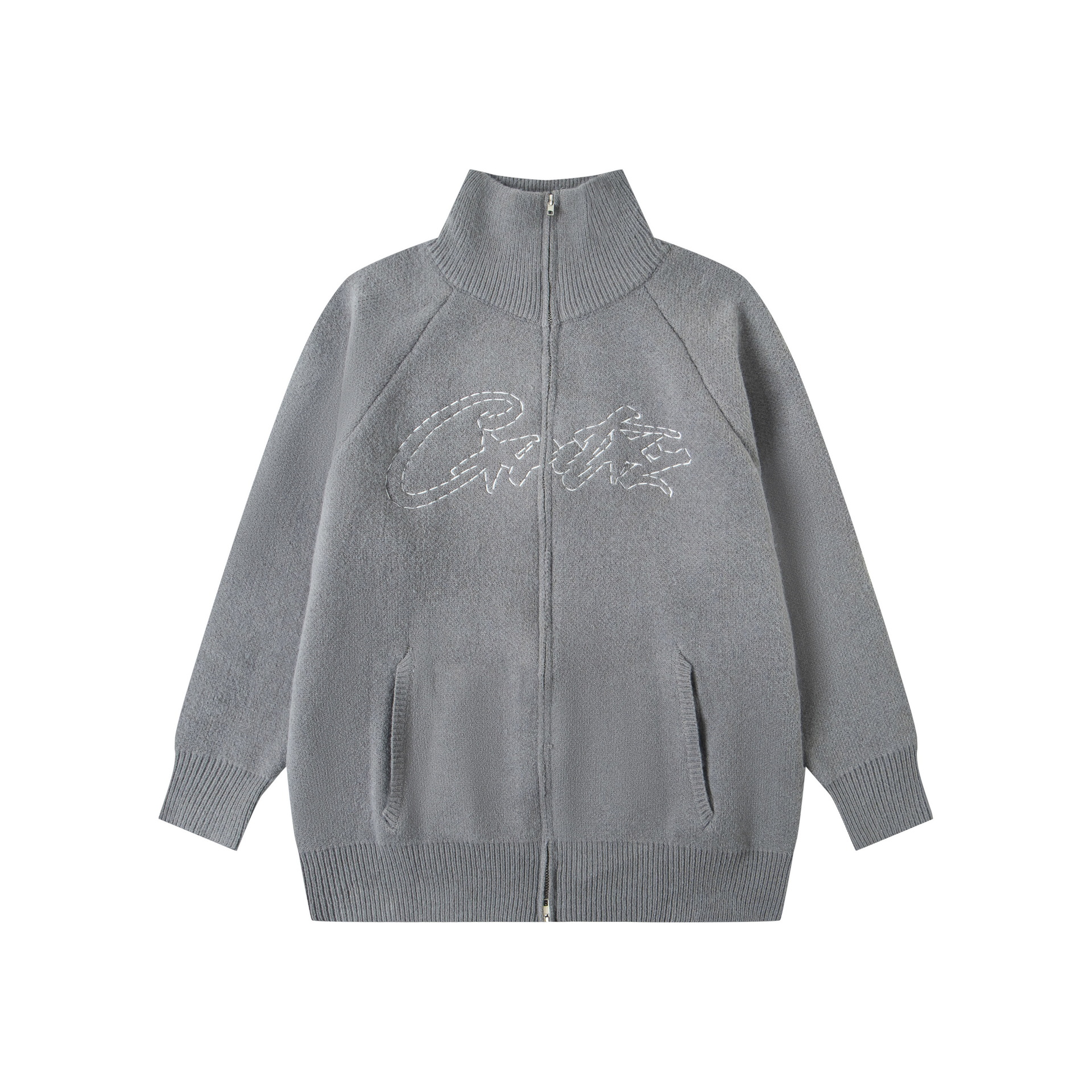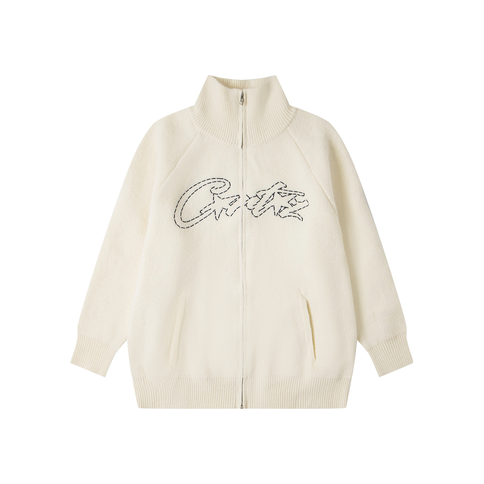 크로테이즈 스트리트 힙합 자수 레터링 스탠드 칼라 지퍼 레드 블루 트리밍 가디건 니트 스웨터 재킷