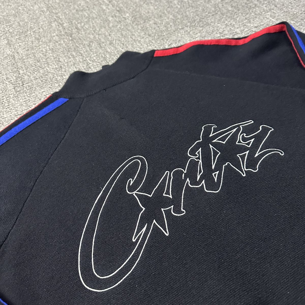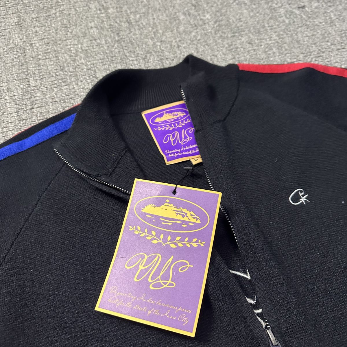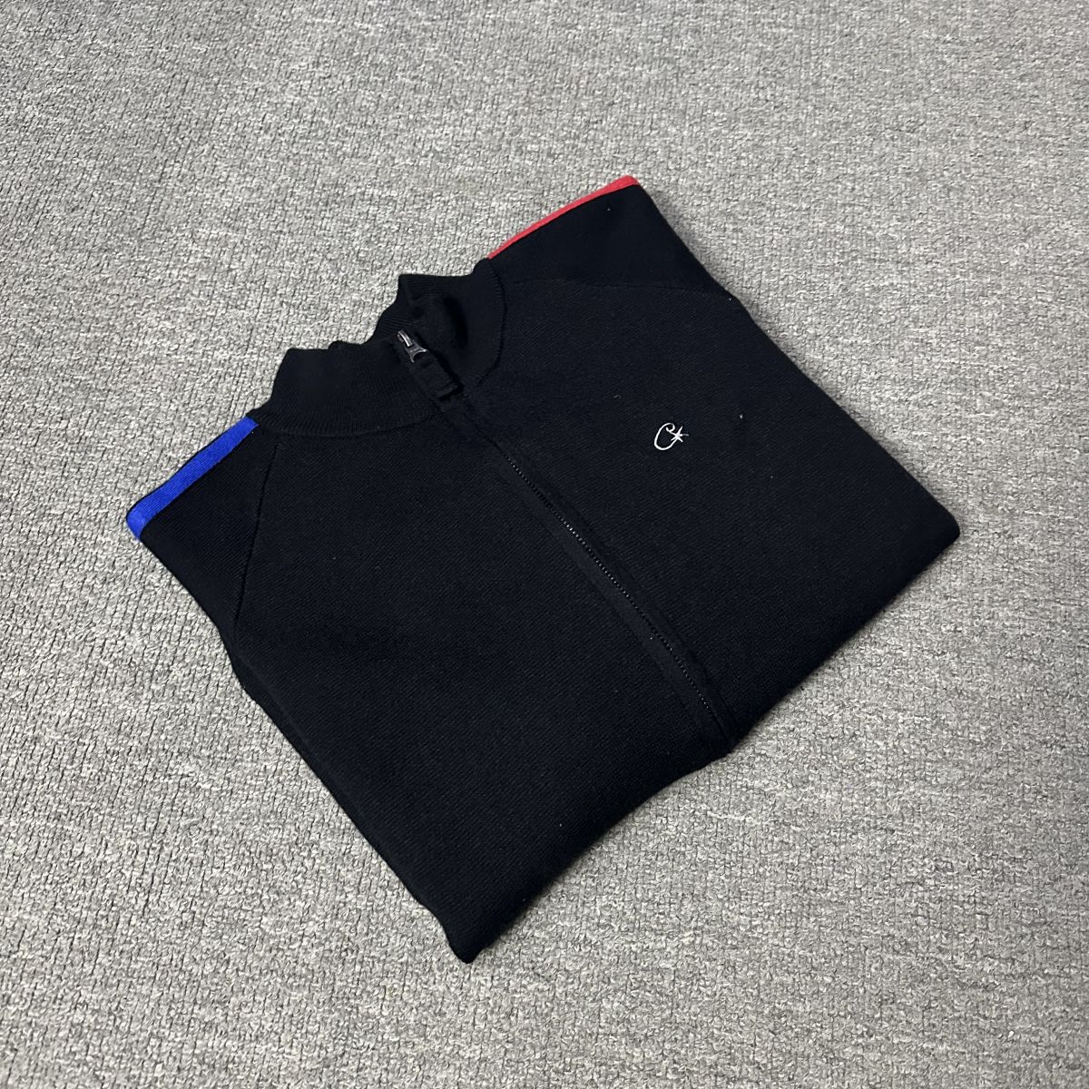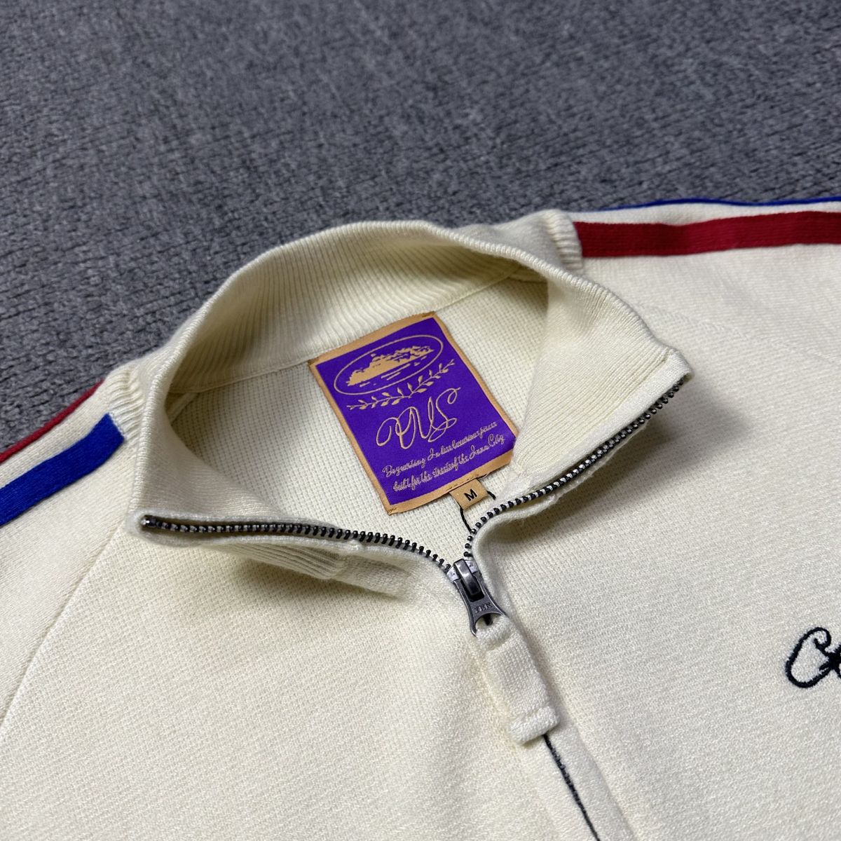 크로테이즈 스트리트 힙합 자수 레터링 스탠드 칼라 지퍼 레드 블루 트리밍 가디건 니트 스웨터 재킷