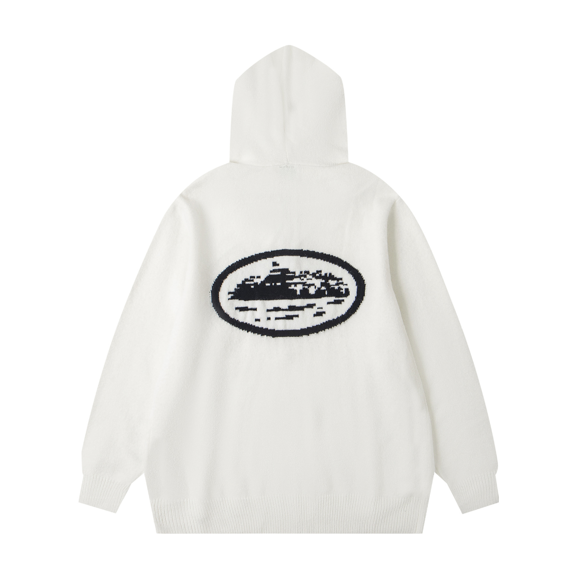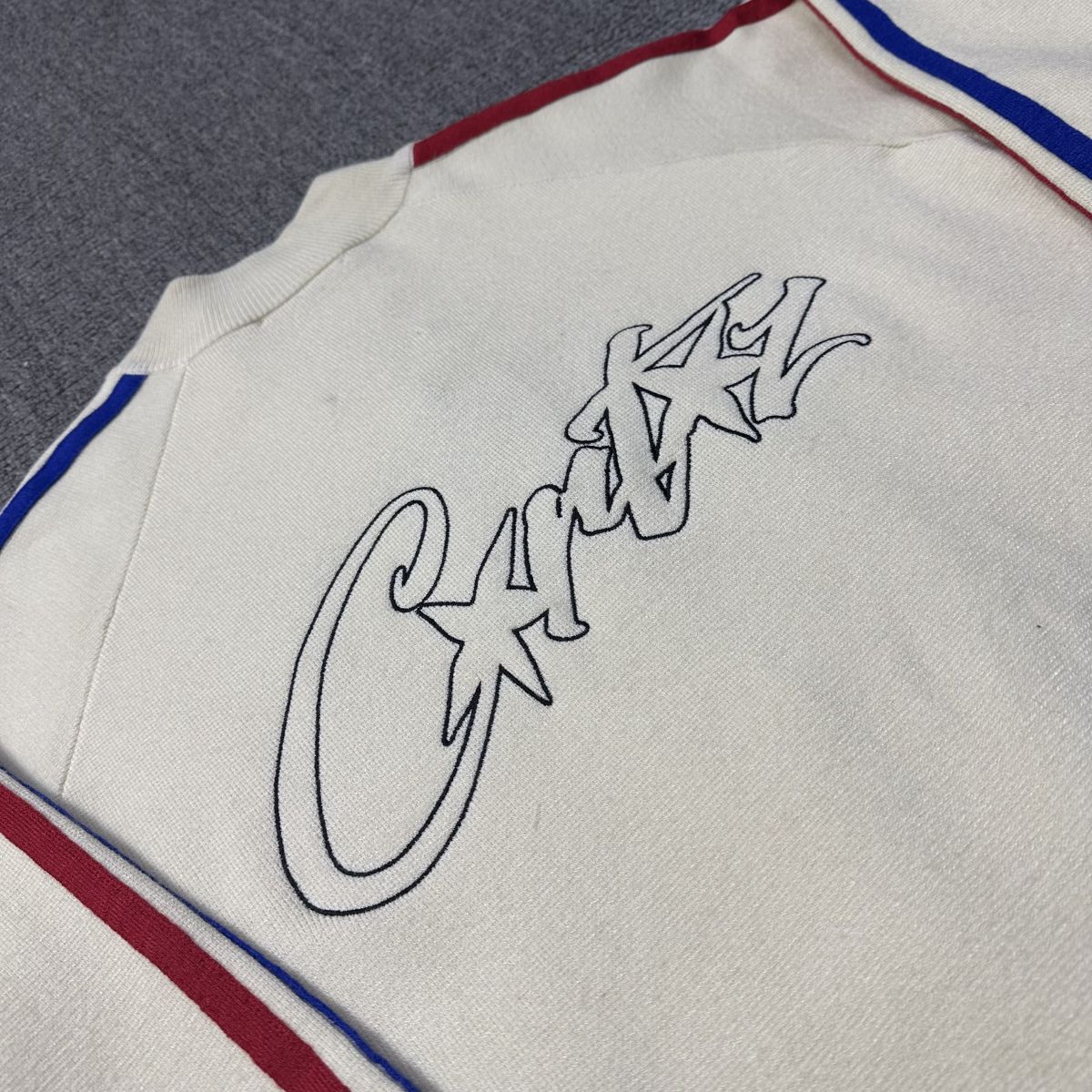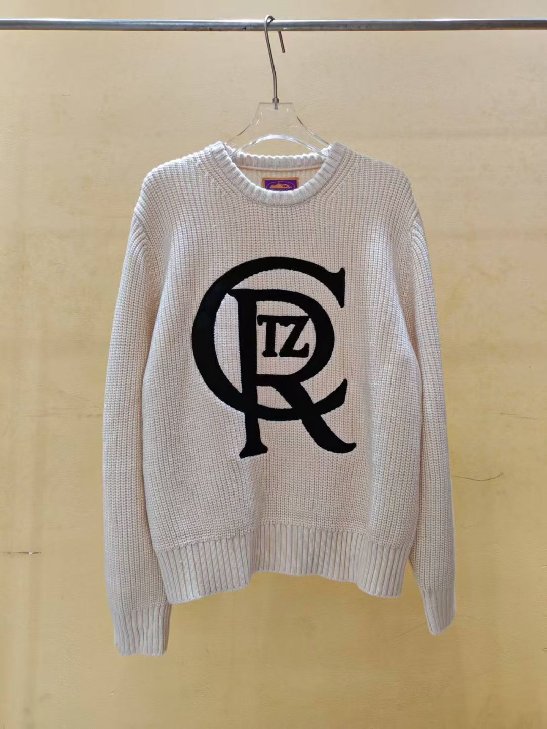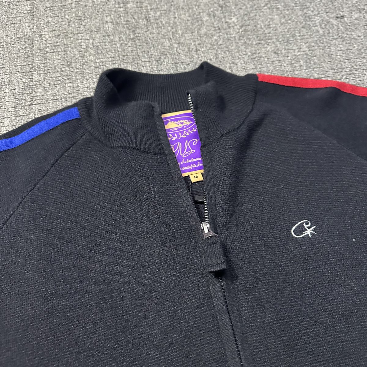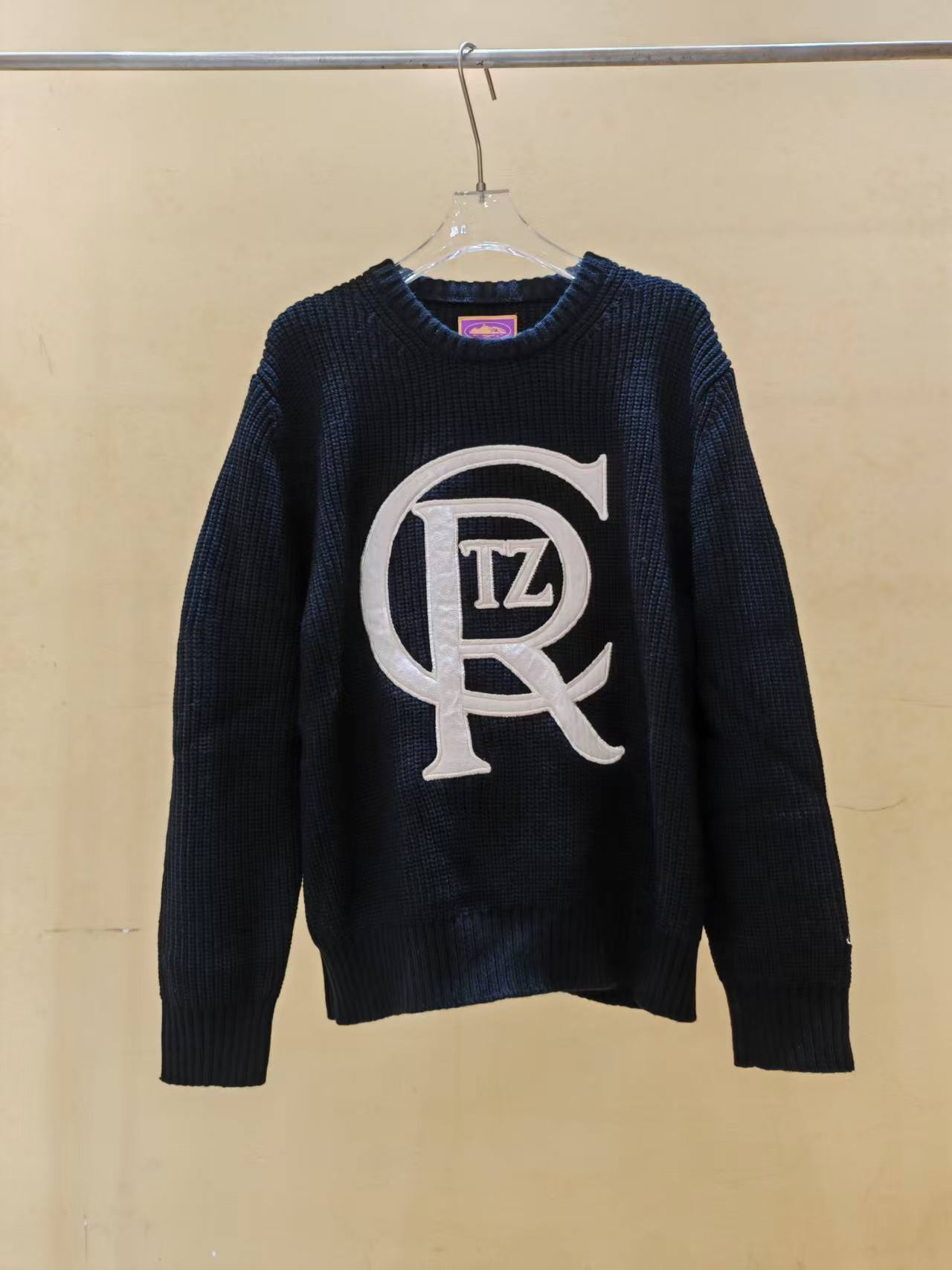 크로테이즈 스트리트 힙합 자수 레터링 스탠드 칼라 지퍼 레드 블루 트리밍 가디건 니트 스웨터 재킷