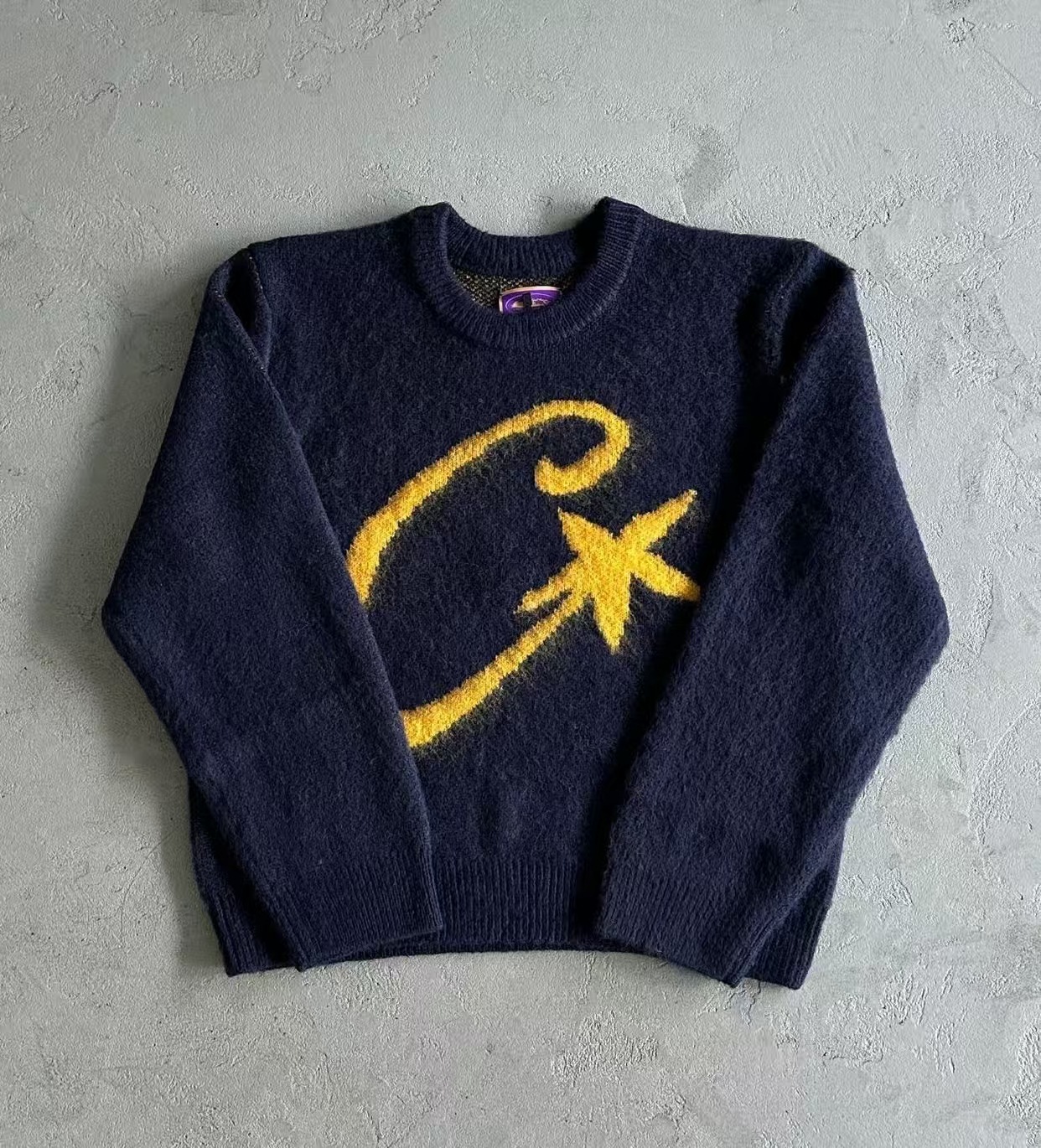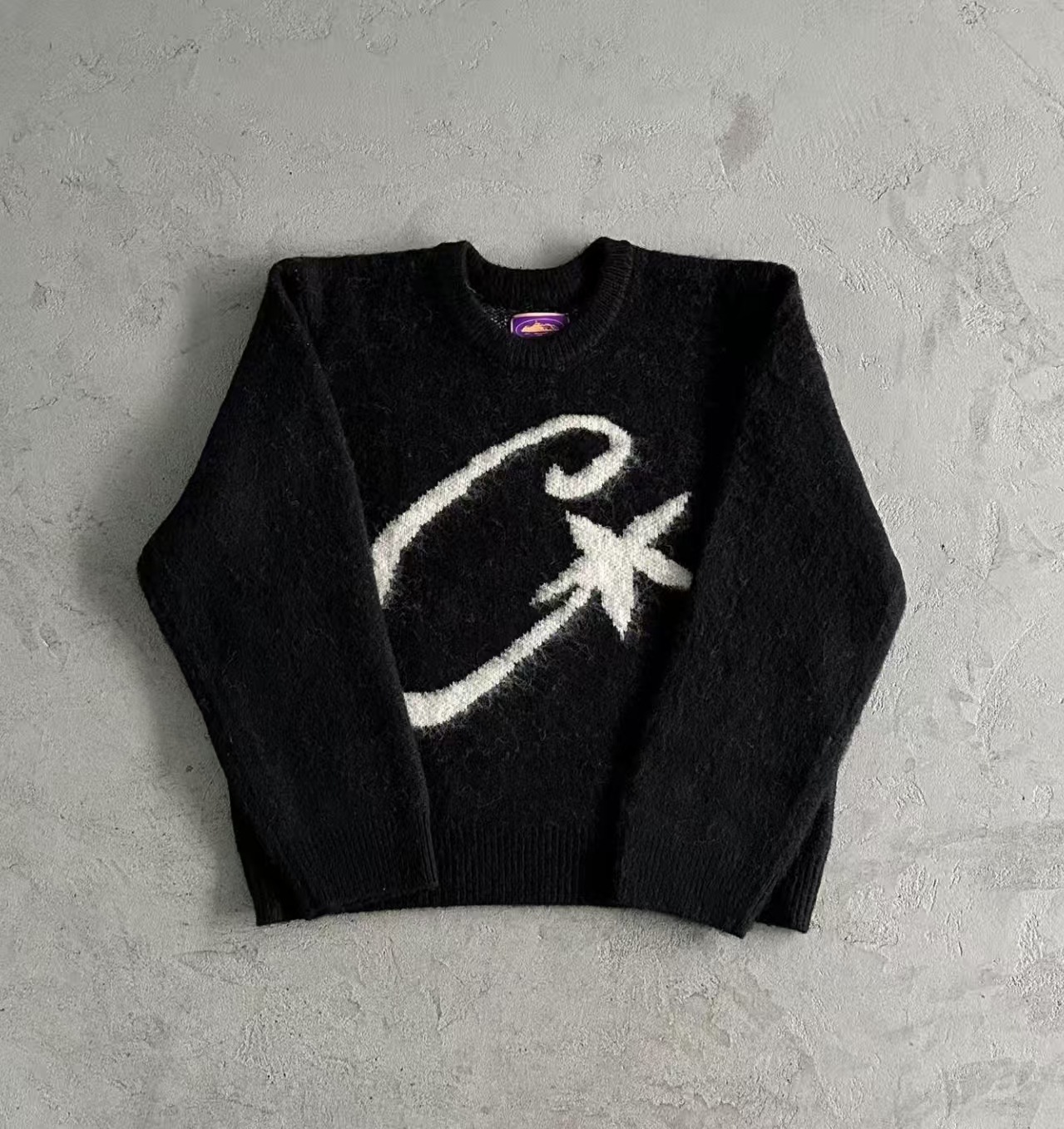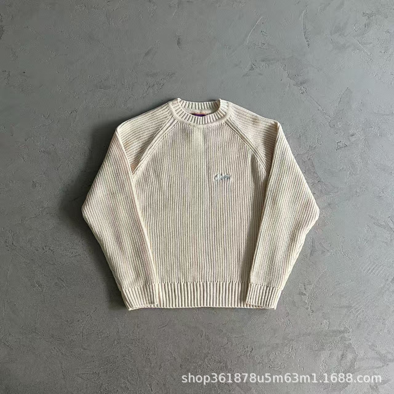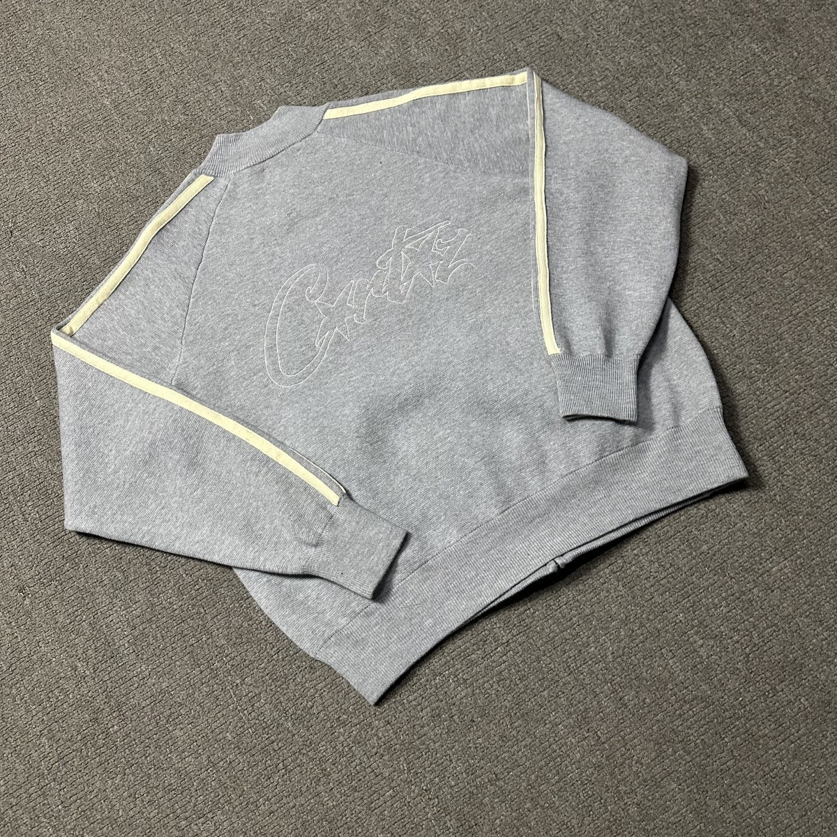 크로테이즈 스트리트 힙합 자수 레터링 스탠드 칼라 지퍼 레드 블루 트리밍 가디건 니트 스웨터 재킷