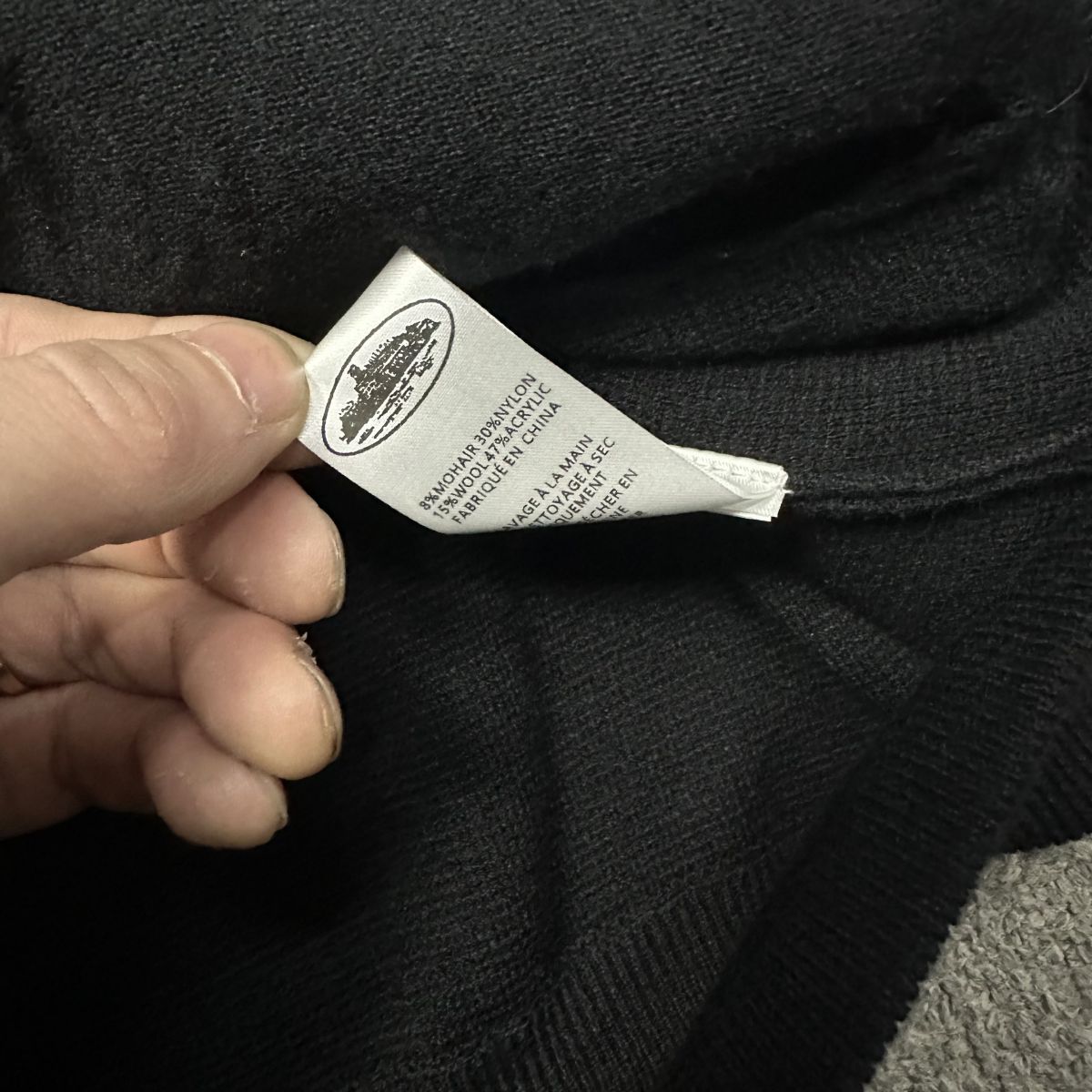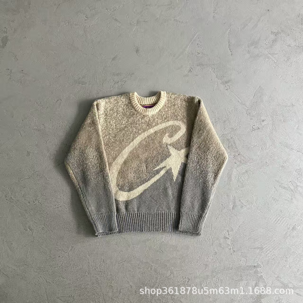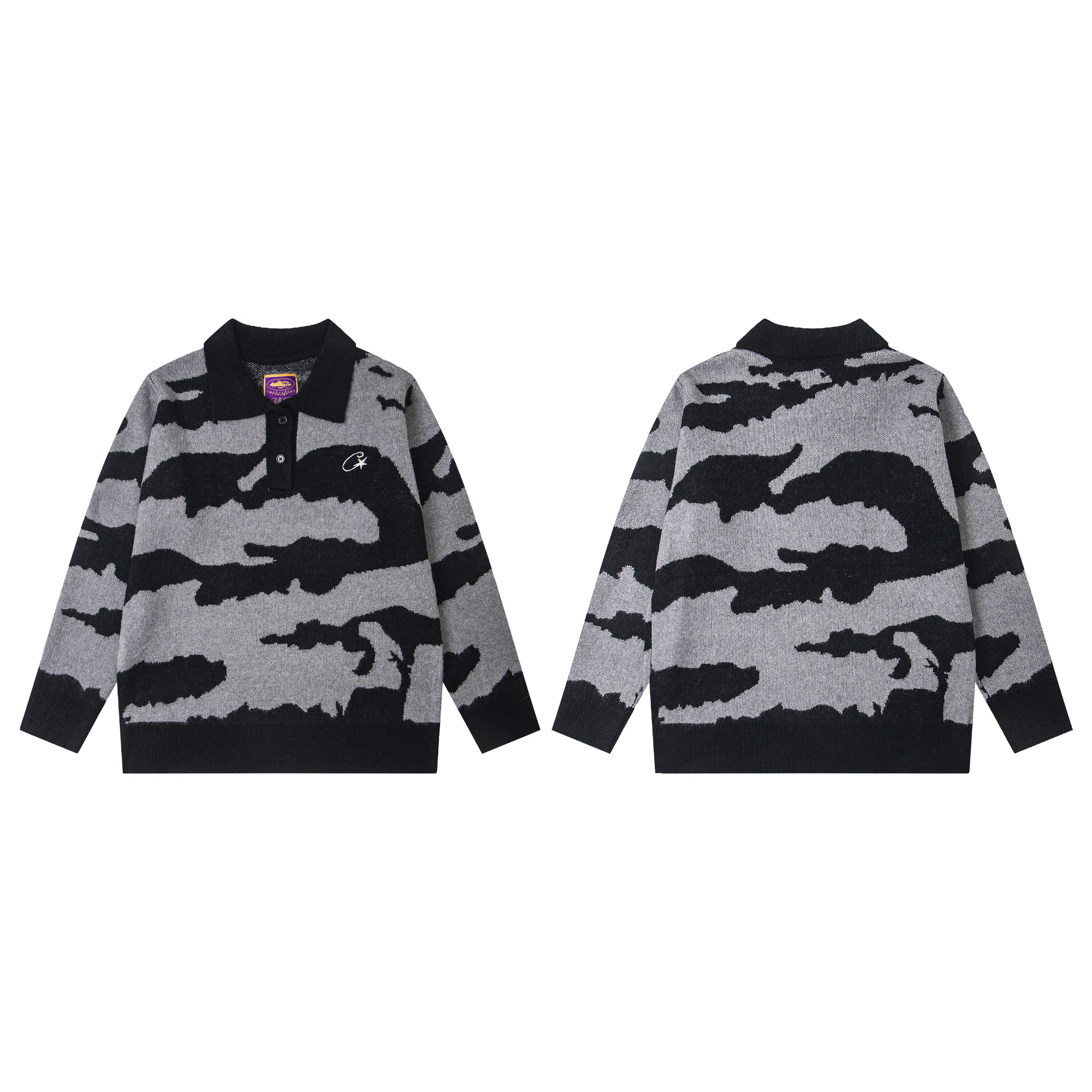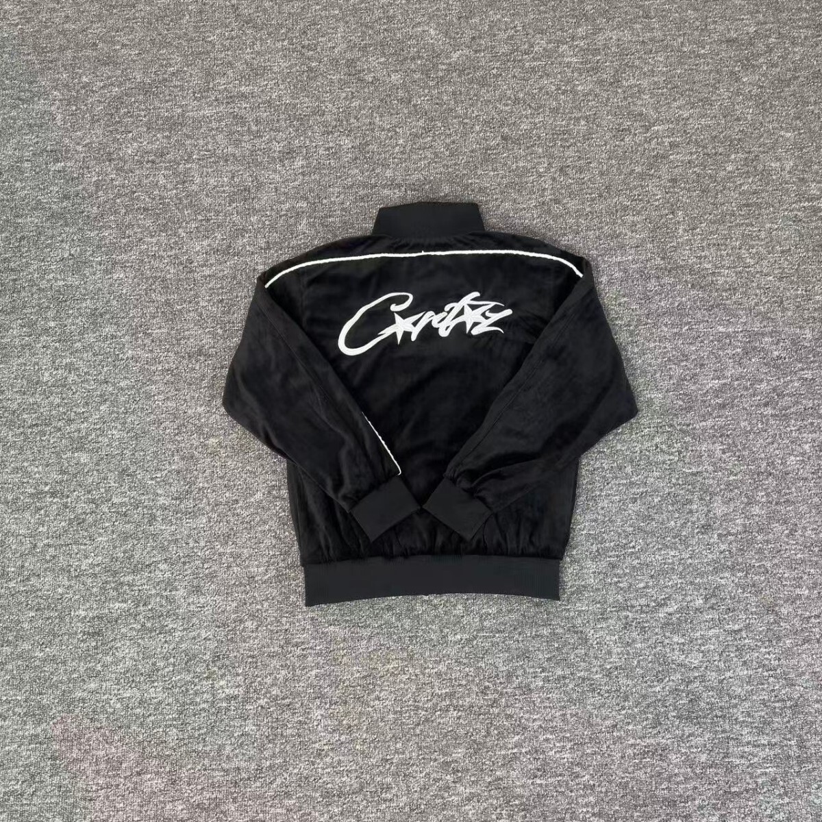 크로테이즈 스트리트 힙합 자수 레터링 스탠드 칼라 지퍼 레드 블루 트리밍 가디건 니트 스웨터 재킷