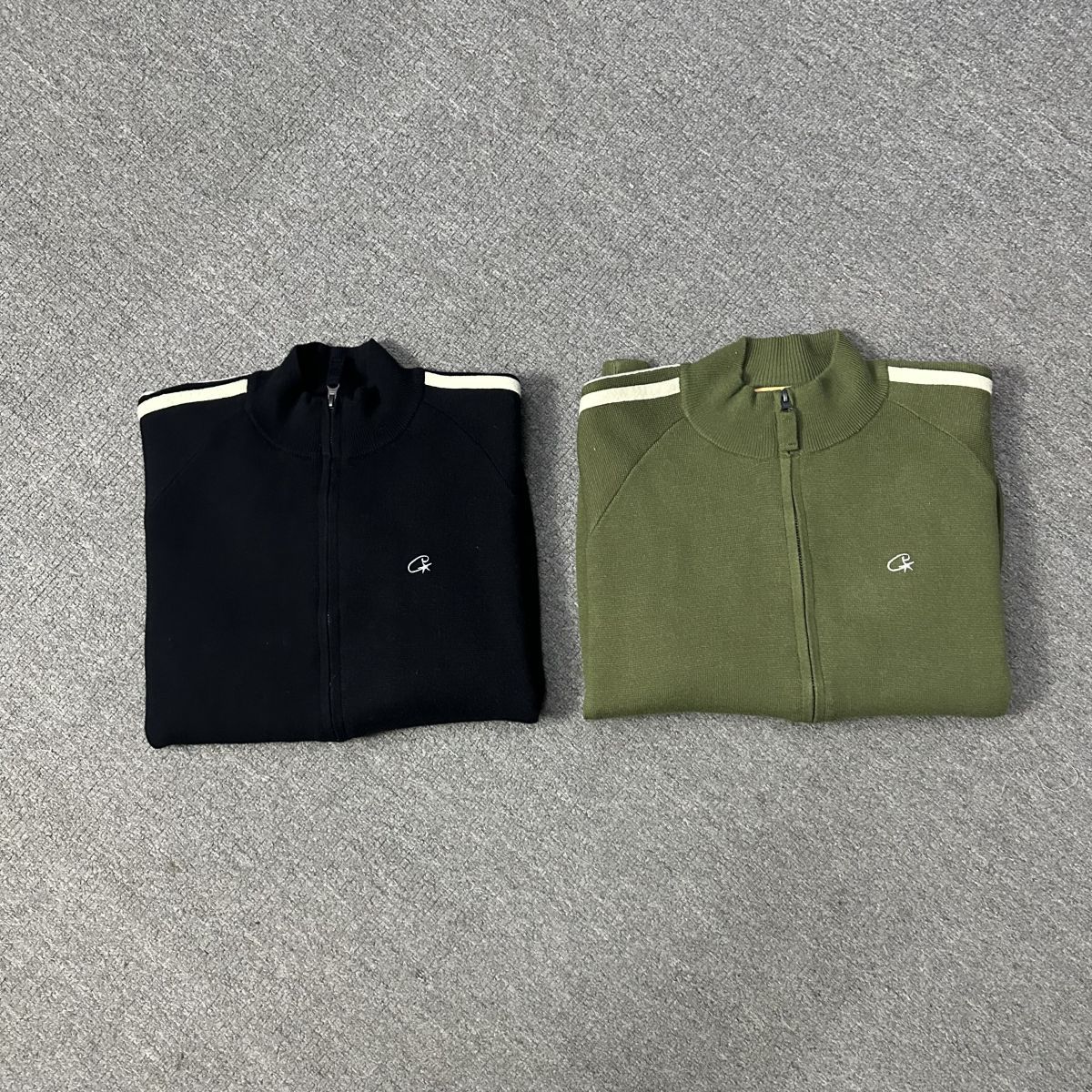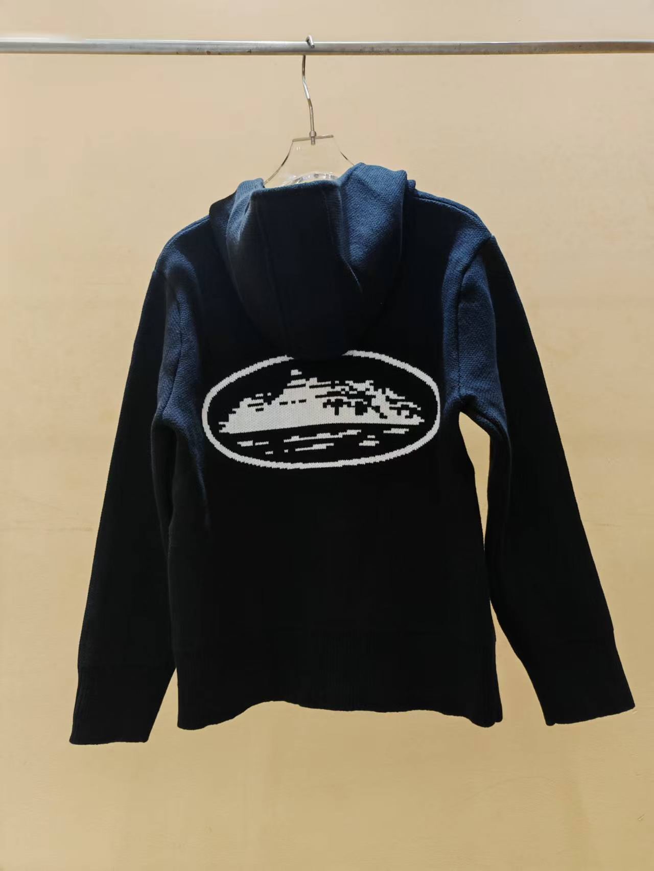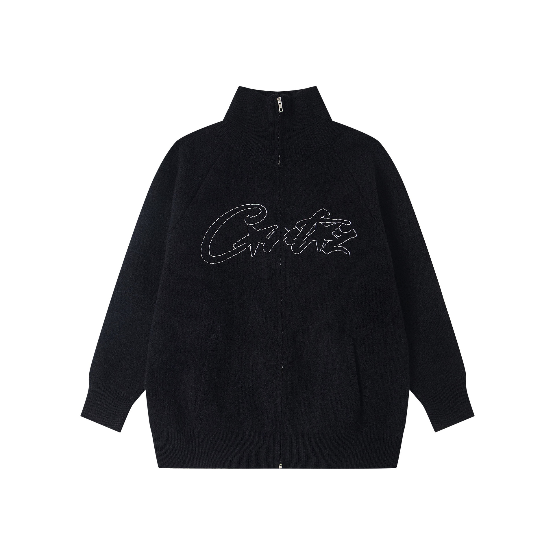 크로테이즈 스트리트 힙합 자수 레터링 스탠드 칼라 지퍼 레드 블루 트리밍 가디건 니트 스웨터 재킷스토어 가기