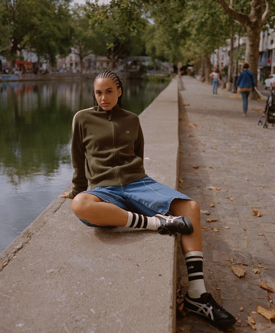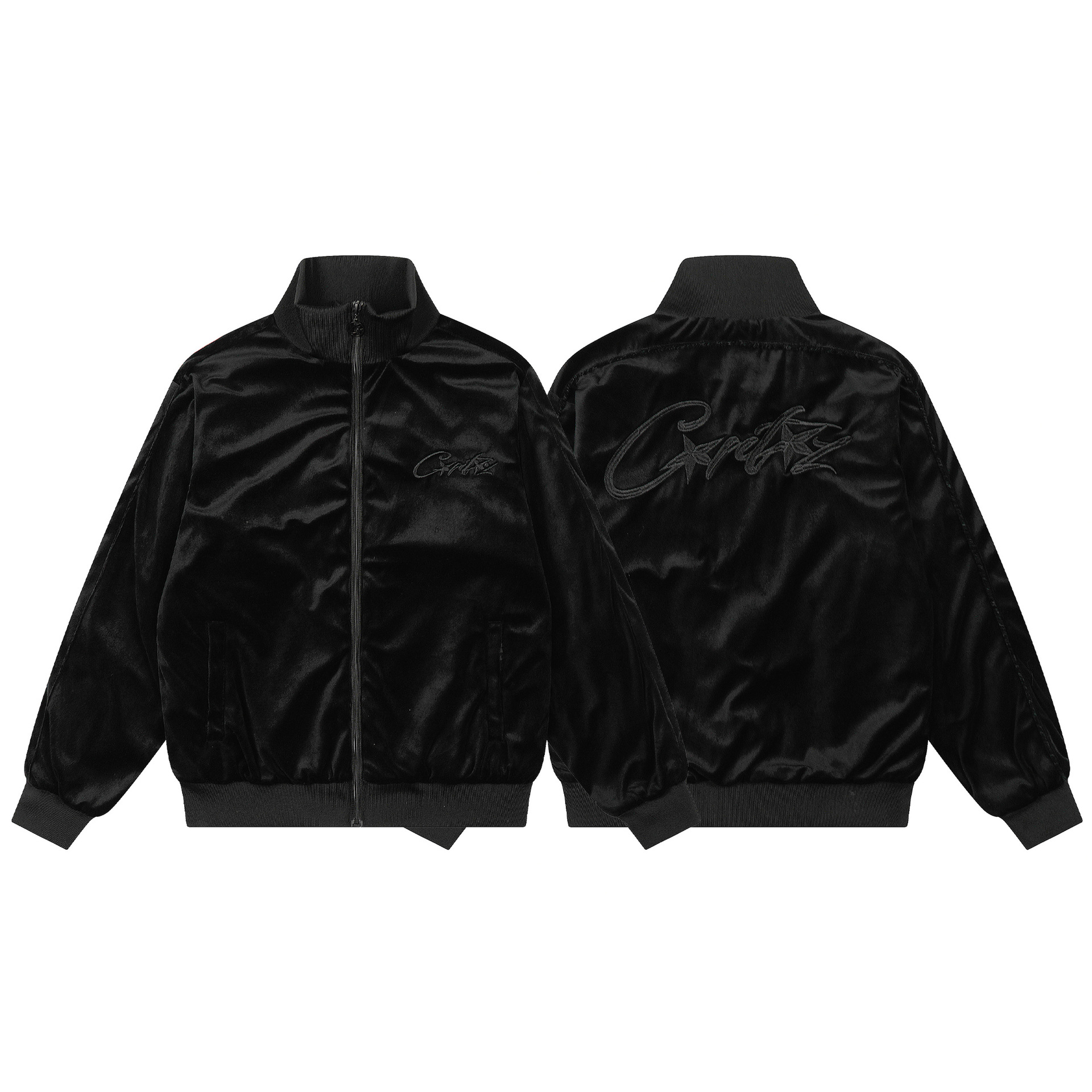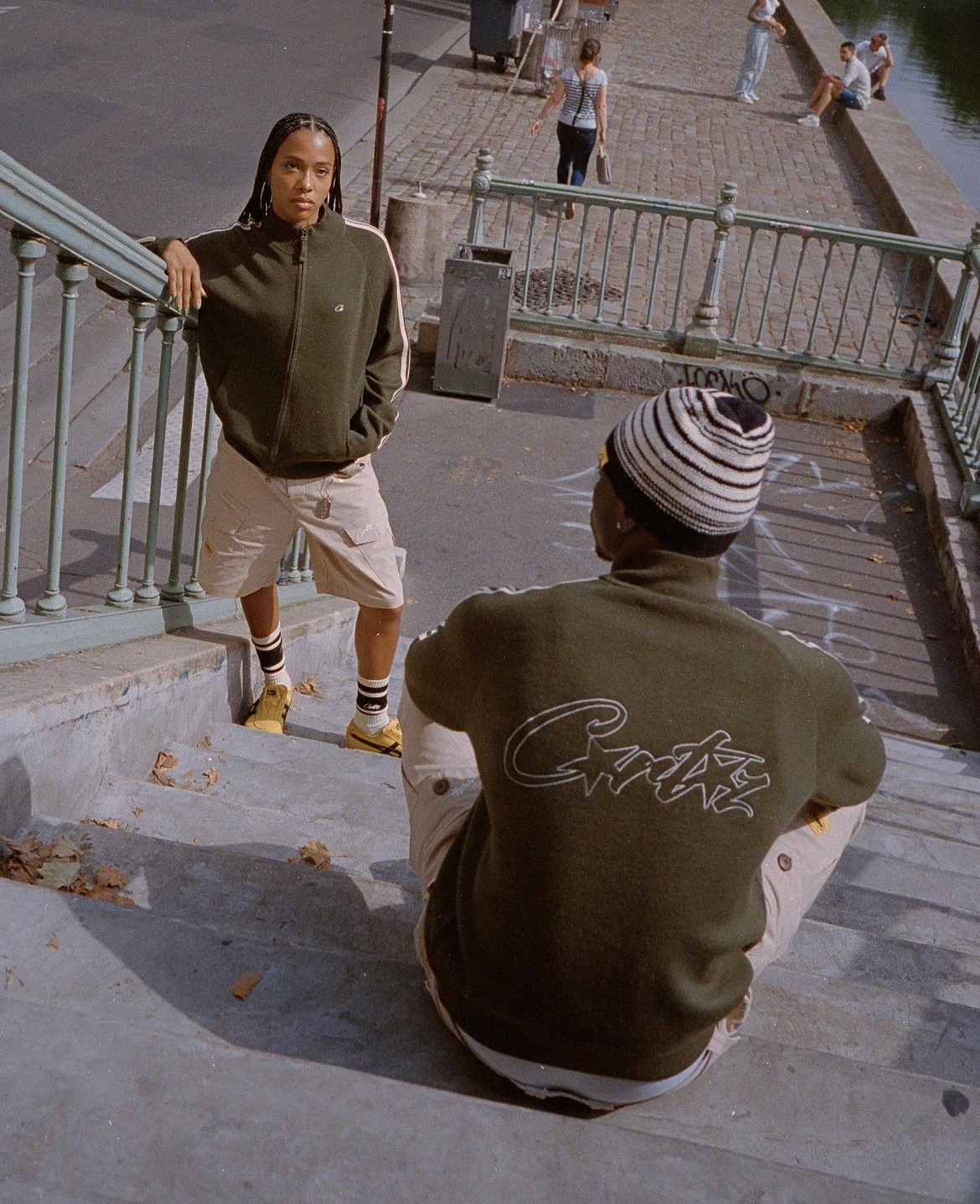 크로테이즈 스트리트 힙합 자수 레터링 스탠드 칼라 지퍼 레드 블루 트리밍 가디건 니트 스웨터 재킷스토어 가기