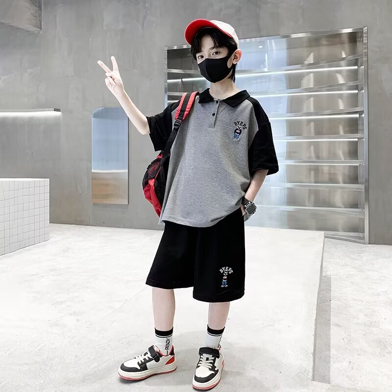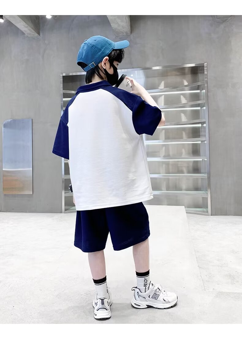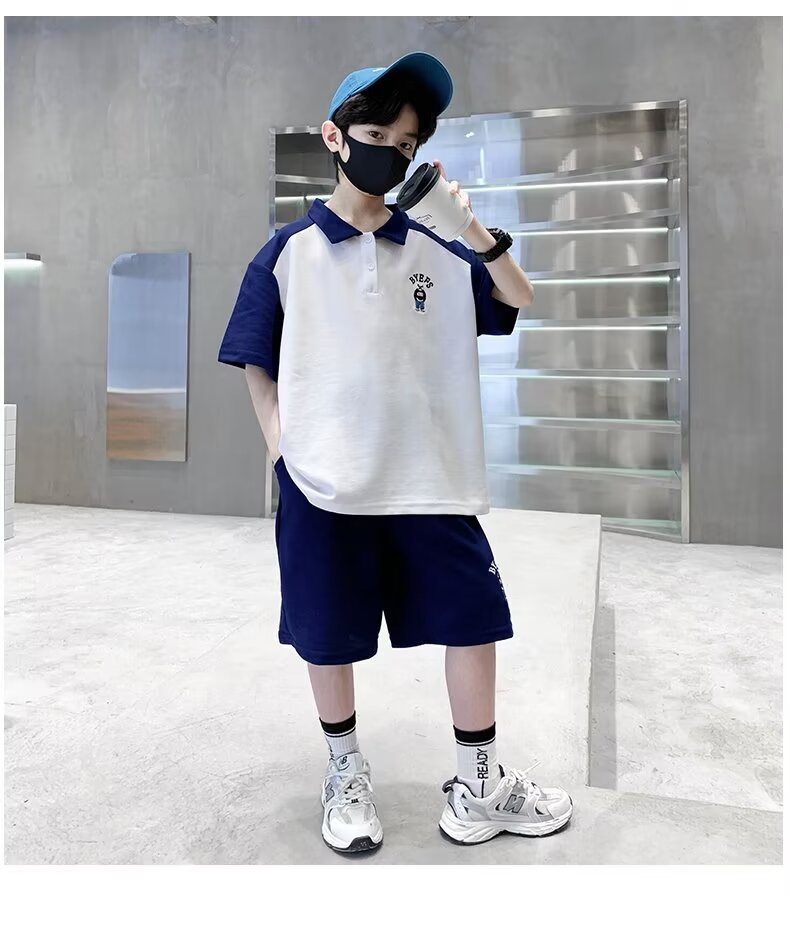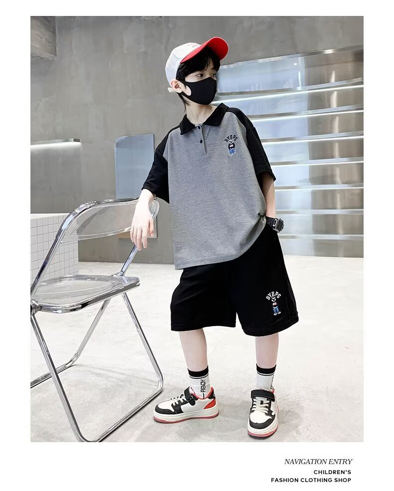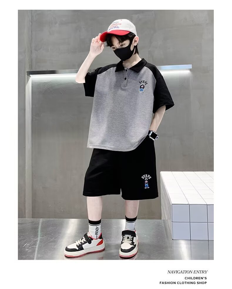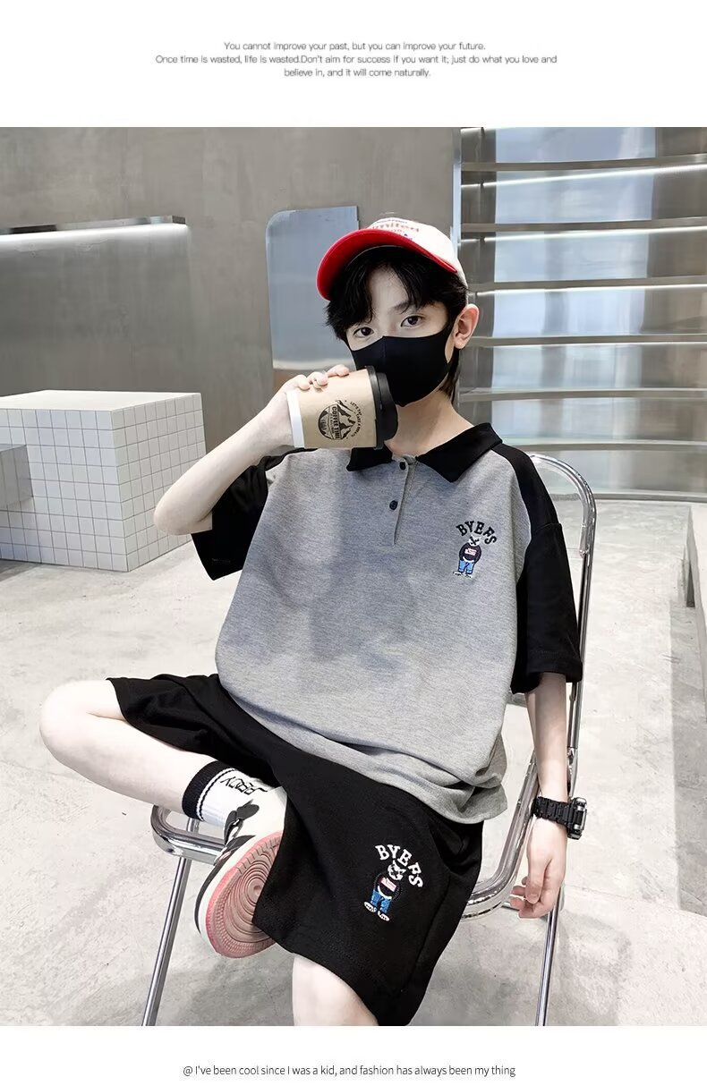 남학생 여름 착용 세트 2024 새로운 도착 소년 어린이 여름 반팔 폴로 셔츠 스포츠 잘 생긴 유행스토어 가기