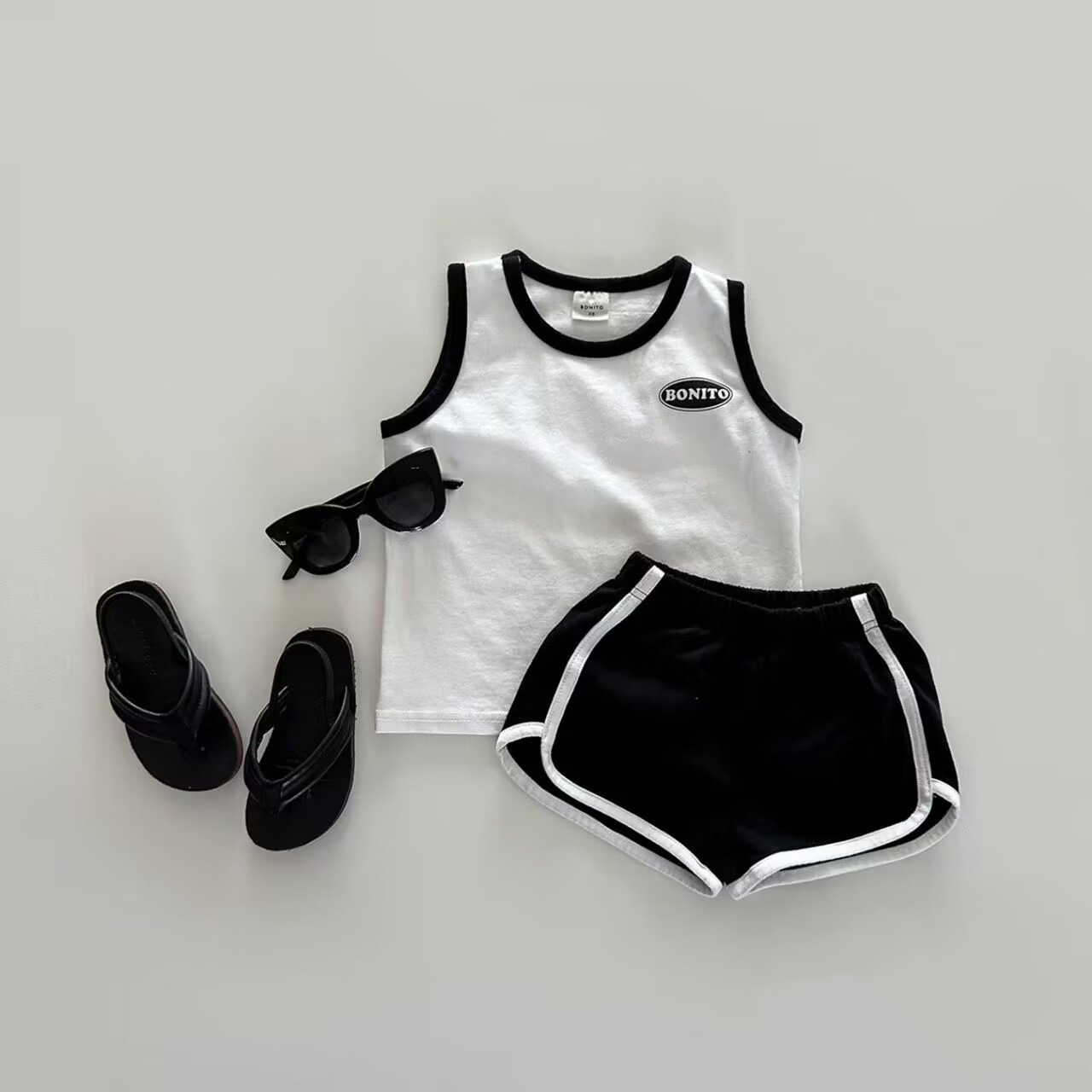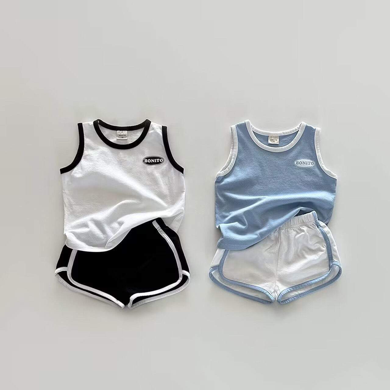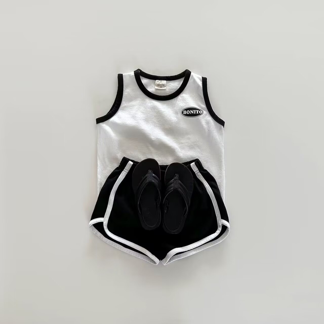 남학생과 여학생을위한 간단한 올 매치 인쇄 솔리드 컬러 영어 알파벳 세트 인 한국 스타일 조끼 아기 여름 필요스토어 가기