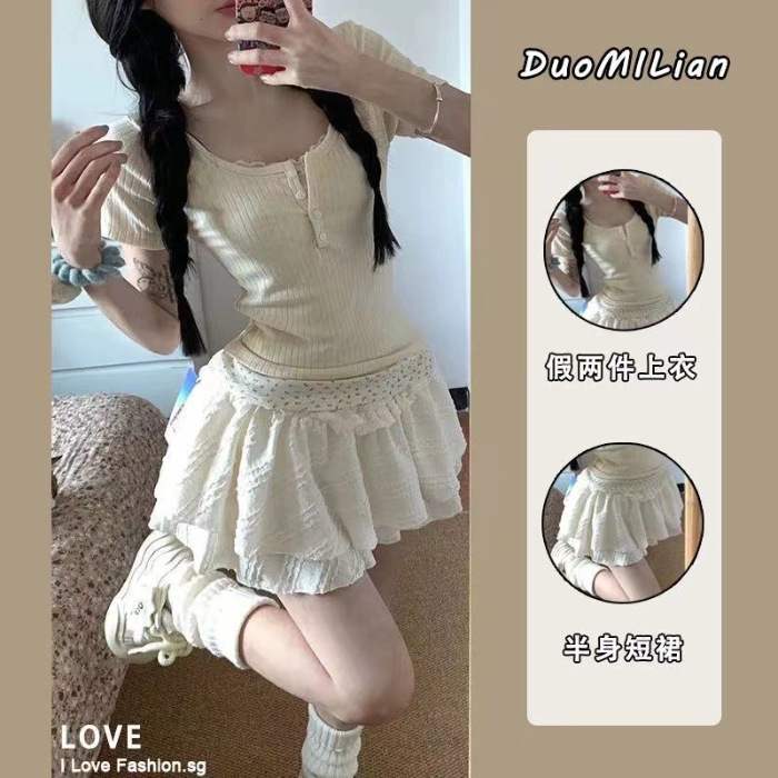 한국식 핫 걸은 세트 여성 여름 가짜 투피스 꽃 스티칭 반팔 티셔츠 부풀린 케이크 스커트 세트를 착용합니다.스토어 가기