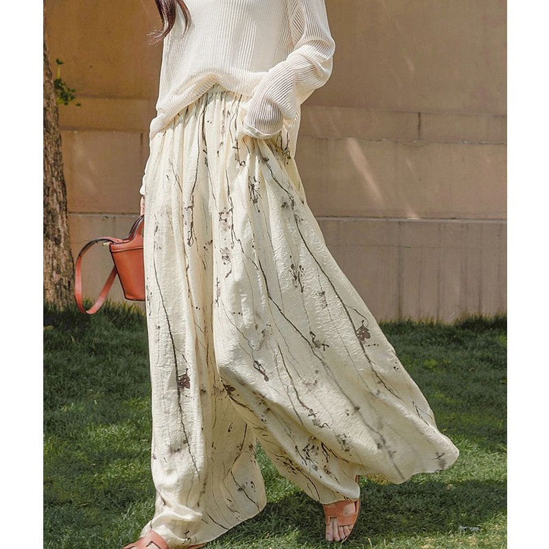 새로운 중국 스타일 레트로 슬리밍 허리 넓은 다리 바지 여름 아이스 텐셀 잉크 인쇄 바지스토어 가기