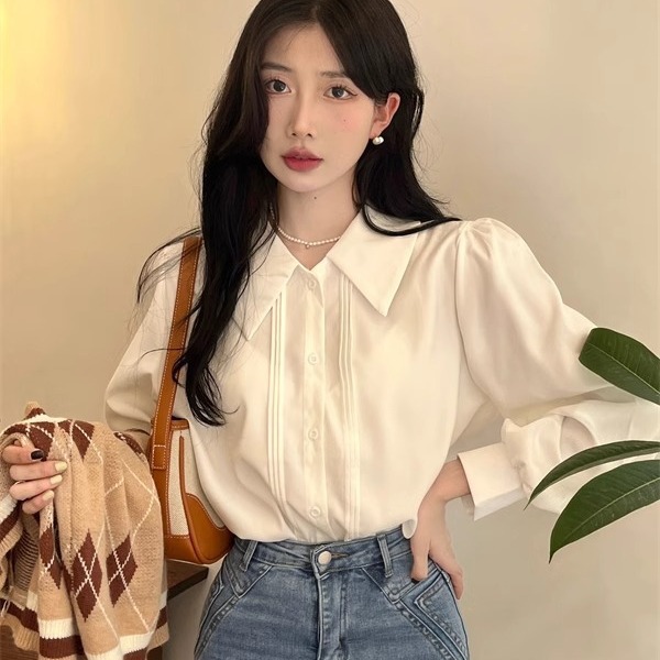 하이 엔드 화이트 셔츠 여성의 봄과 가을 인테리어 디자인 틈새 폴로 칼라 긴팔 셔츠 독특한 쉬폰 탑스토어 가기