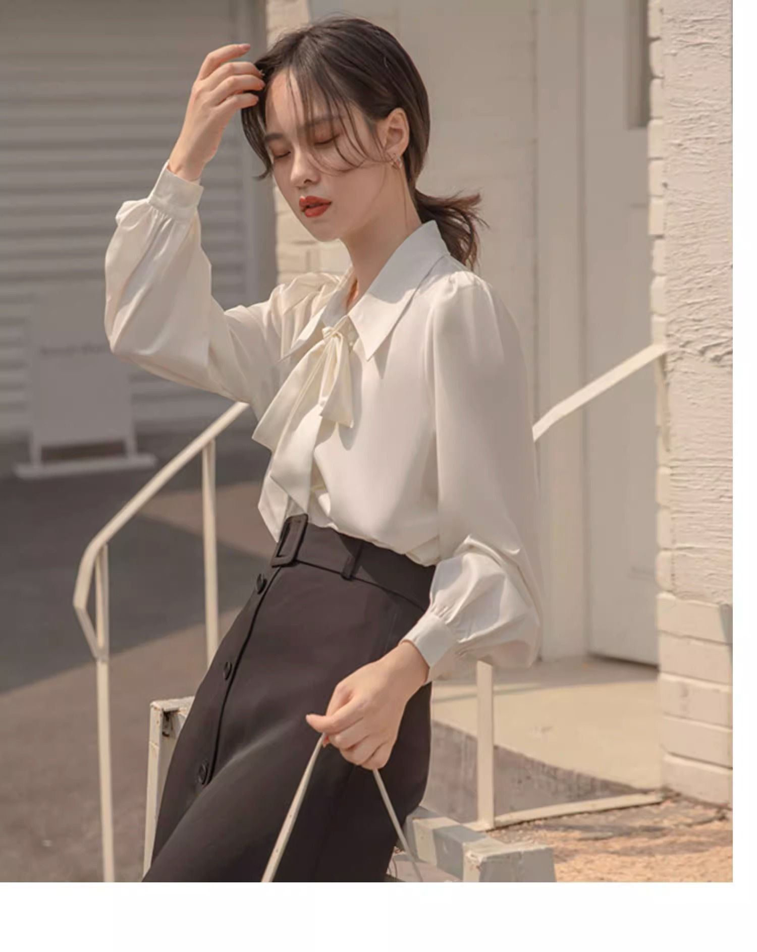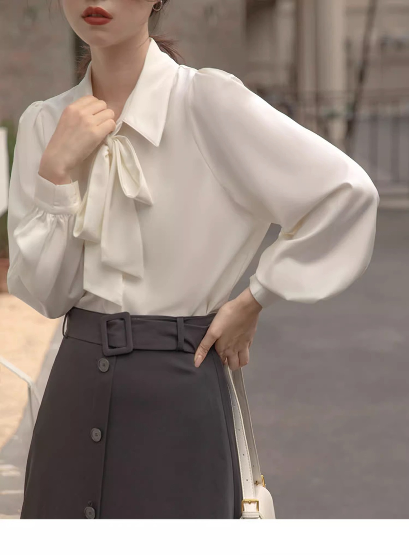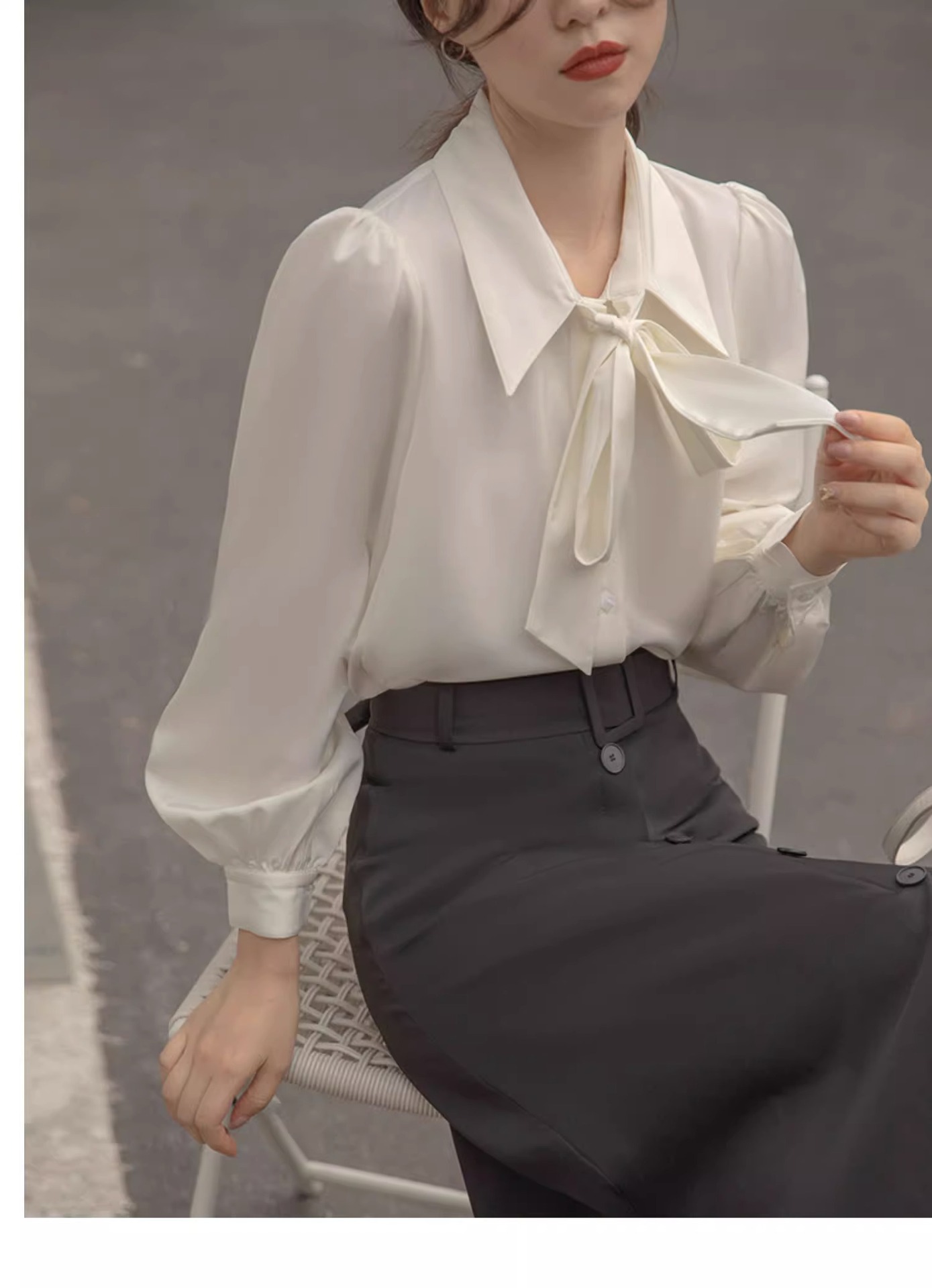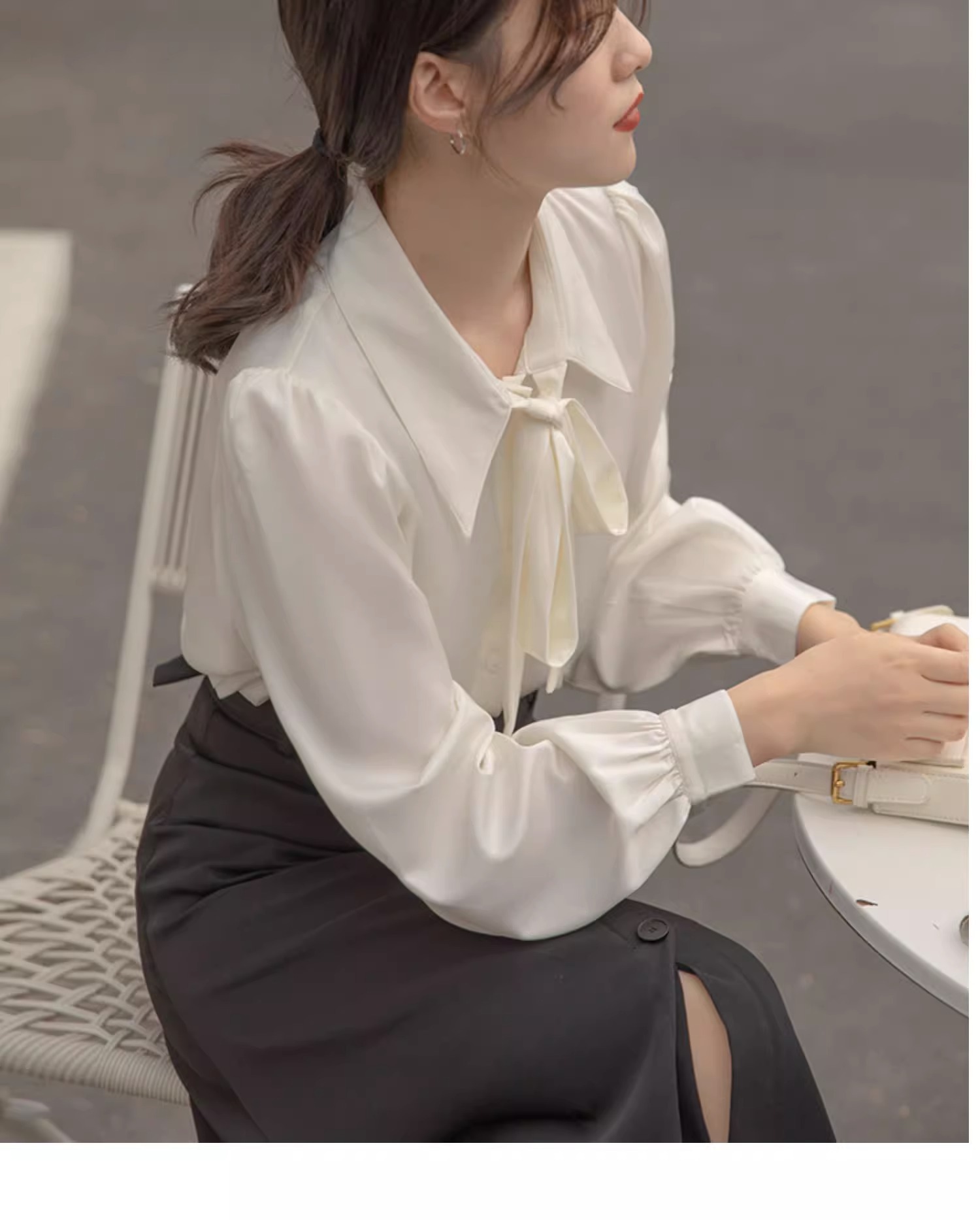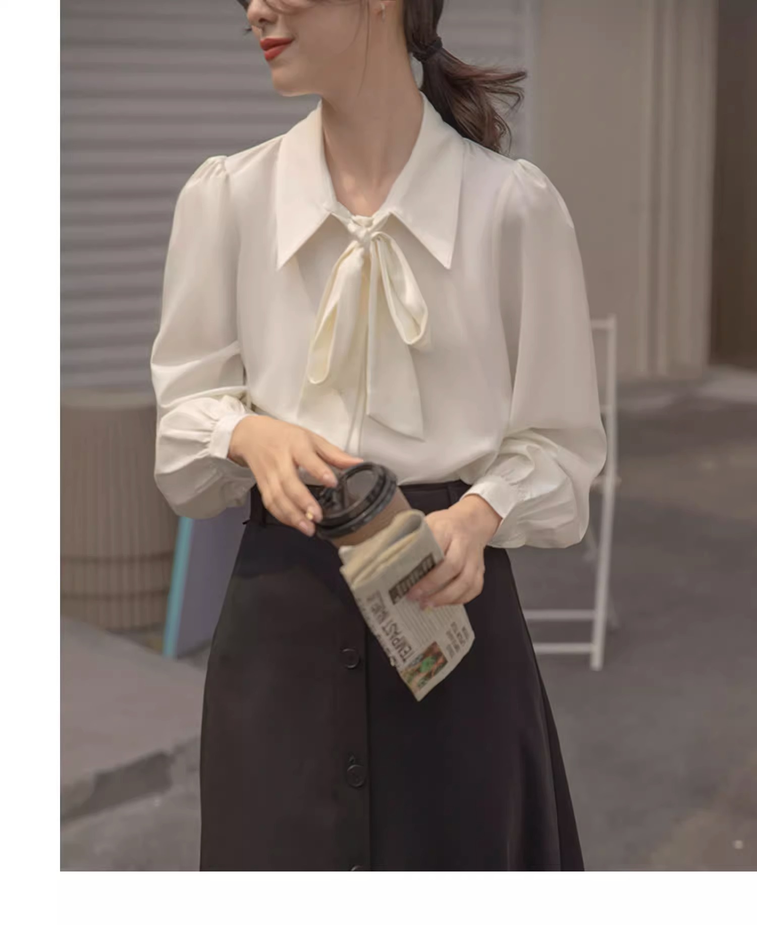 2025 봄, 가을 새로운 스타일 랜턴 슬리브 보우 셔츠 화이트 이너 셔츠 여성 정장 레이스 업 디자인 탑스토어 가기