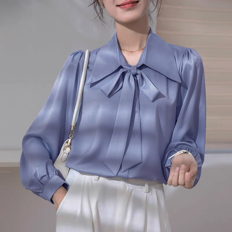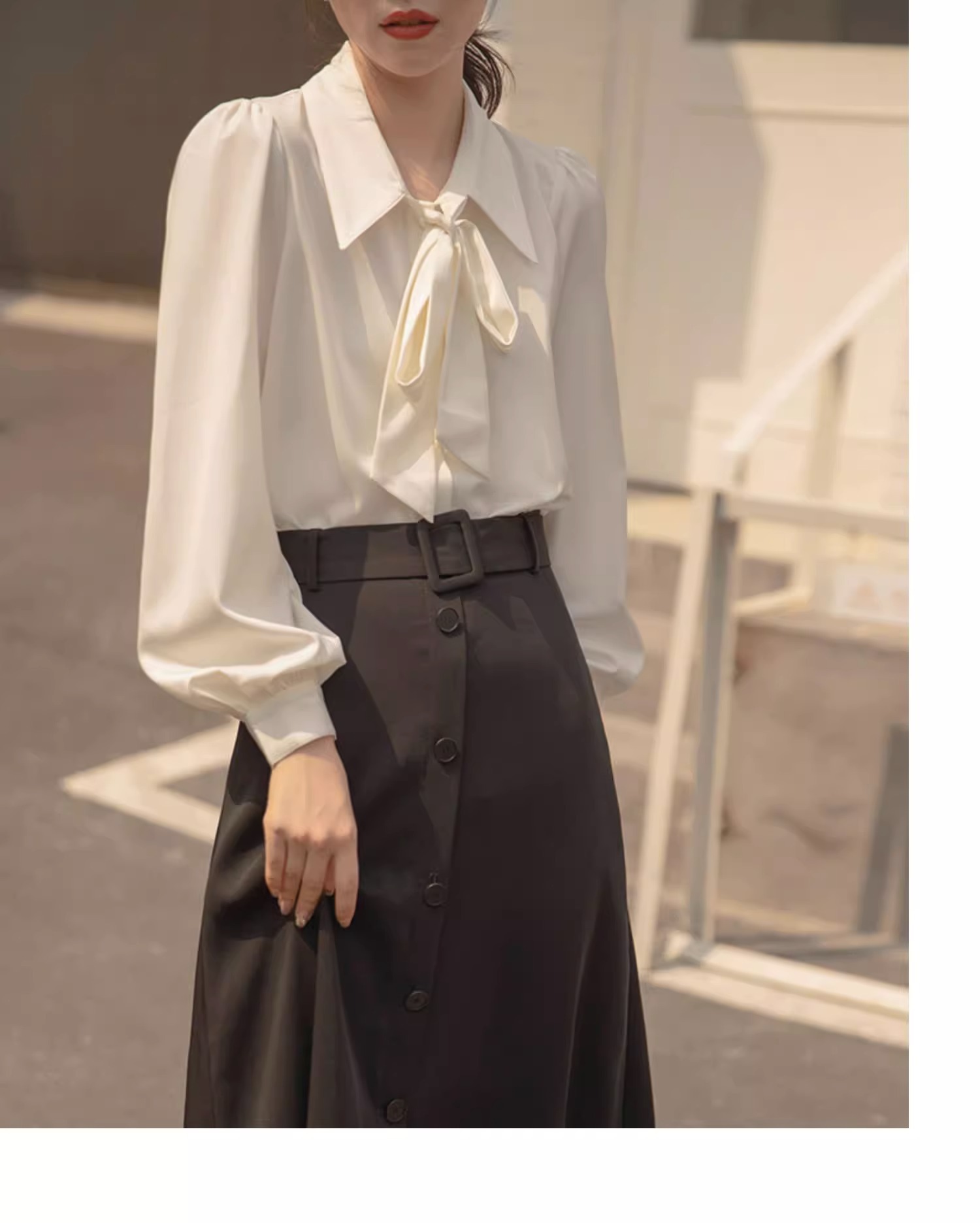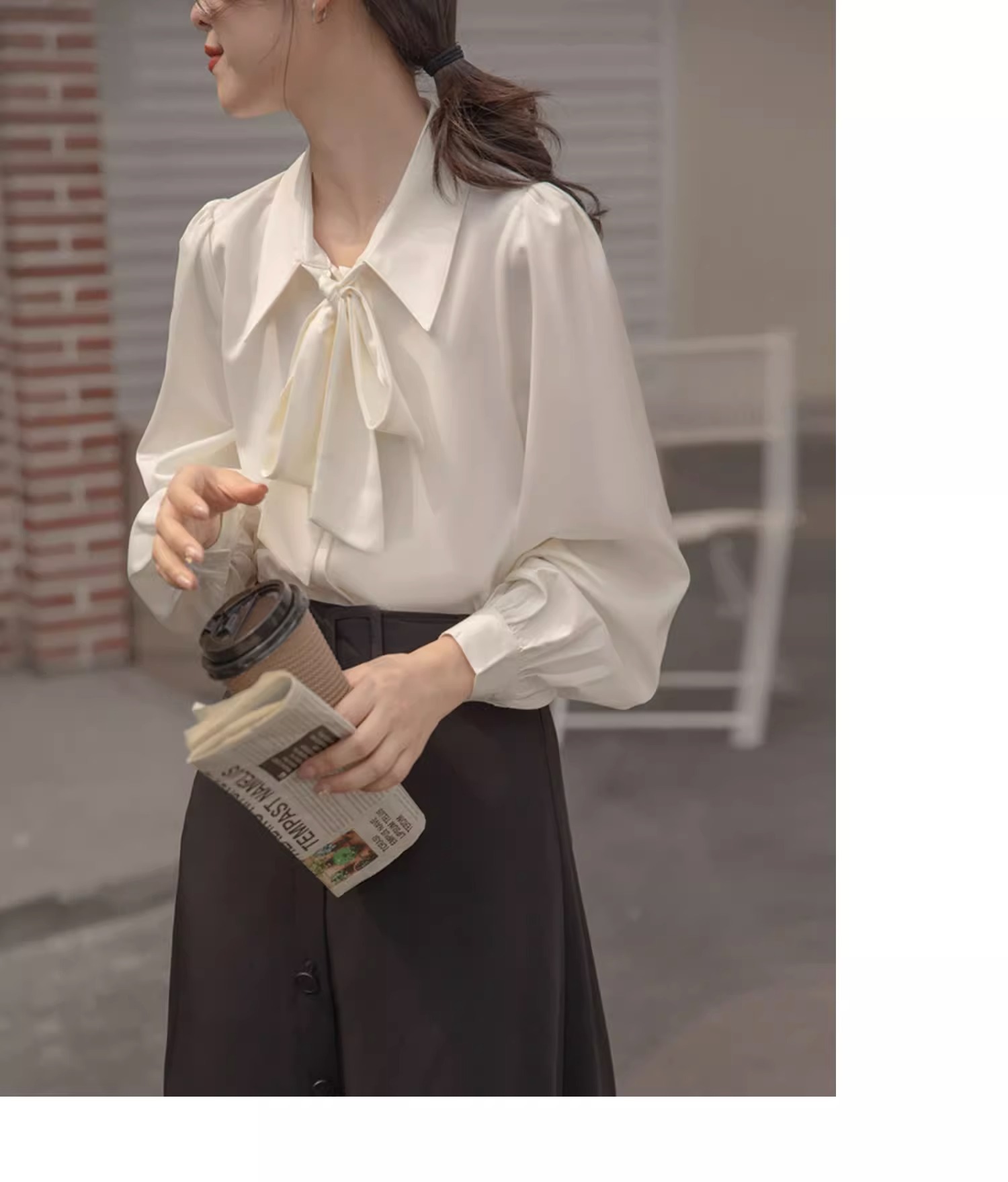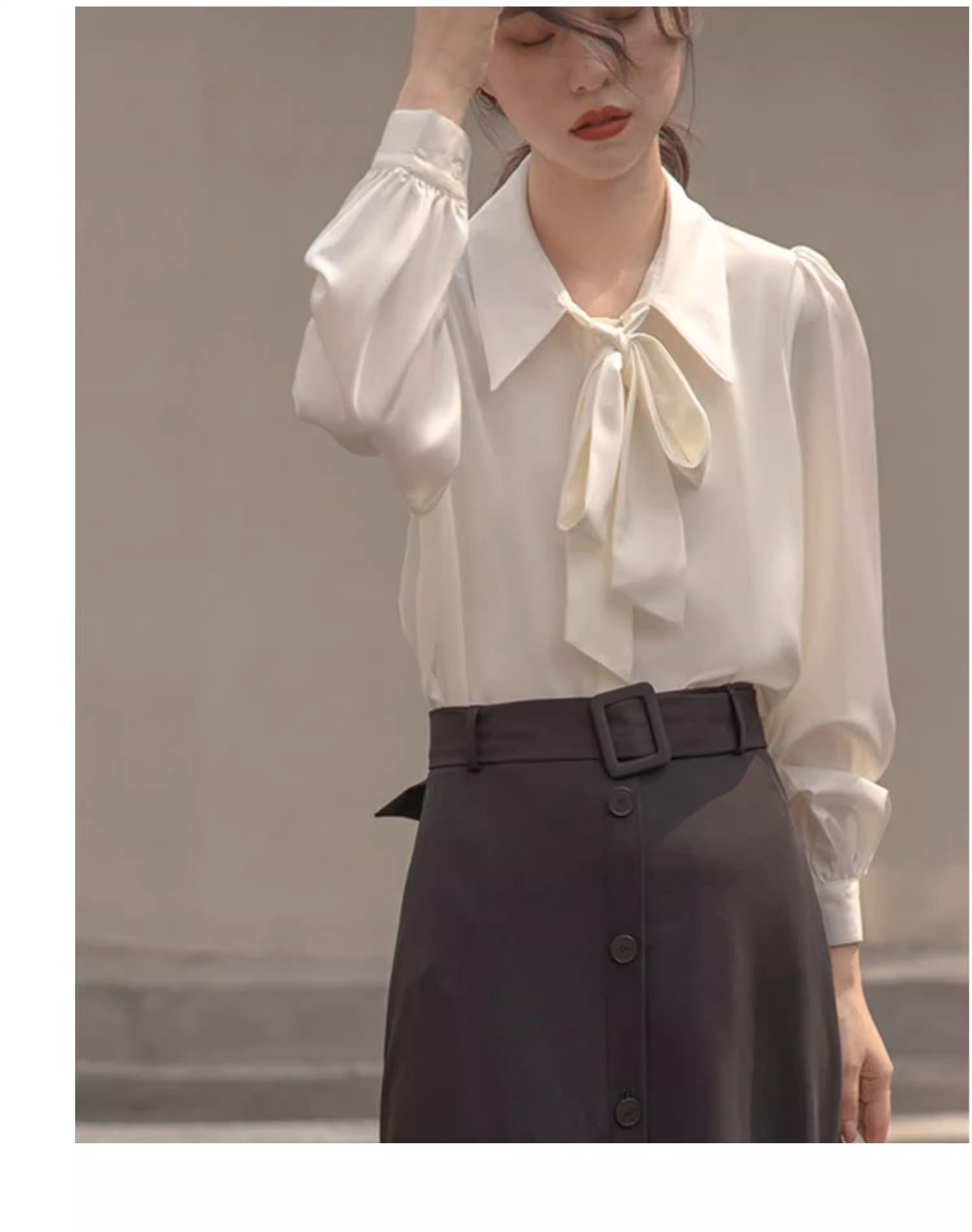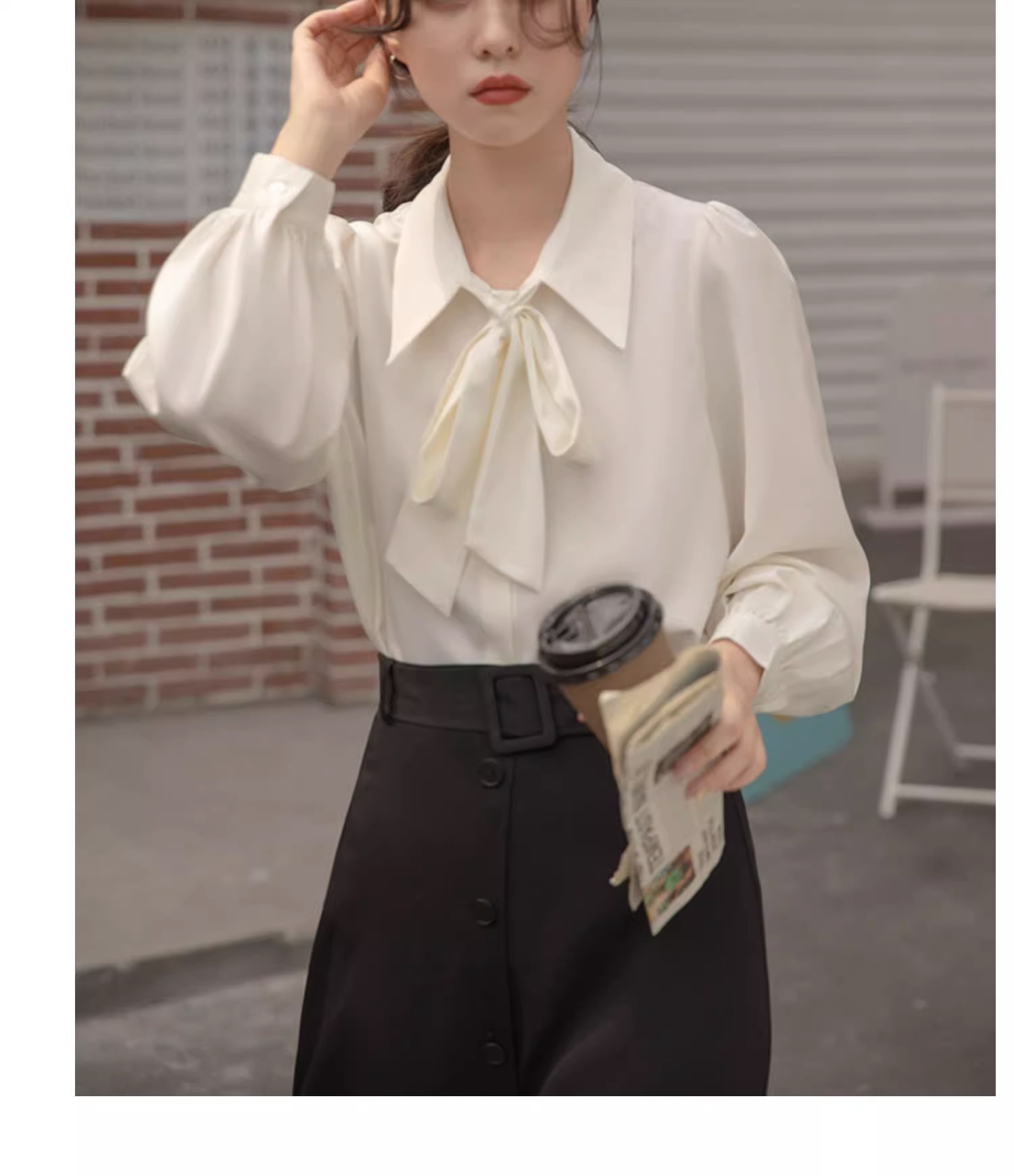 2025 봄, 가을 새로운 스타일 랜턴 슬리브 보우 셔츠 화이트 이너 셔츠 여성 정장 레이스 업 디자인 탑스토어 가기