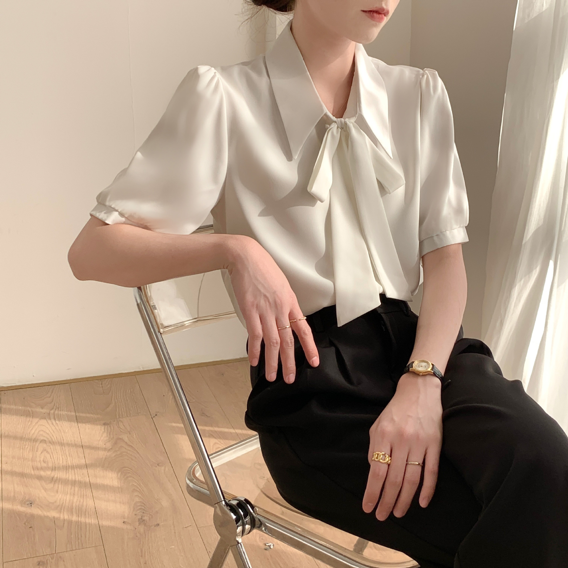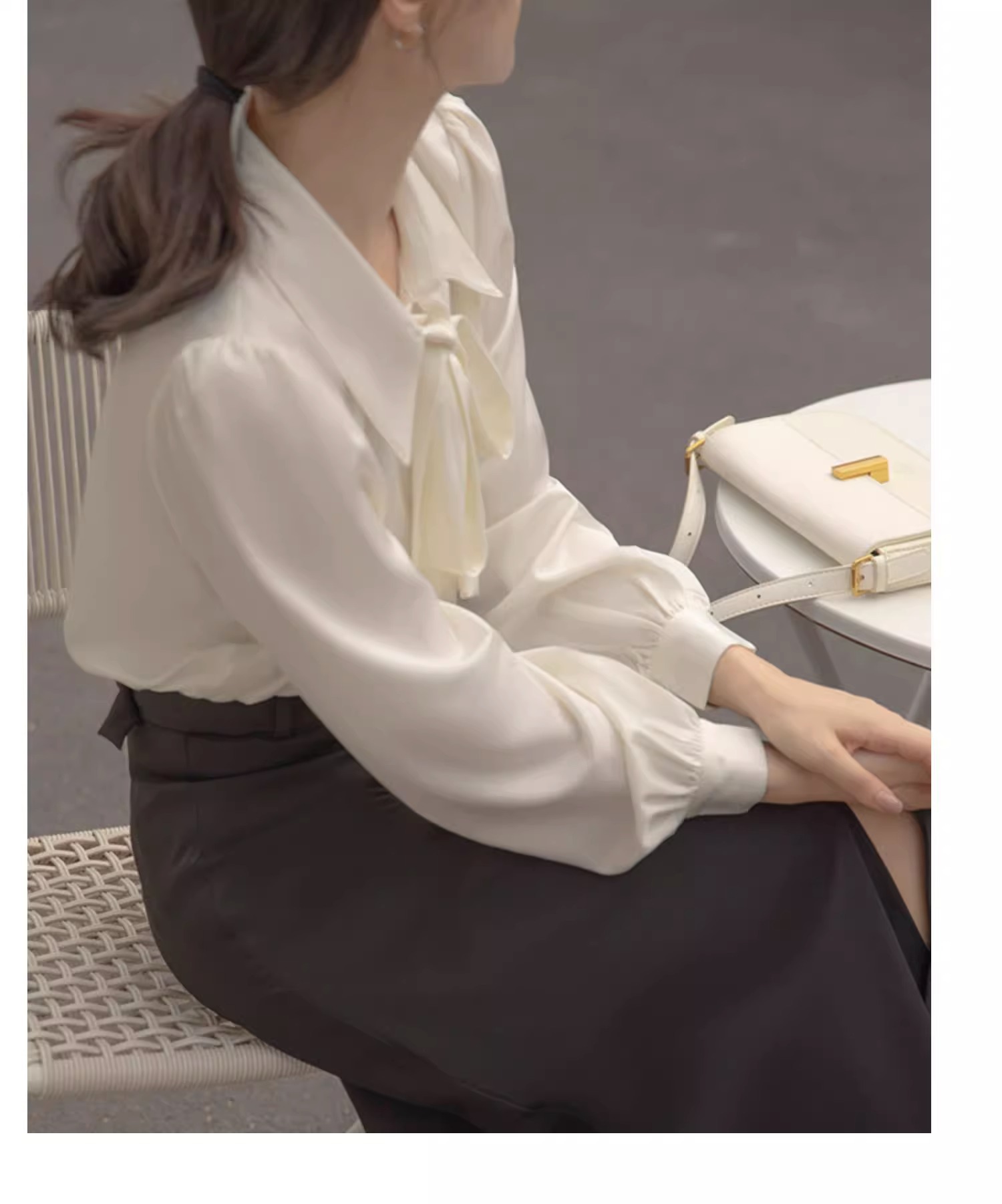 2025 봄, 가을 새로운 스타일 랜턴 슬리브 보우 셔츠 화이트 이너 셔츠 여성 정장 레이스 업 디자인 탑