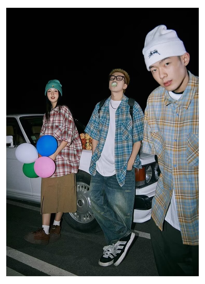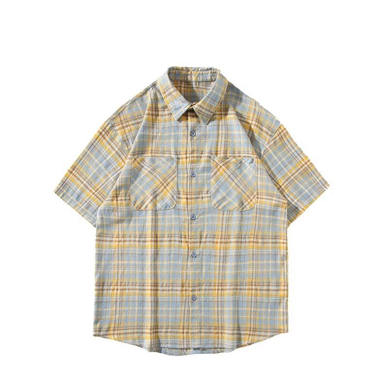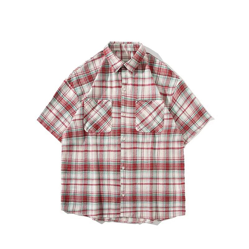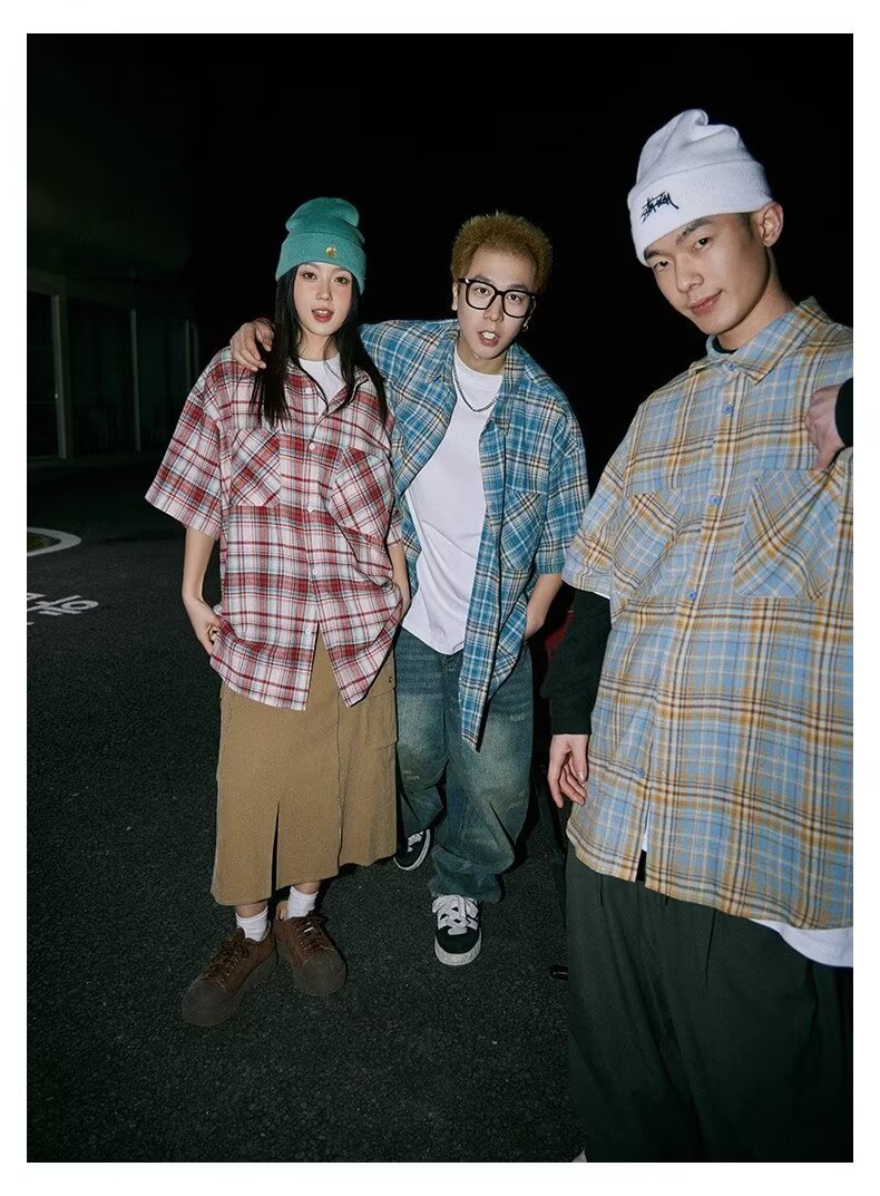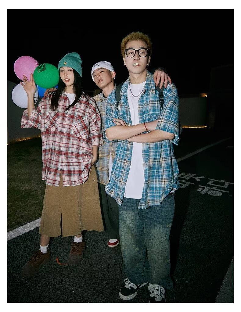 여름 일본식 반팔 체크 셔츠 남성용 트렌디 브랜드 느슨한 반소매 셔츠 올매치 커플의 셔츠 남자 2024스토어 가기